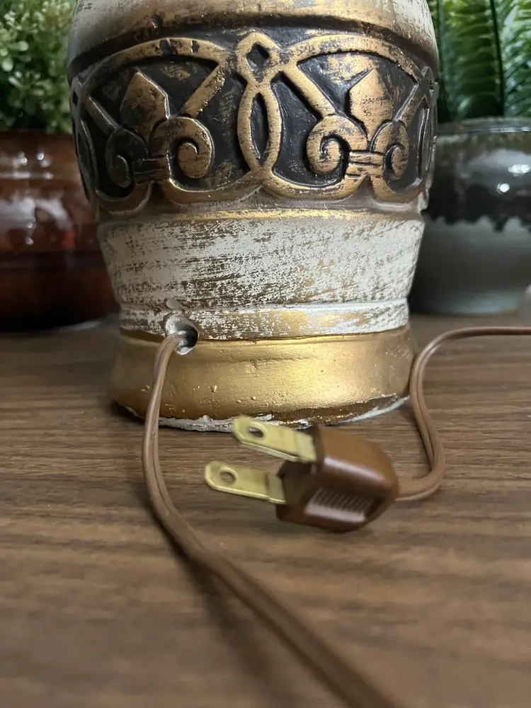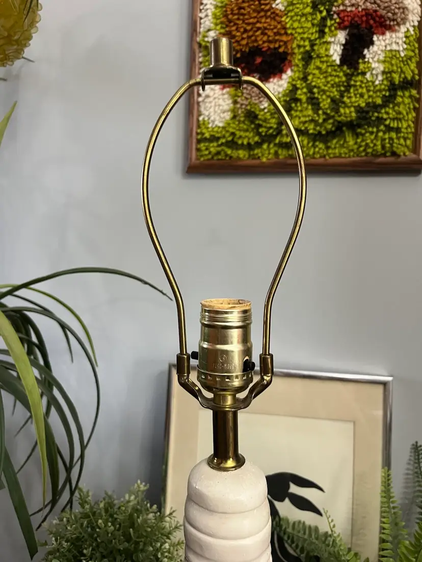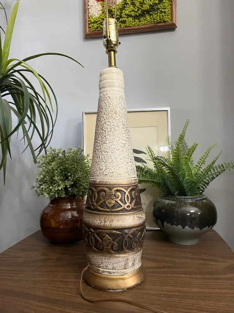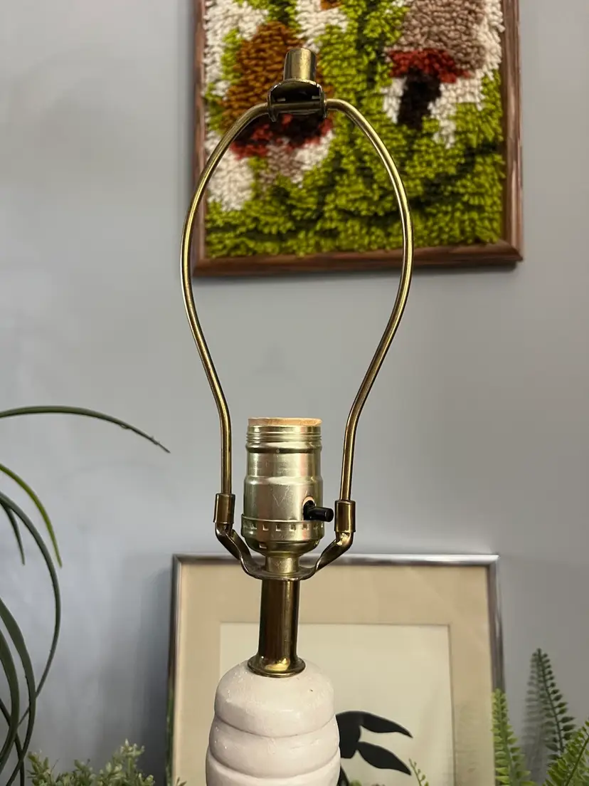 Good preowned working condition. Some light wear across the lamp as shown including some very small minor chips. Please closely review photos for details. Measures approximately 27.5” tall including the harp. Message me with any questions.
