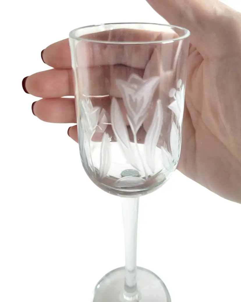 This mid-century decanter and glass set by Toscany exudes elegance with its etched tulip design and handcrafted crystal. A timeless addition for collectors.