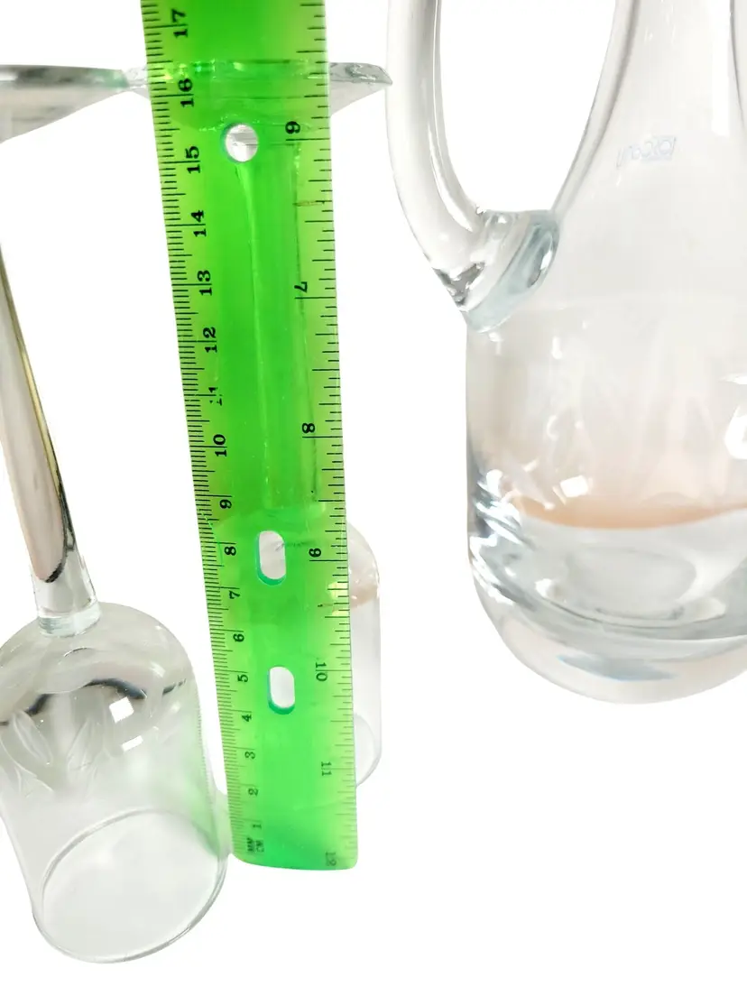 • Includes decanter with stopper and 4 matching glasses • Hand-etched tulip design • Decanter height = 11.5 inches • Glass diameter = 1.5 inches • Hand blown crystal crafted in Romania