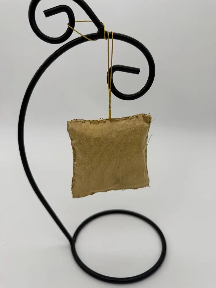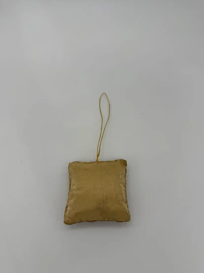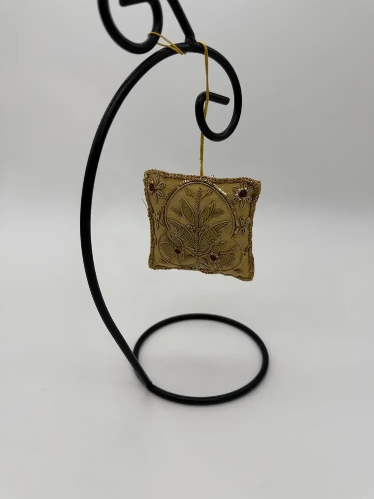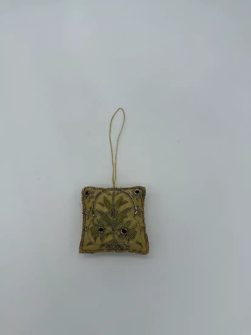 This vintage mid-century Victorian hand-embroidered Zardozi ornament features intricate beading and a unique OOAK design. Made in India, this square-shaped ornament showcases traditional Zardozi production style with hand embroidery and hand-threaded stitching. The ornament is small in size, measuring 3-1/4” in height and width, and is adorned with a beautiful brocade pattern in beige, metallic, gold, bronze, silver, and red colors. Perfect for Christmas and all occasions, this handmade ornament is a beautiful addition to any vintage or traditional decor collection.
