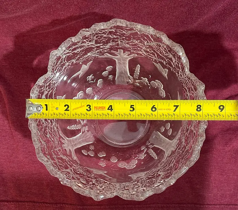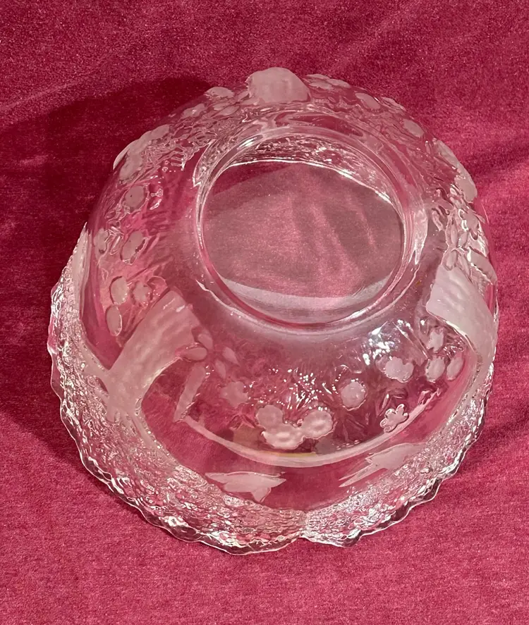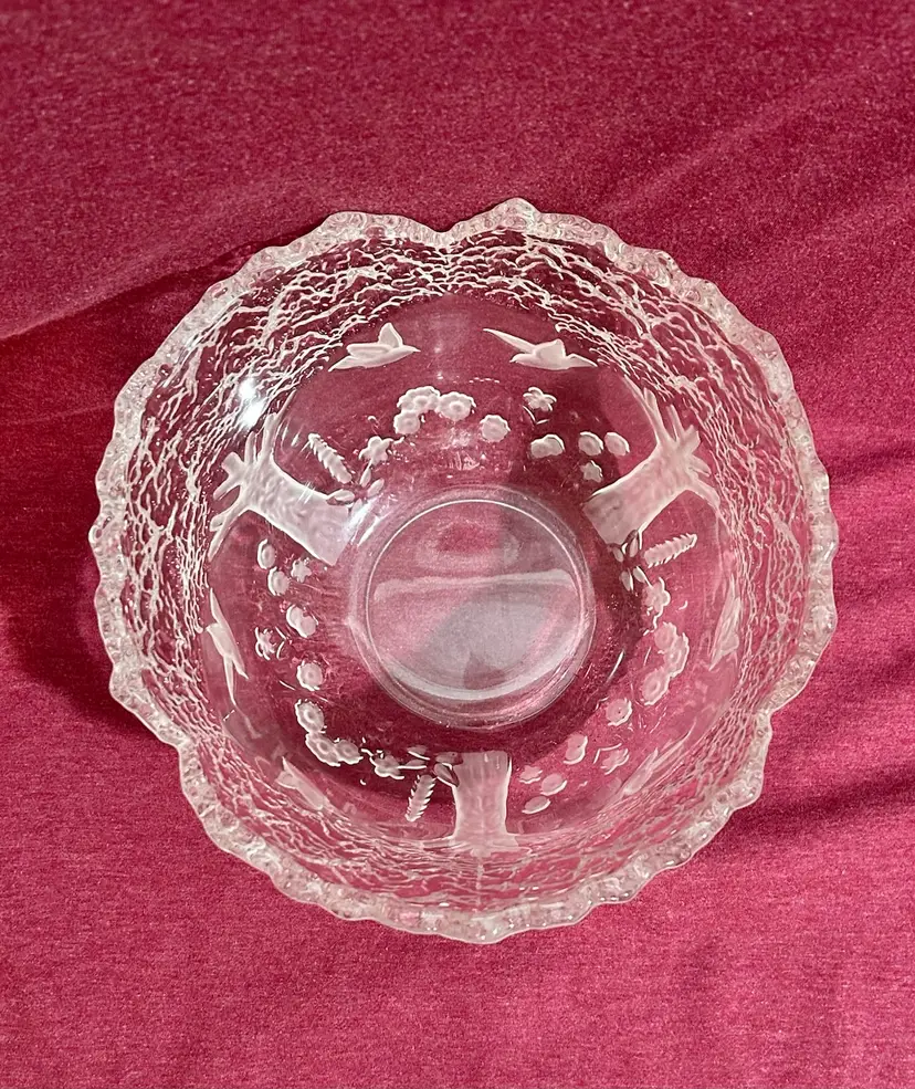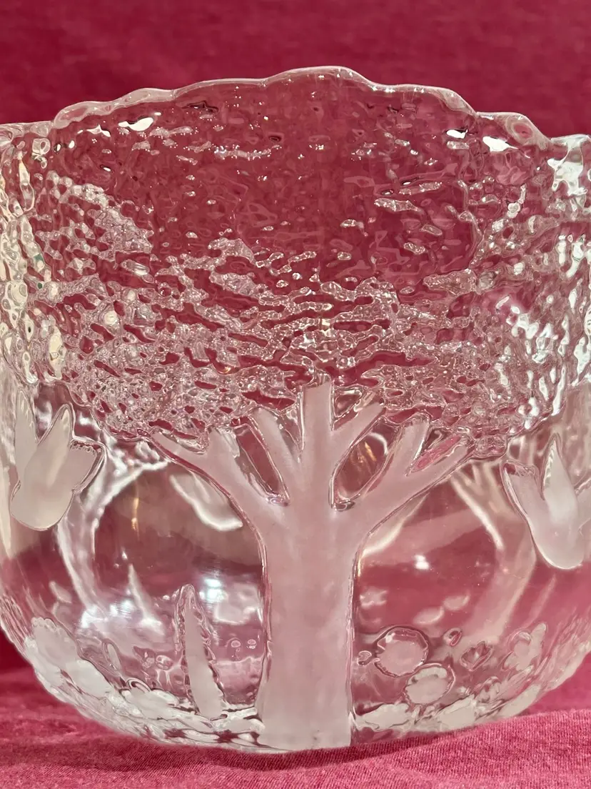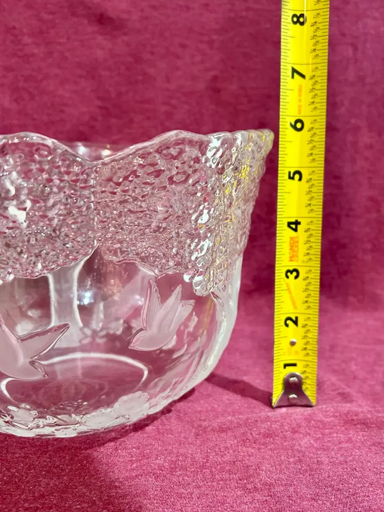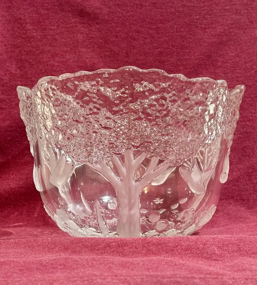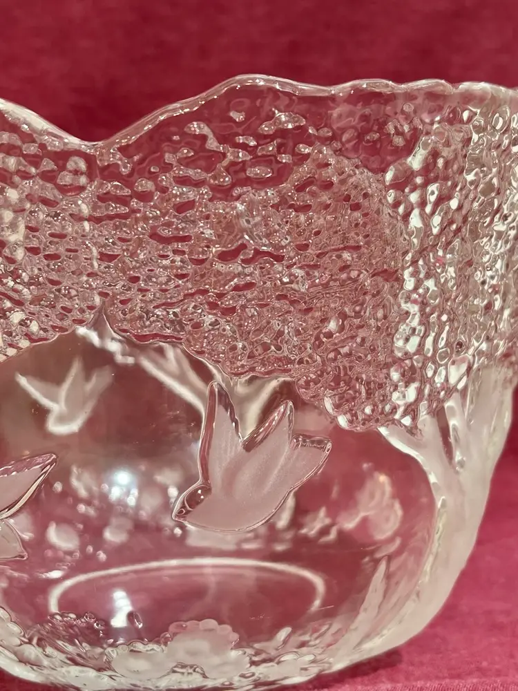 This beautiful crystal piece offers endless imaginative uses. Use it as a planter for small succulents, a stylish potpourri holder, a centerpiece filled with seasonal décor, or even a decorative accent on a coffee table. Its versatility makes it both functional and charming in any room. Features are frosted and clear embossed (raised) images of birds (doves), trees, and flowers, with a scalloped rim formed by the treetops. 1980’s Mikasa Lead Crystal Bowl, made in West Germany. 8” Diameter x 6.5” Tall *browse my collection of other vtg crystal.