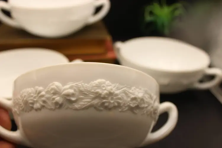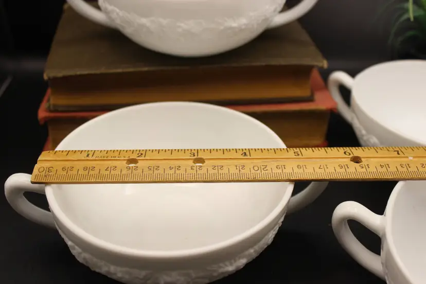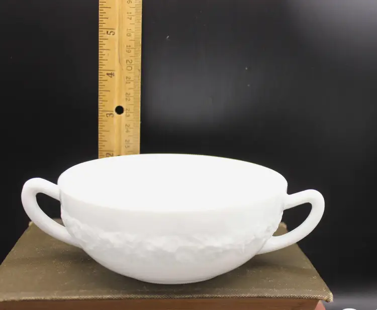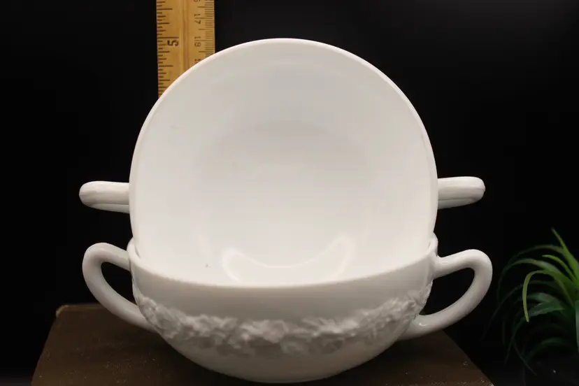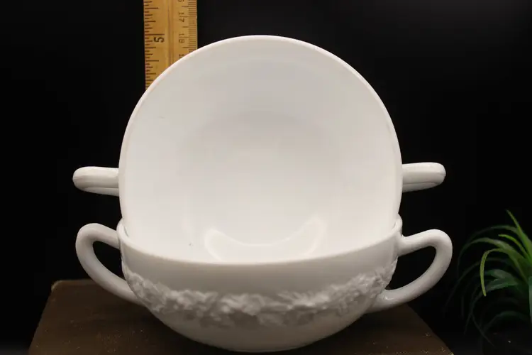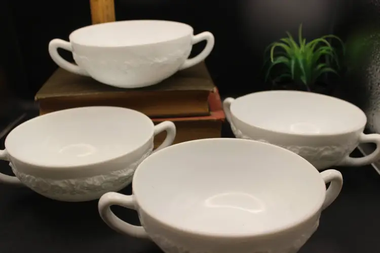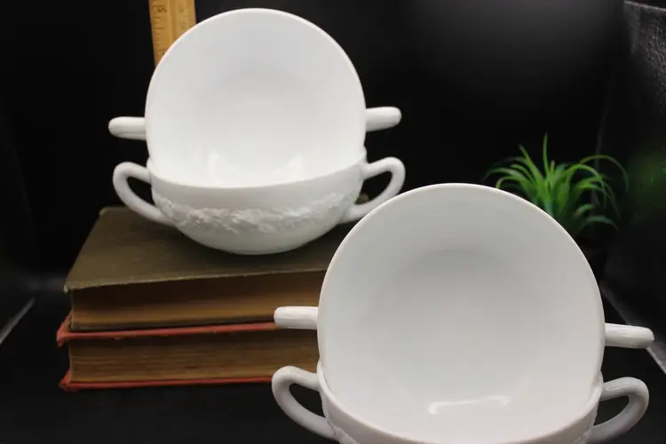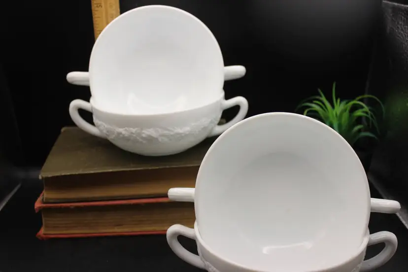 Beautiful Set of 4 vintage White Milk Glass Cream Soup Bowls with double handles. Each bowl features an elegant embossed floral design. Perfect for serving soups, with afternoon tea or at a formal dinner. So Elegant! Believe to be Anchor Hocking Vitrock Milk Glass. Excellent condition with no chips or cracks. These do not stack but can be displayed as in photos (one inside the other) Add a touch of vintage charm to your dining experience! Price includes all 4 bowls!