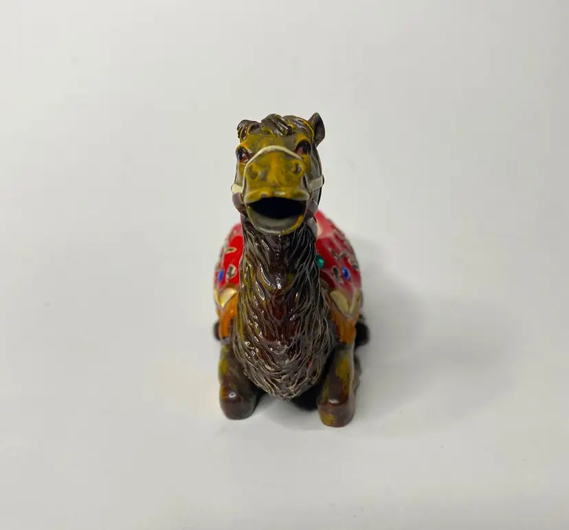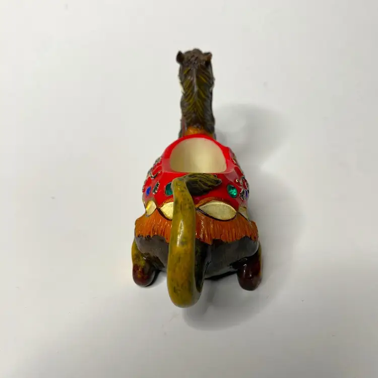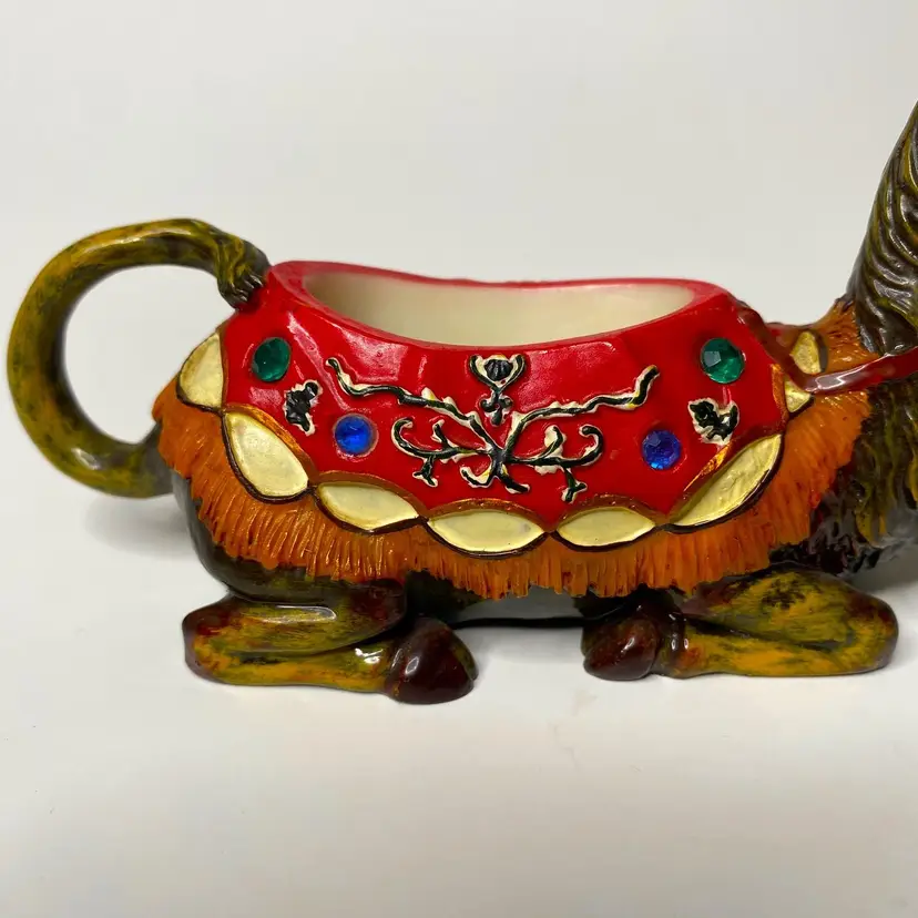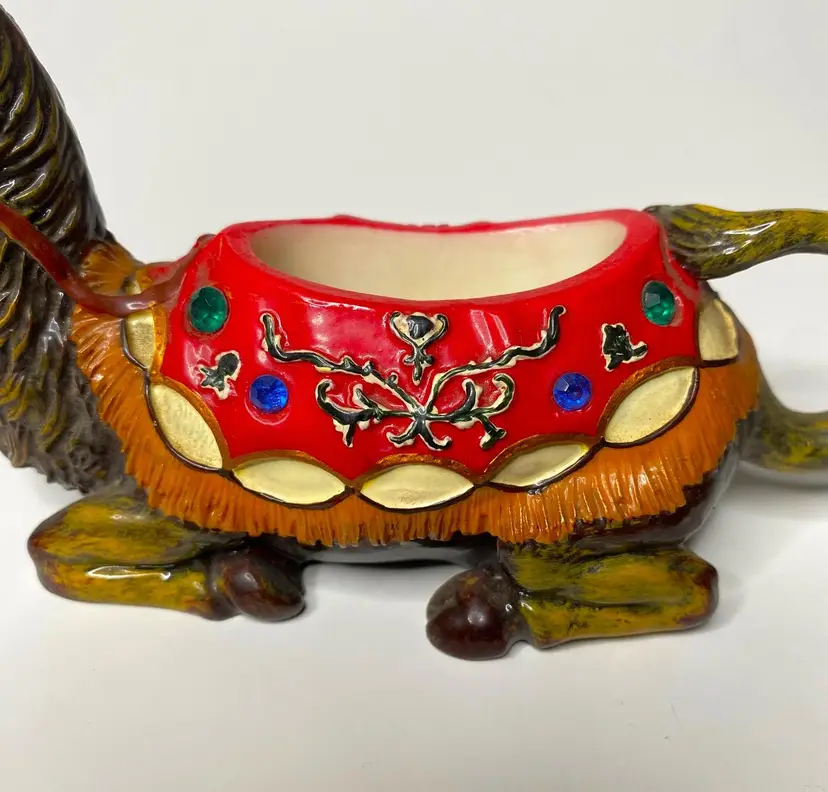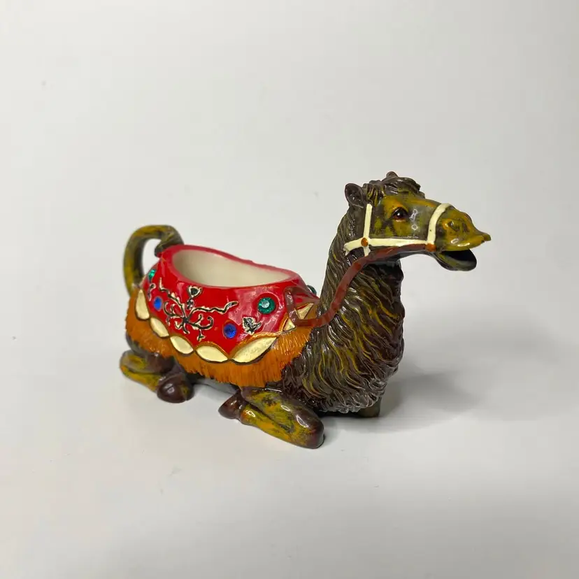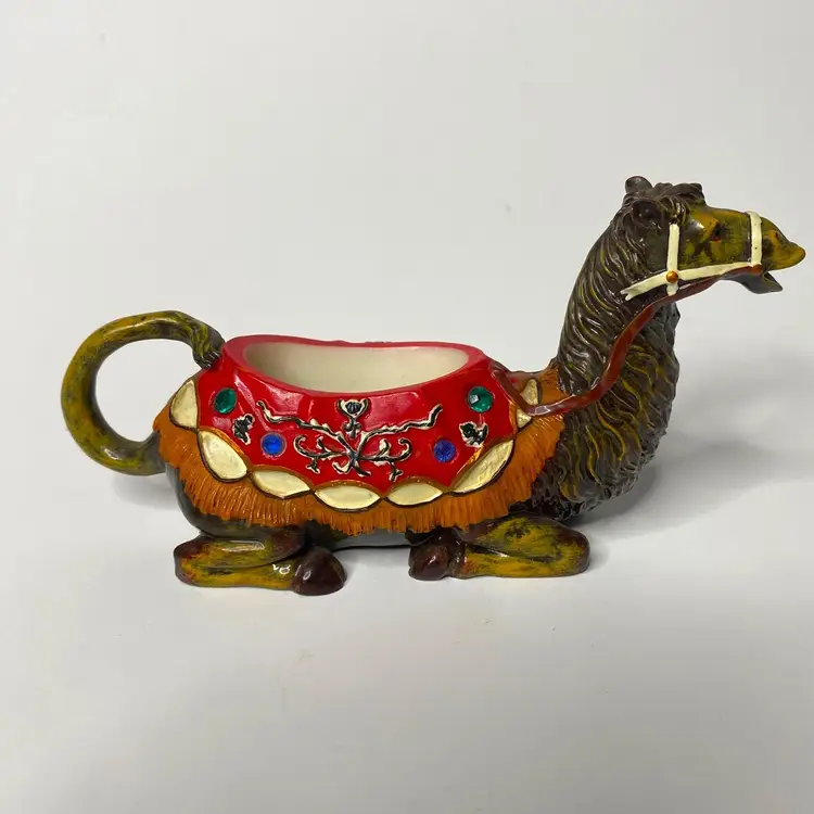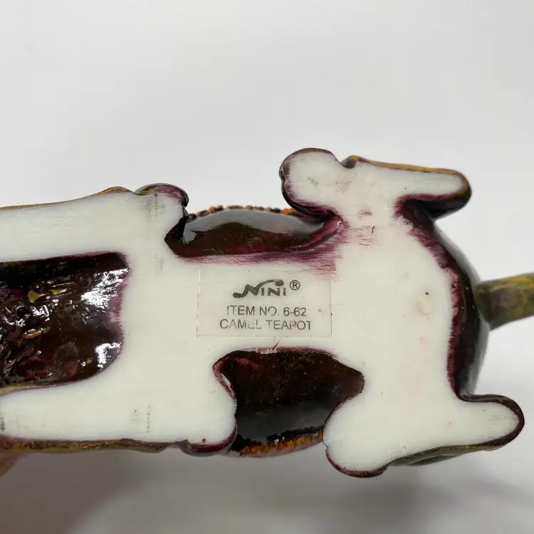 Vintage Mini Collection miniature hand-painted camel teapot (Item# 6-62). The material is resin. In very good pre-owned condition. No chips or dings. The top lid is not available. Great addition to any home decor. 6" from head to tail x 3" tall x 2" wide.