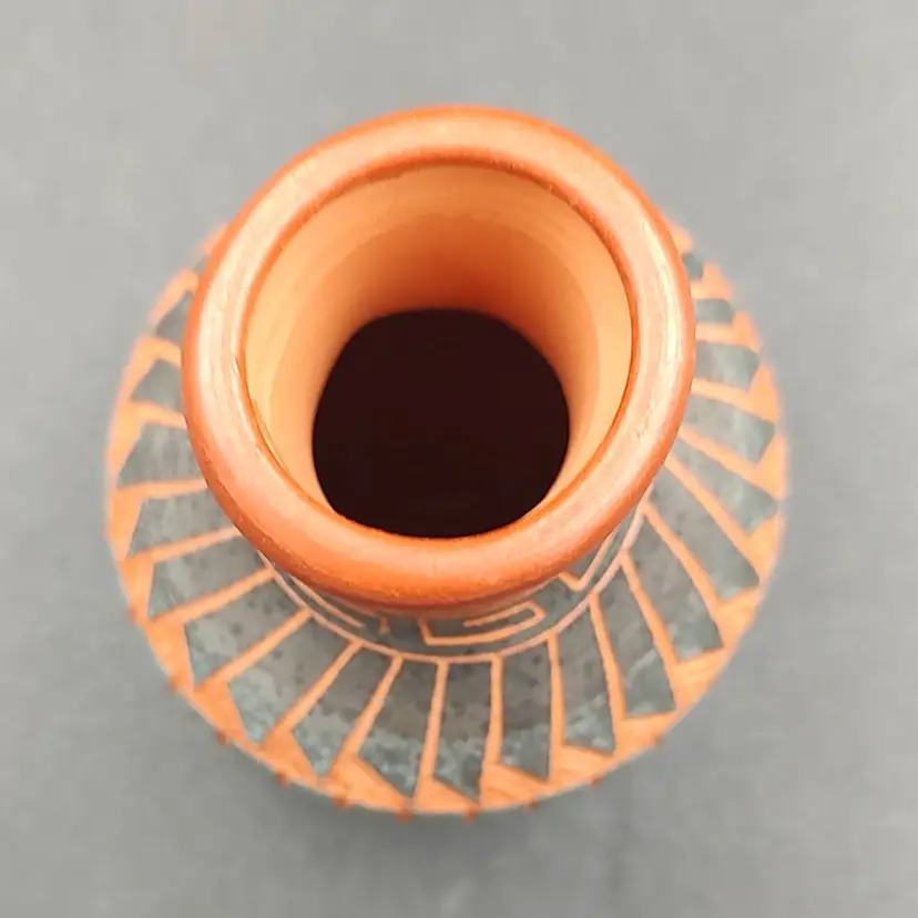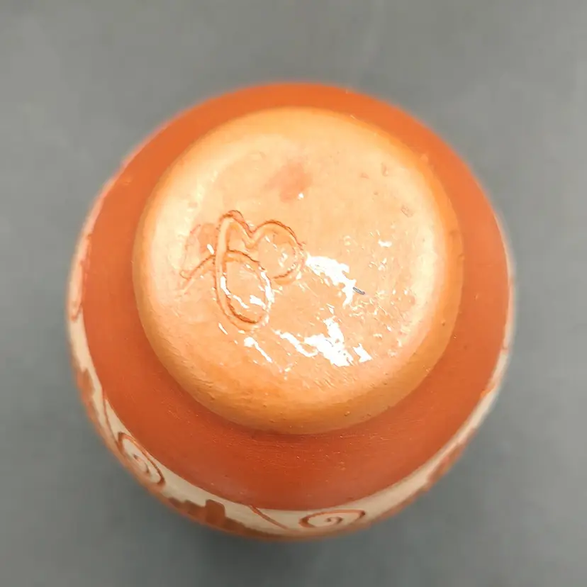 Vintage 1983 Miniature Navajo Etched Pottery Clay Vase Hand Painted. Height 3.5" x diameter 2.5". Made in the USA