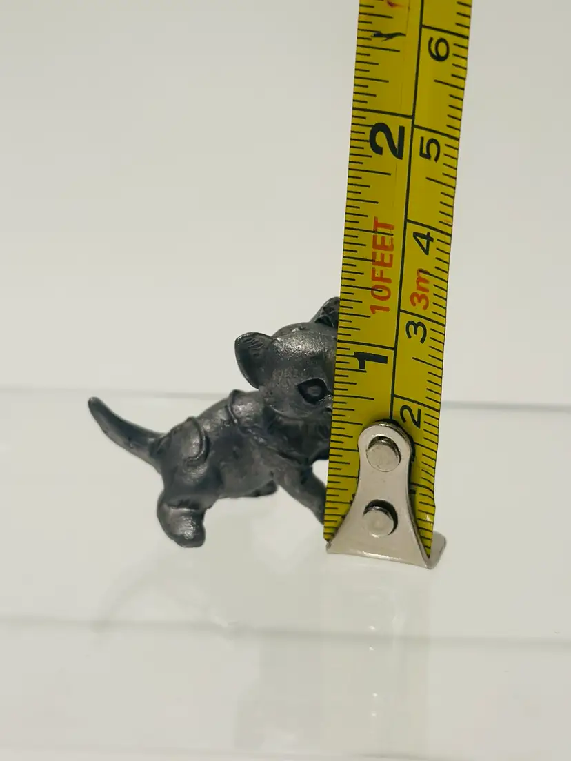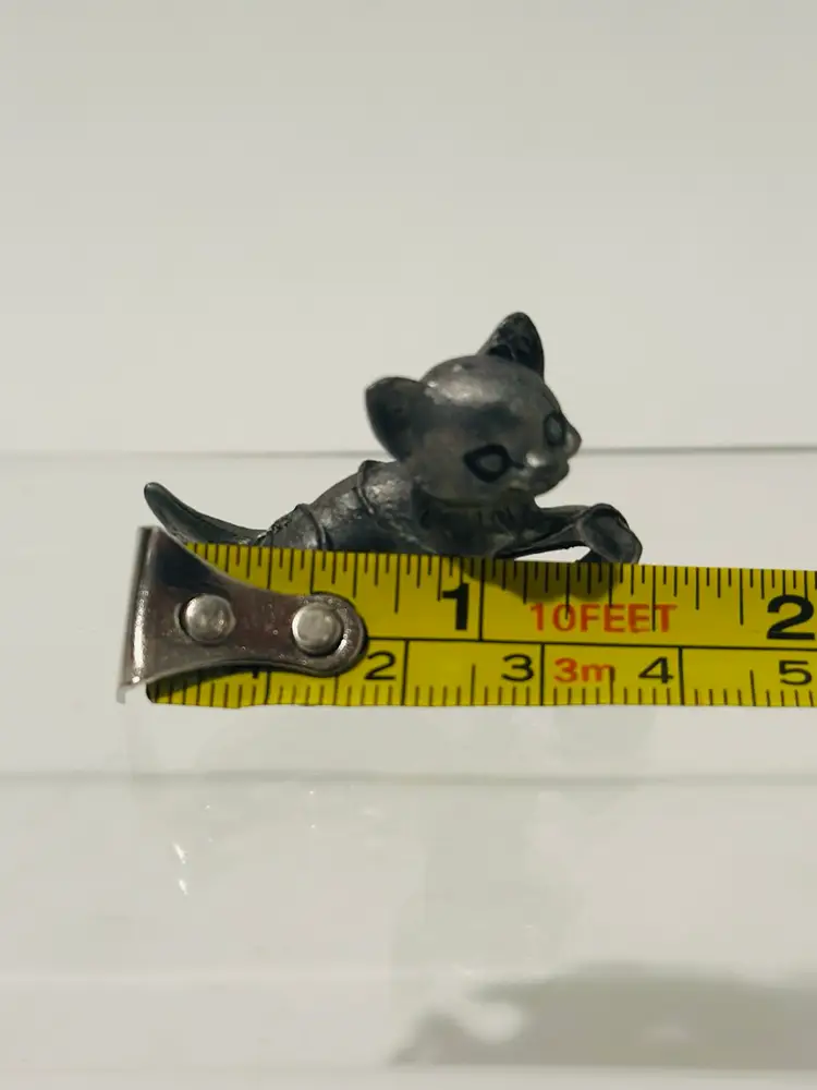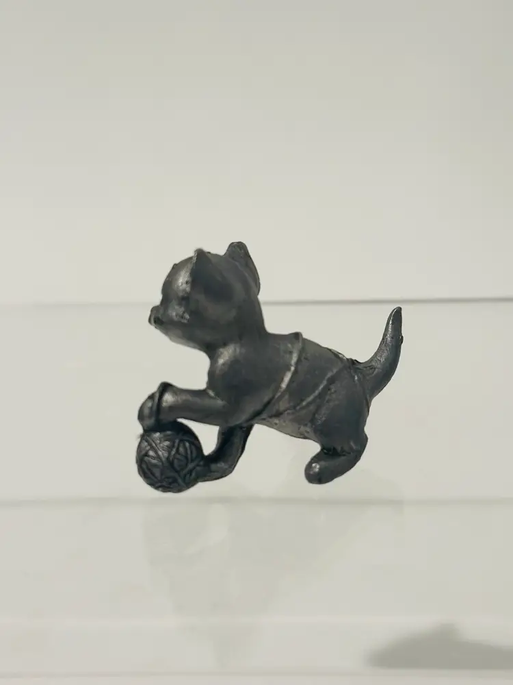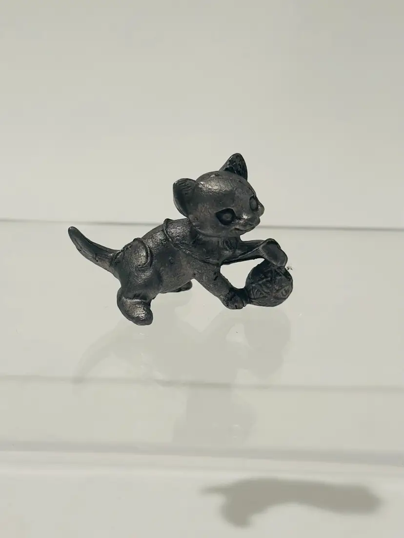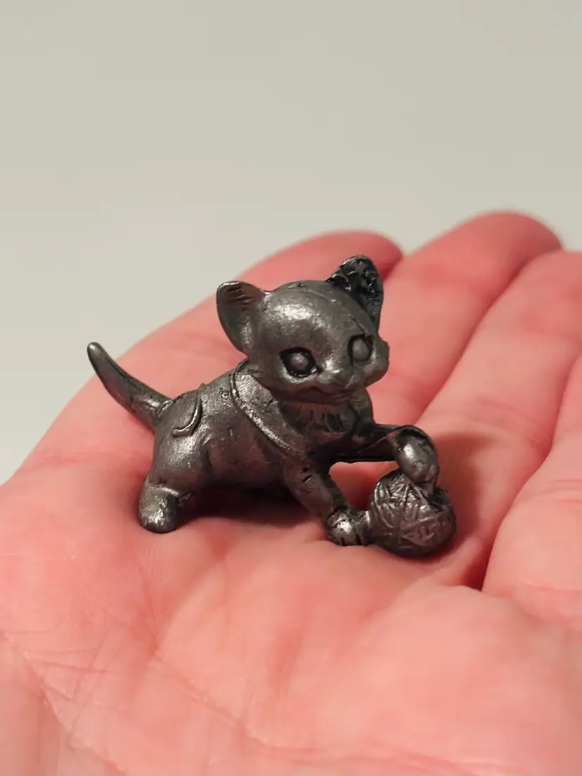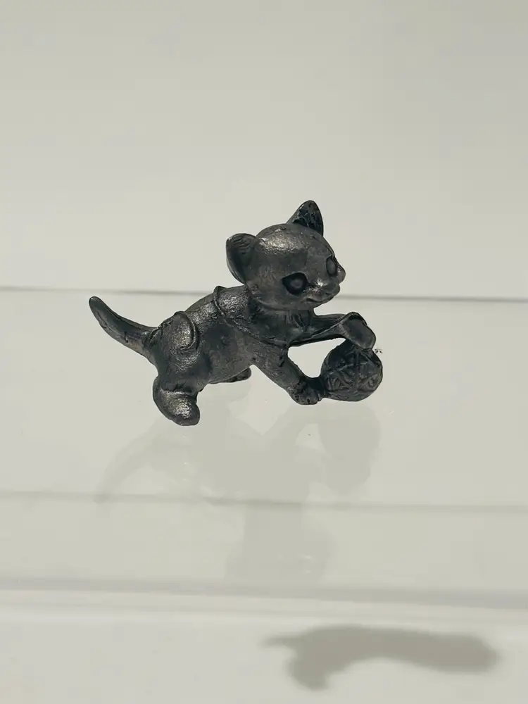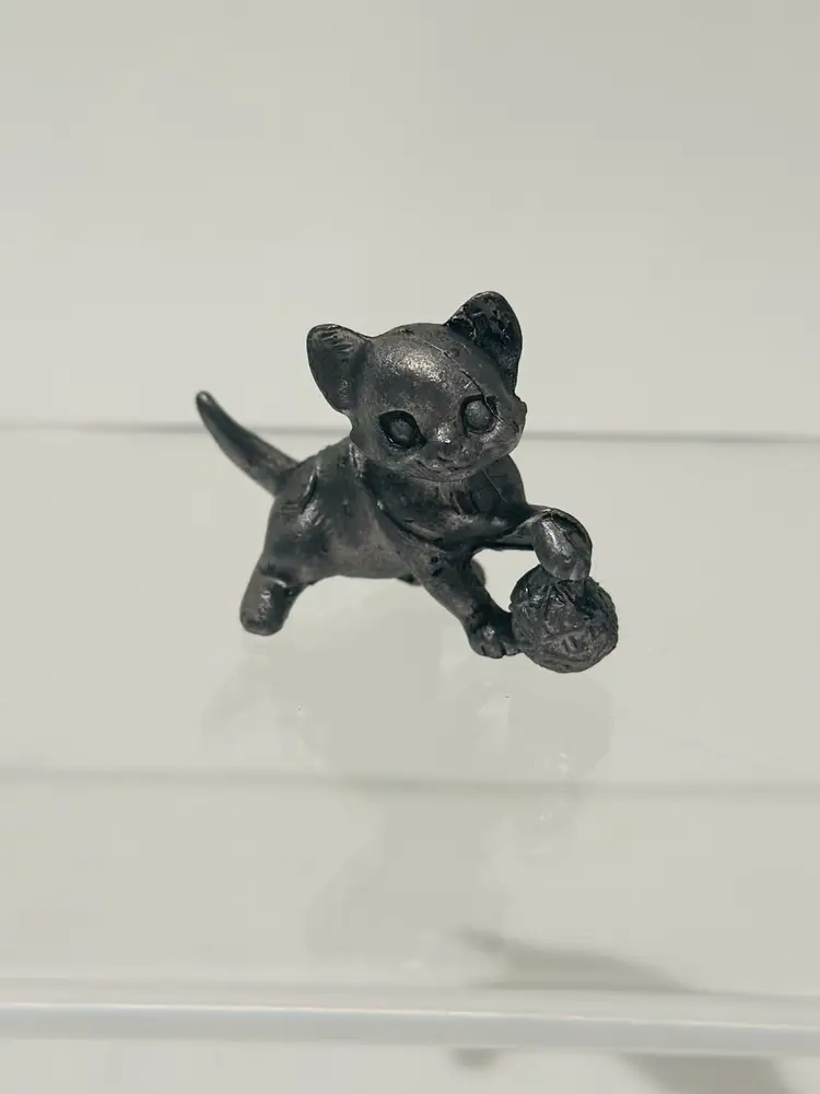 This vintage miniature pewter cat figurine from Spoontiques is highly detailed with a playful kitten holding a yarn ball. Made of high quality pewter.