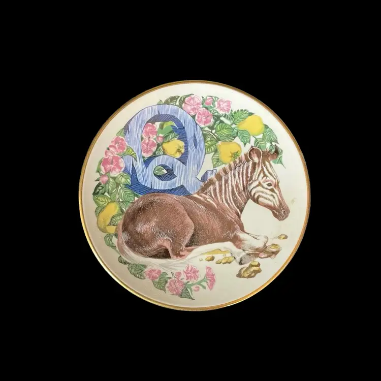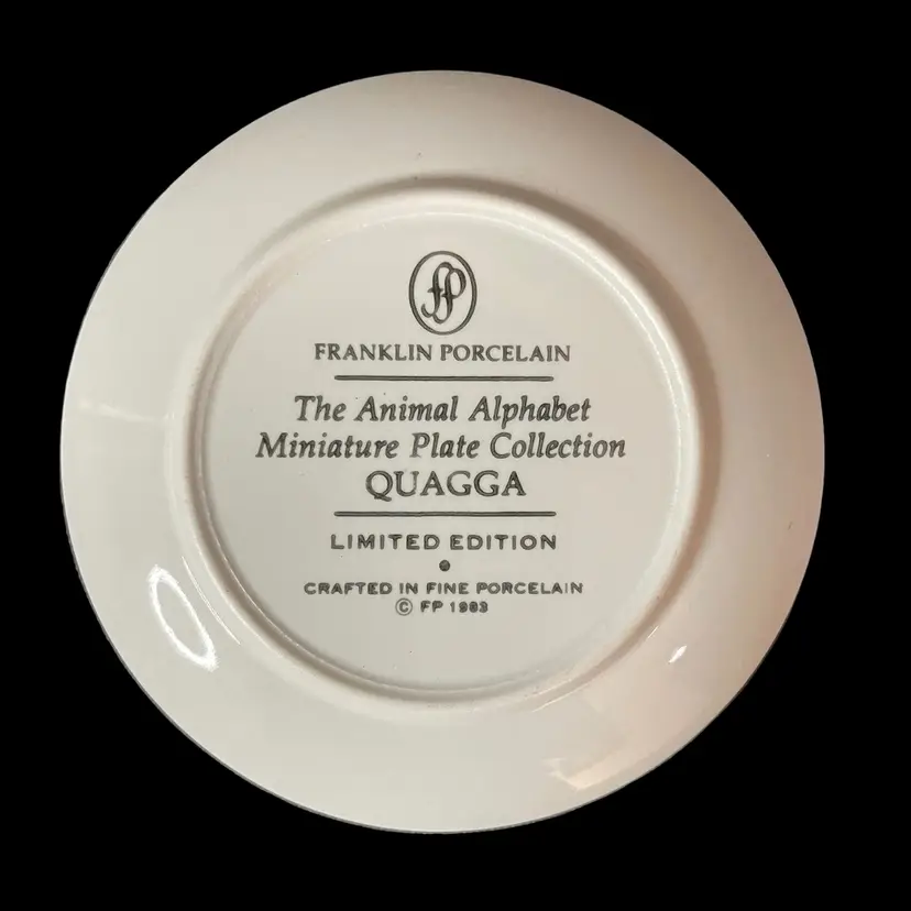This is a vintage 1983 Limited Edition Franklin Porcelain The Animal Alphabet miniature plate. It features a quagga among flowers along with the letter Q. Measures approximately 3" in diameter. No chips or cracks.
