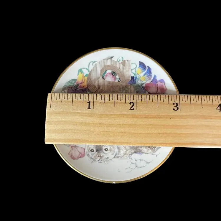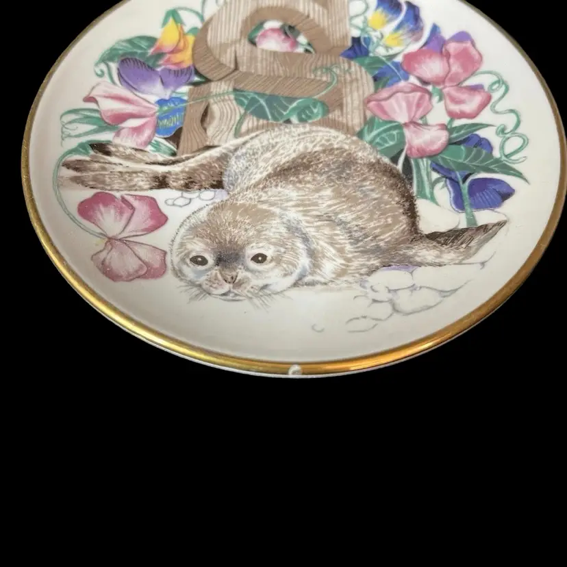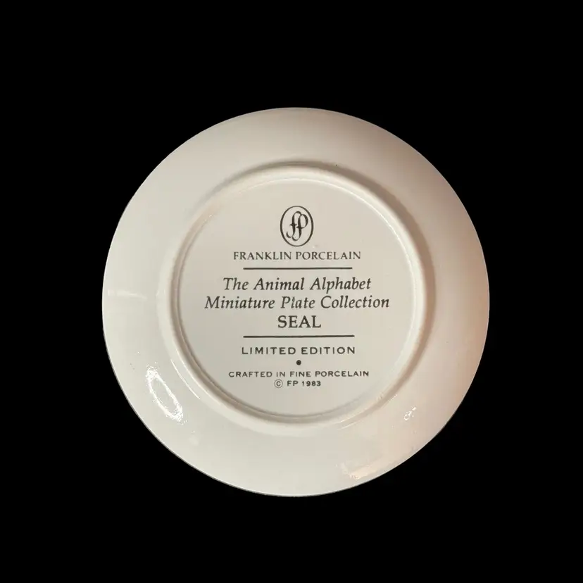 This is a vintage 1983 Limited Edition Franklin Porcelain The Animal Alphabet miniature plate. It features a seal among flowers along with the letter S. Measures approximately 3" in diameter. No chips or cracks, but there is wear on the gold paint around the rim as shown in picture 3.
