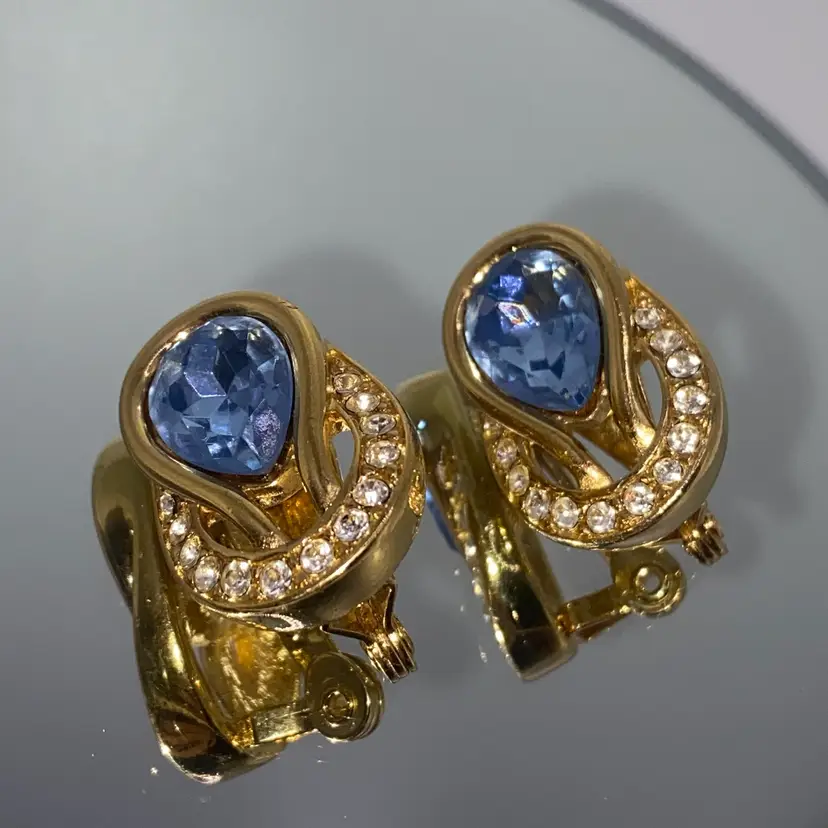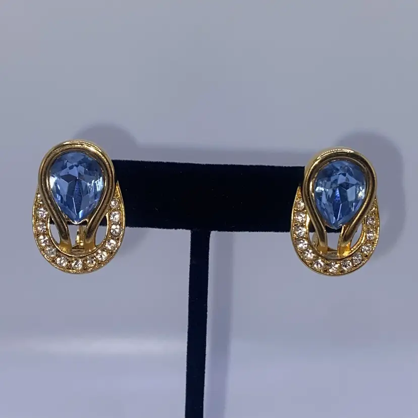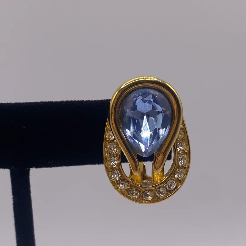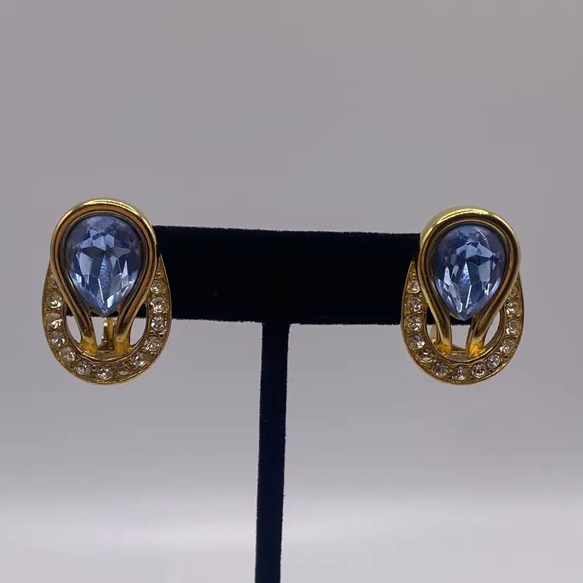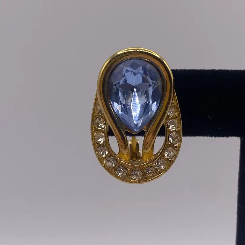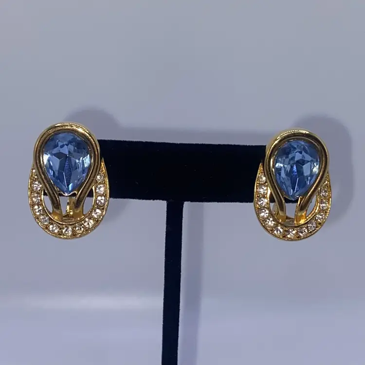 These vintage Monet earrings are a stunning addition to any jewelry collection. The baby blue reverse teardrop and round clear rhinestone design is accented with gold tone metal and a clip-on closure for easy wear. The earrings are signed and have a length of 1 inch, making them perfect for both casual and formal occasions.