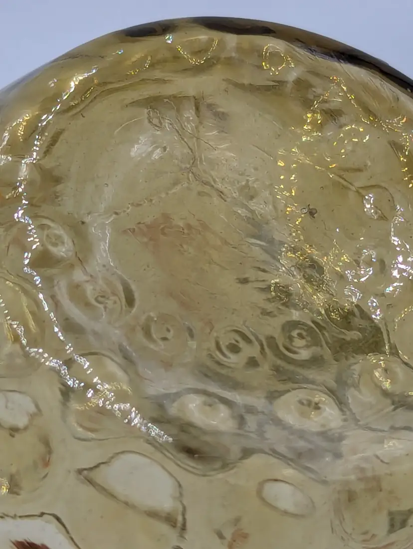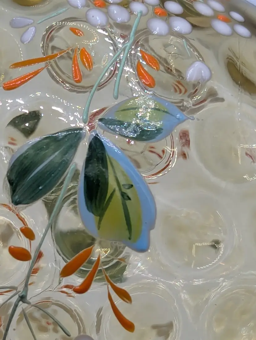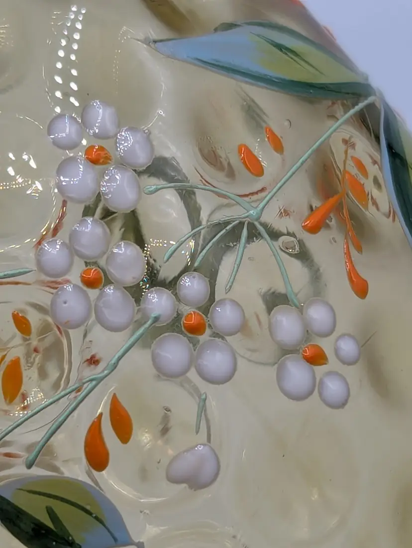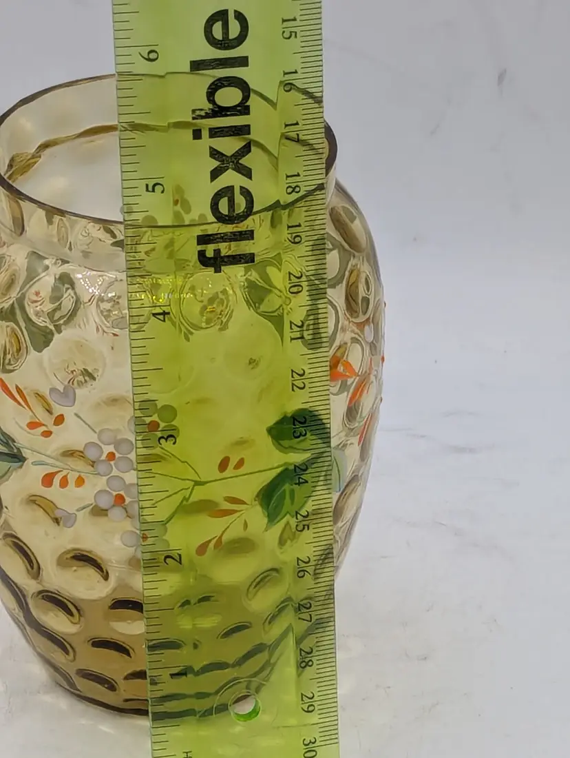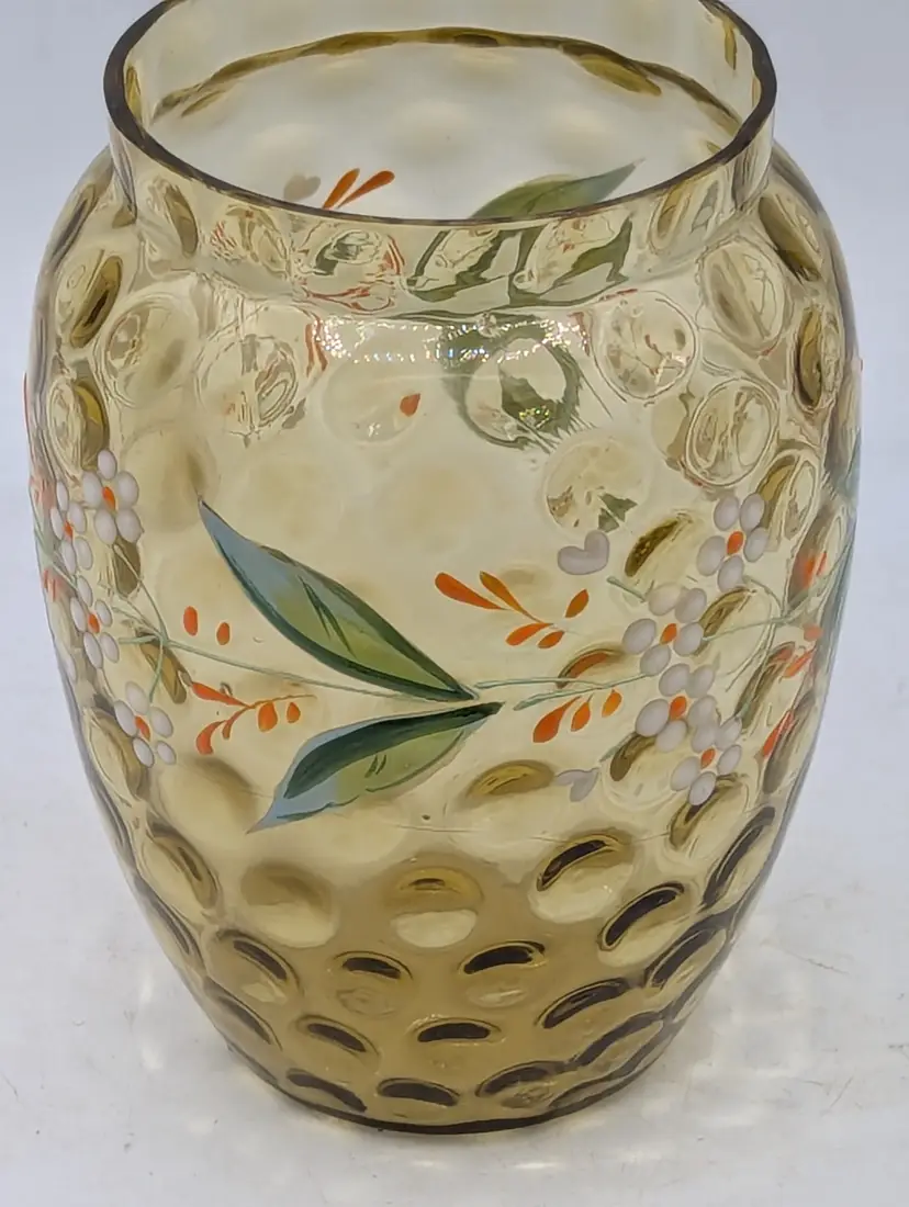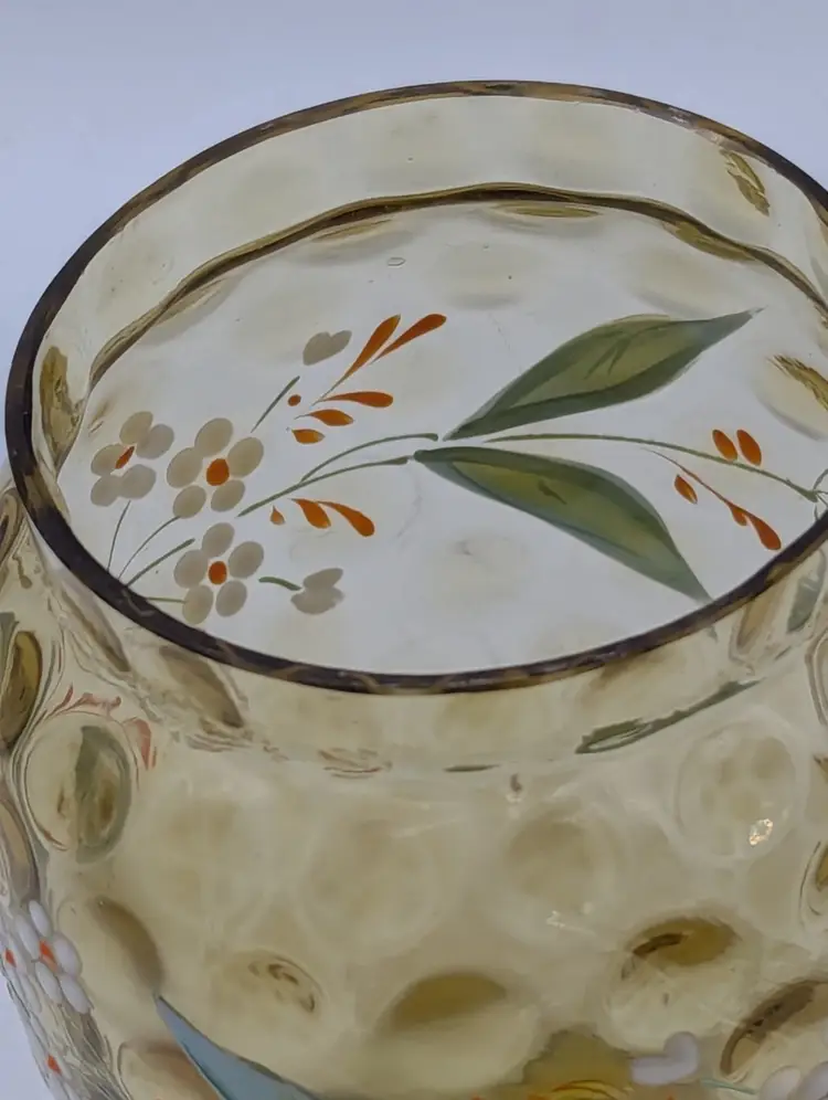 Beautiful vintage Mosser Glass vase in a warm, honey-amber hue. This piece features a classic thumbprint (dot optic) pattern and a charming hand-painted floral design with white and orange petals and delicate green leaves. The ruffled, "handkerchief" style rim and pedestal base make it a perfect example of Ohio art glass craftsmanship. Brand: Mosser Glass Color: Amber / Honey Features: Hand-Painted Enamel, Thumbprint Pattern, Ruffled Rim Condition: Excellent vintage condition. No chips, cracks, or flea bites. The enamel paint is vibrant with no noticeable loss. (Please see photos for details).
