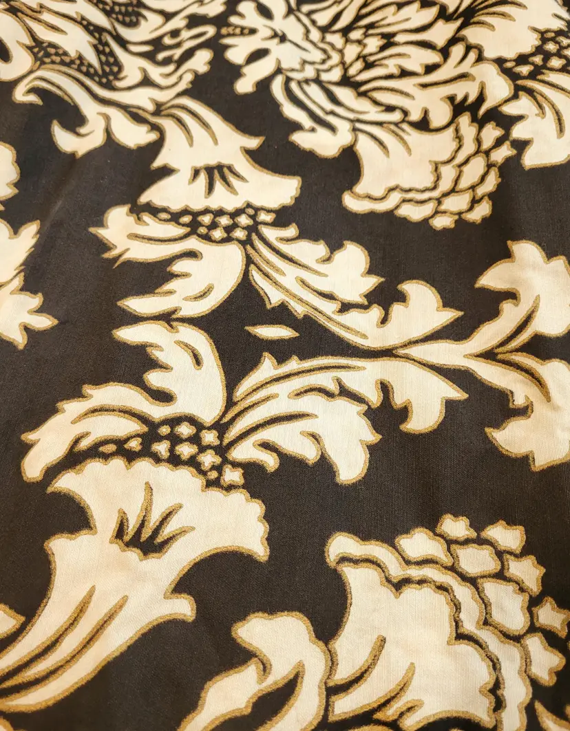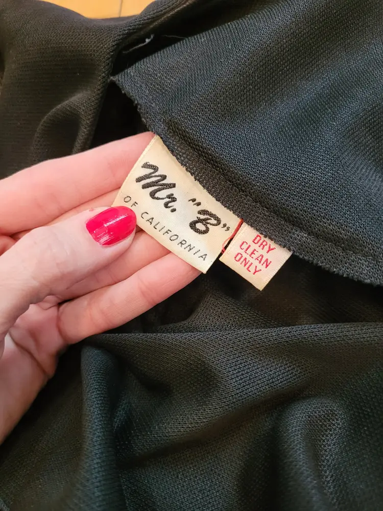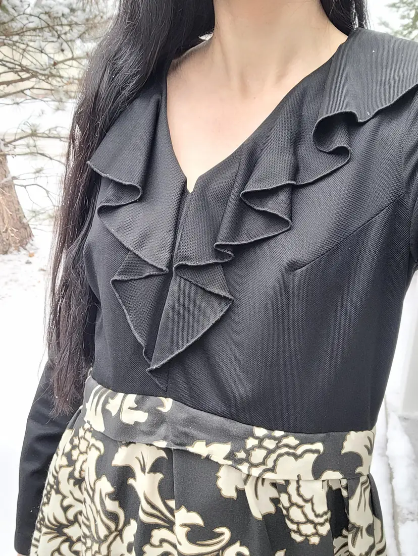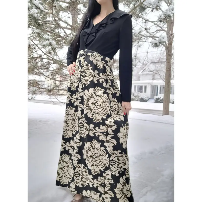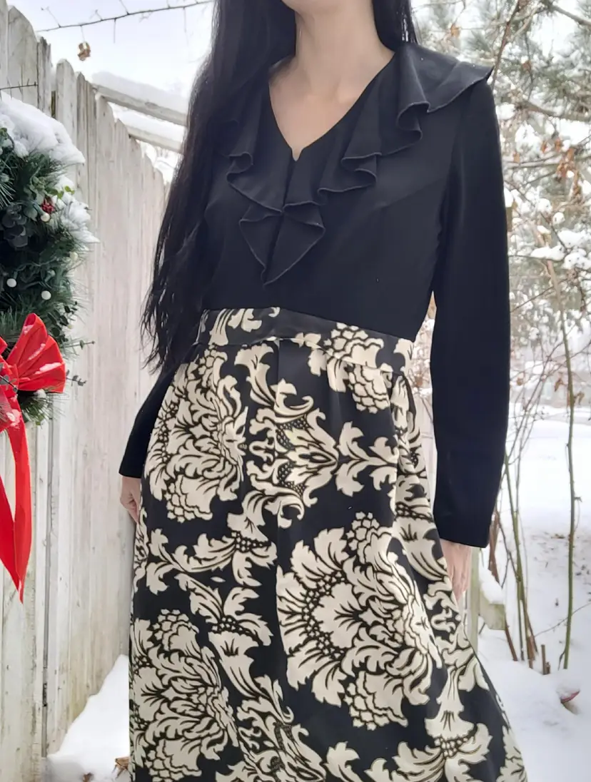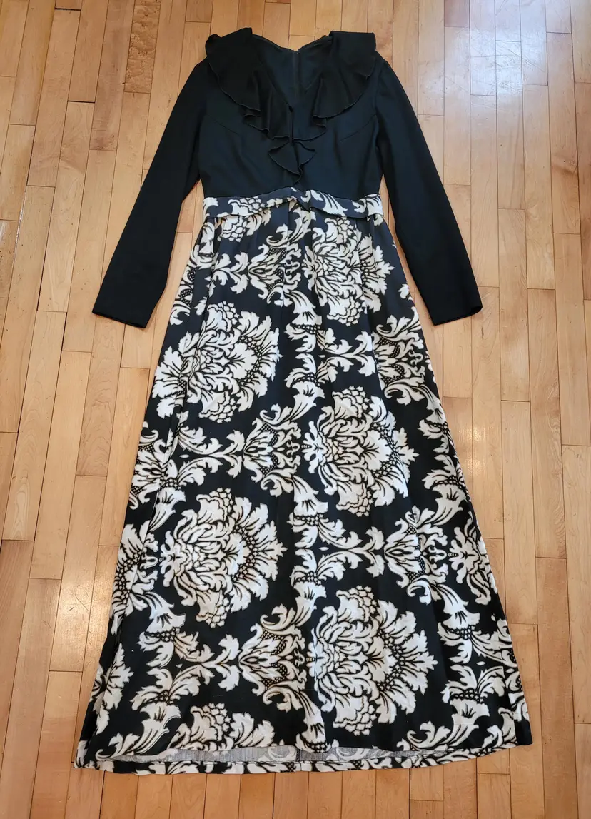 Beautiful 1970s black damask dress with a ruffled neck. This is from an estate and in good condition. The top of the dress seems to be a polyester material and the skirt is a nice thick barkcloth. Model is a modern size small and it seems to fit more like a modern large; please see measurements below to ensure it'll fit you before purchasing.
