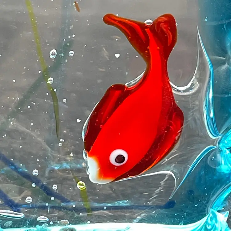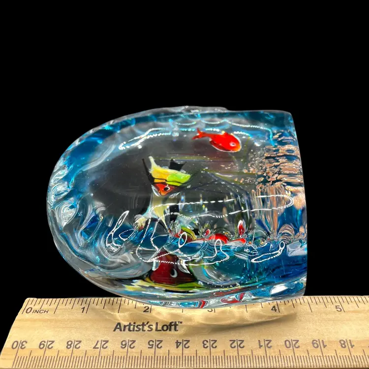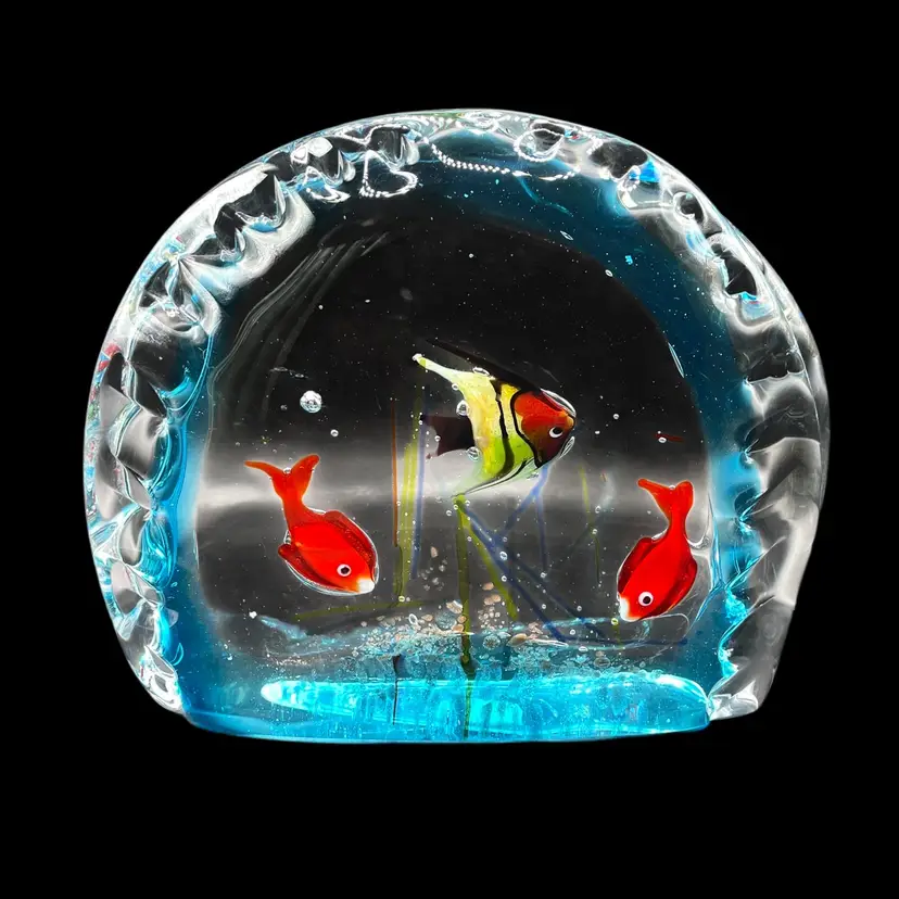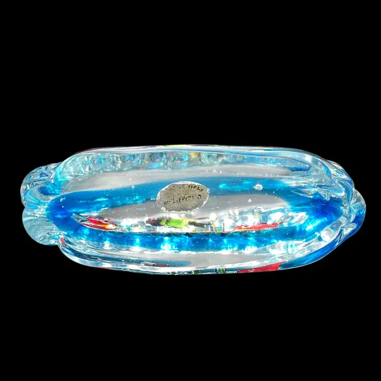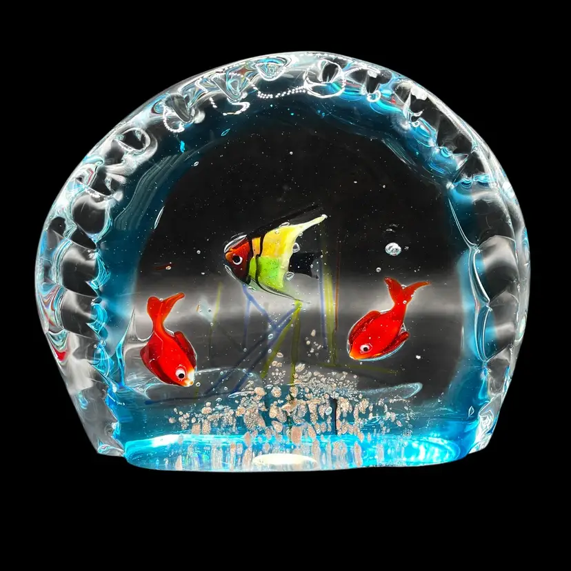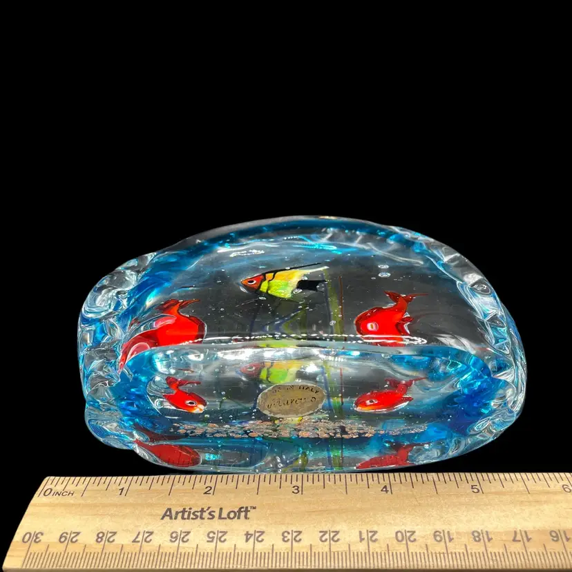 This vintage Murano glass clamshell aquarium features three fish in a multicolor design with aventurine, made by hand in Italy. With its original sticker intact, this unique paperweight adds a touch of elegance and craftsmanship to any collection. The medium size and intricate details make it a standout piece for collectors of decorative glass art.