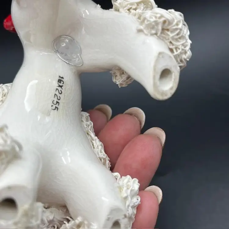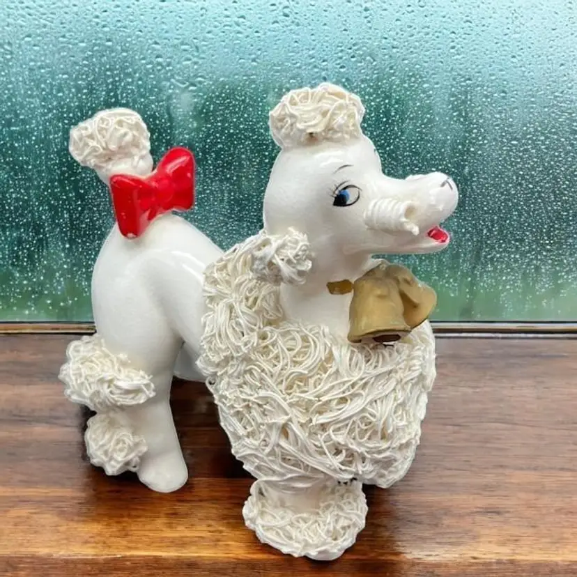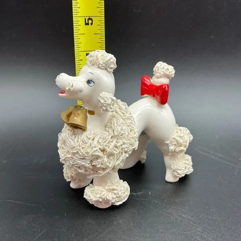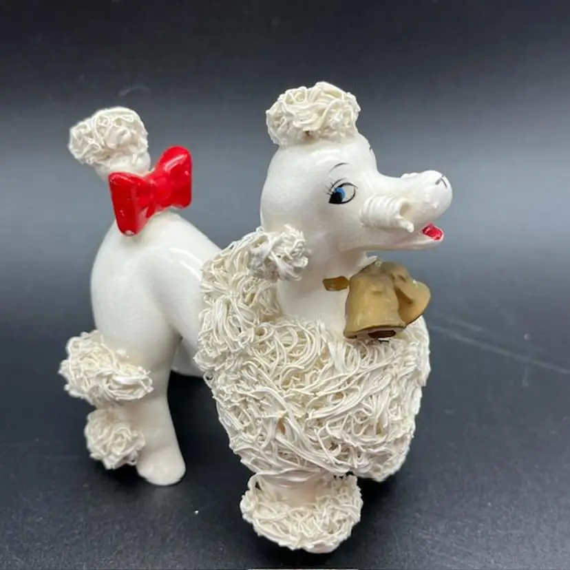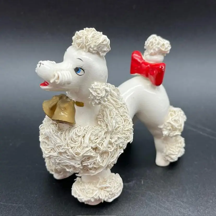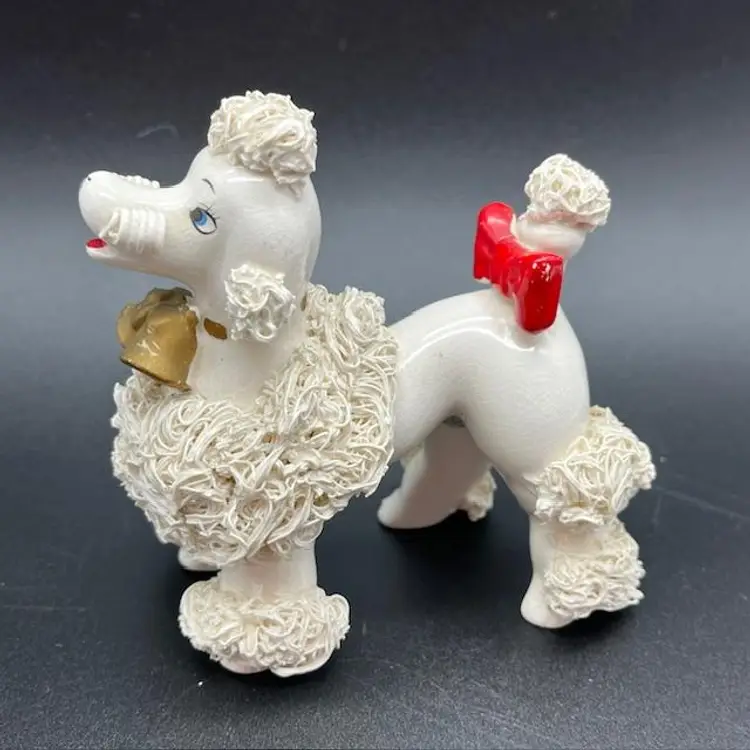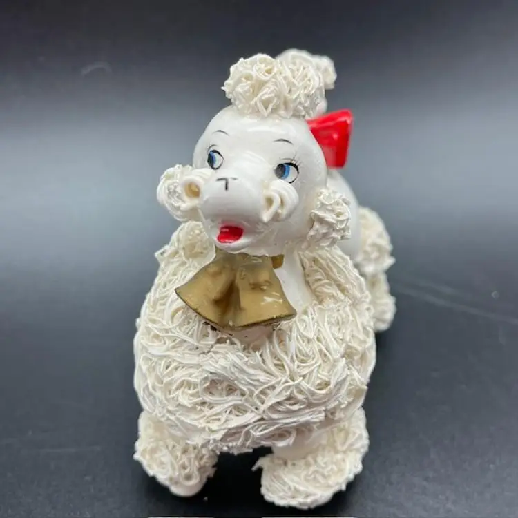 Vintage poodle figurine featuring intricate detailing and a cute red bow. She is all set to party at your house. There is no damage to this piece, tiny bit of red paint missing on the bow