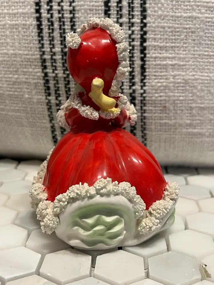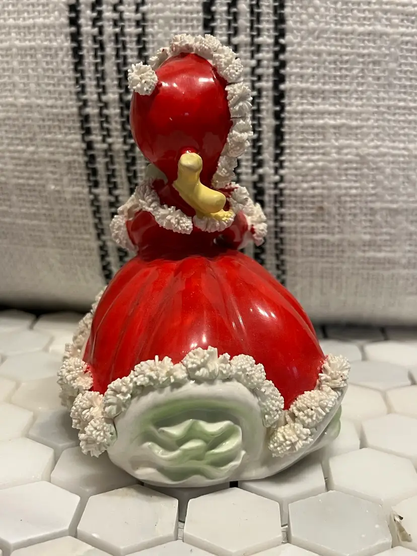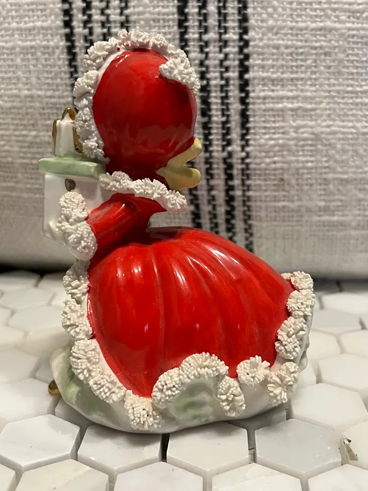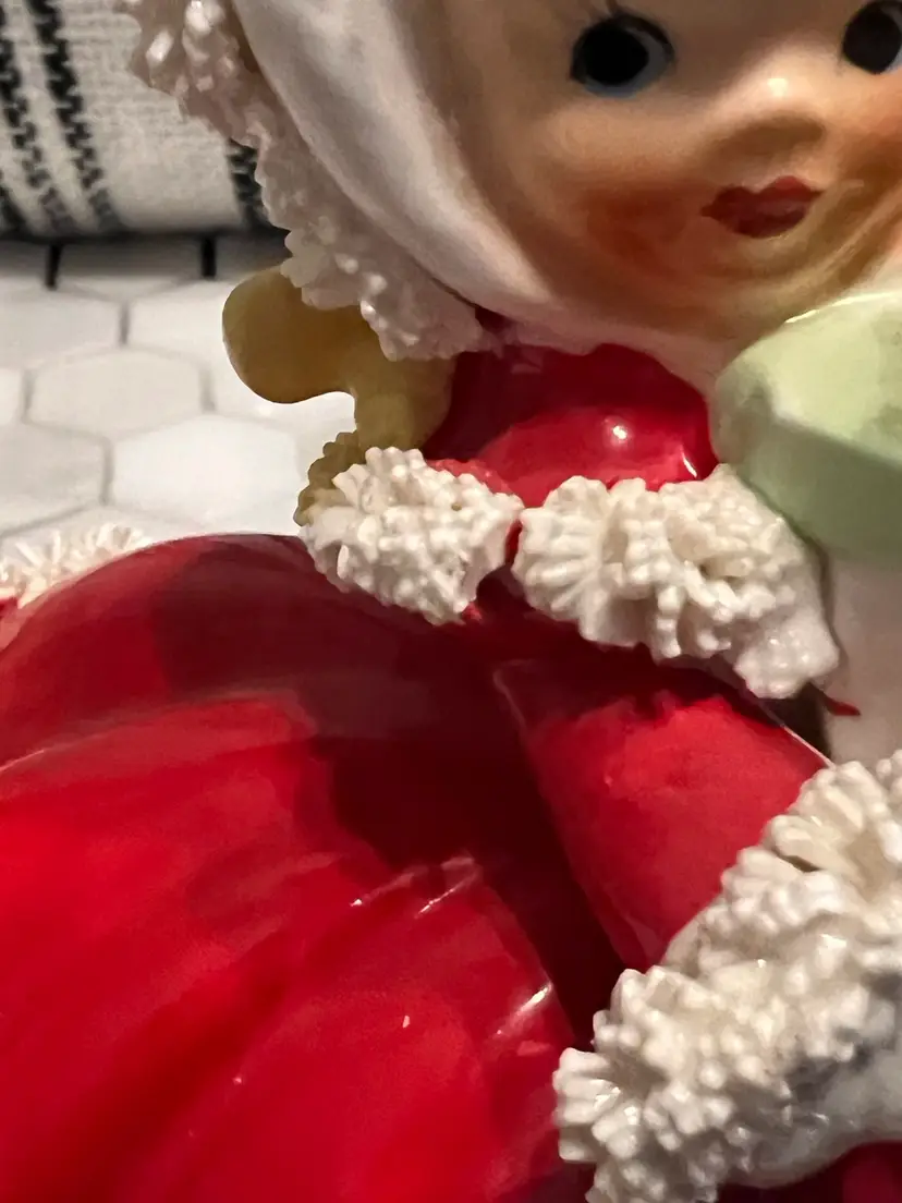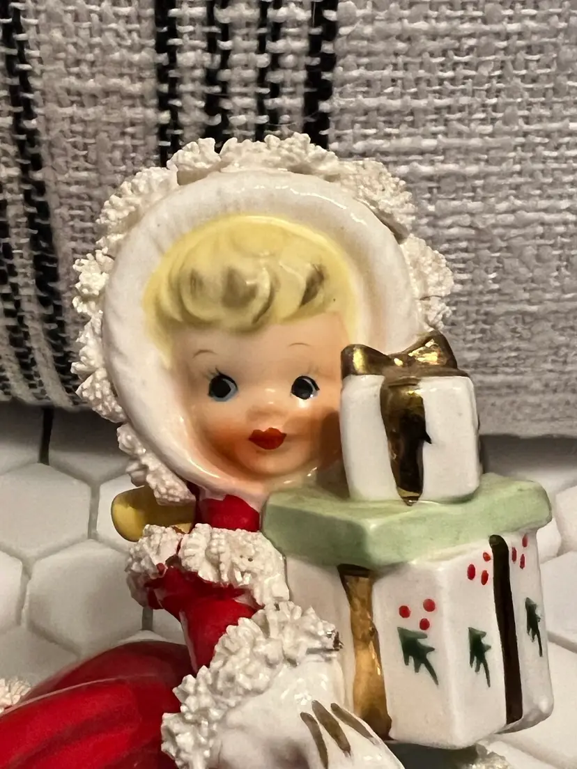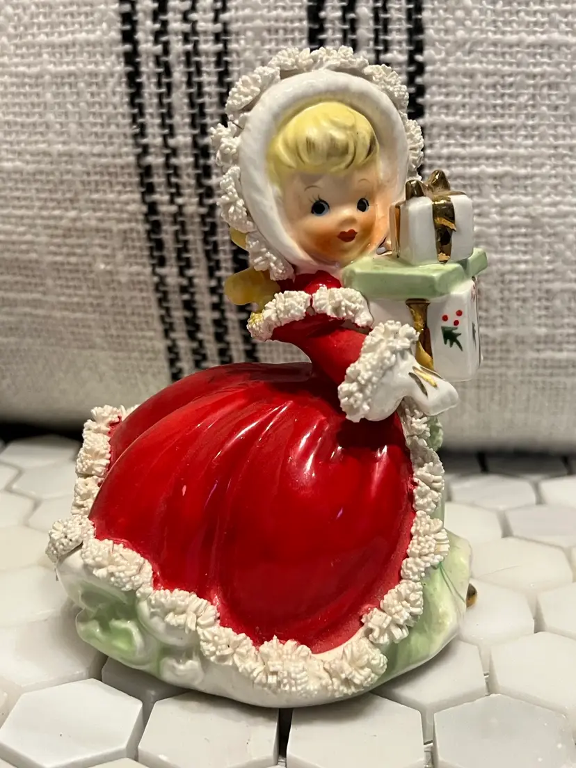 Adorable vintage Napco girl with President. Very nice condition- last picture depicts a split in the Spaghetti that would have happened at manufacturing. She is so sweet and said she wants to come live happily ever after with you. Stands 5 inches tall, 4” front to back