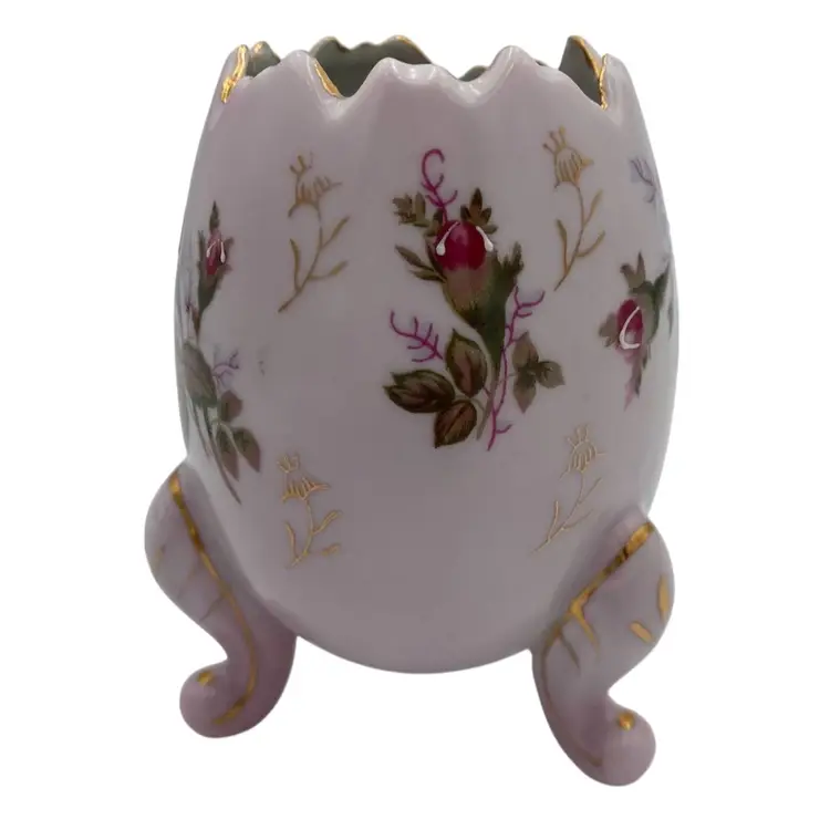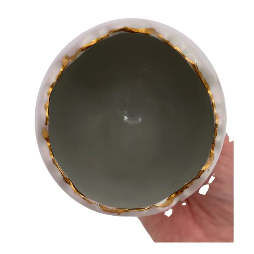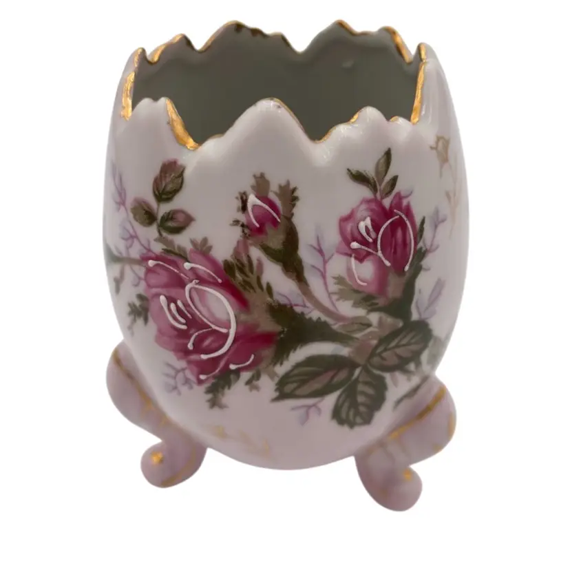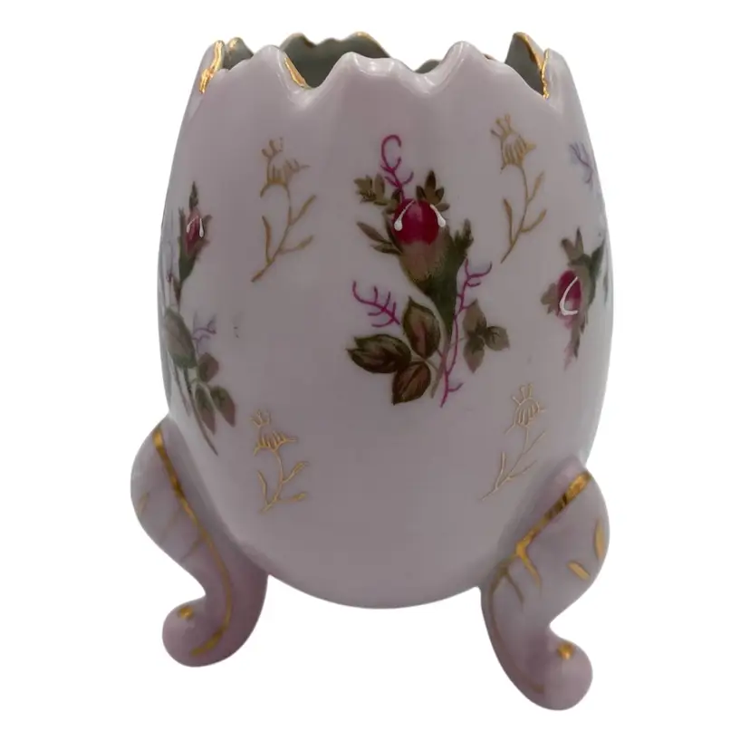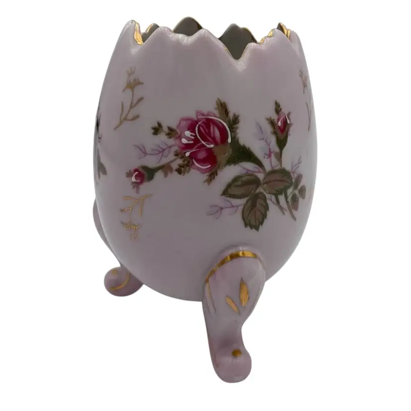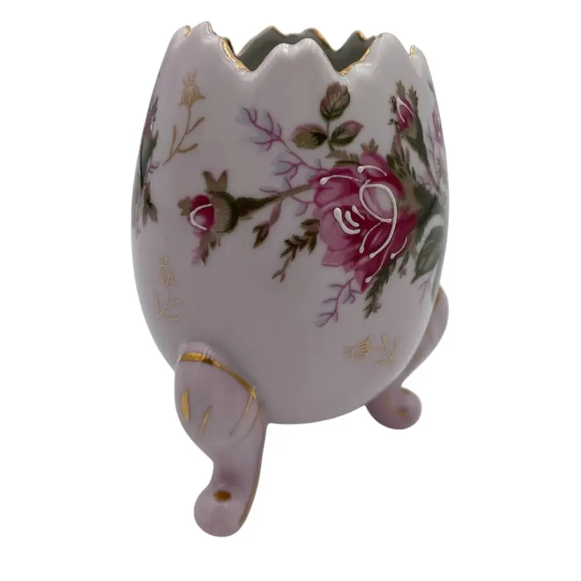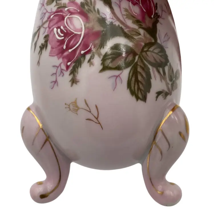 Add a touch of vintage elegance to your decor with this exquisite Napcoware porcelain egg vase. Handcrafted in Japan in 1972, this decorative piece showcases a delightful floral pattern with transferware roses, accented by hand-painted intricate gold gilding and white moriage detailing. The glossy finish enhances the beauty of the vase, which stands at 5 inches tall and measures 3.7 inches in width, weighing in at a sturdy 8.8 ounces. The vase is a testament to the artistry of the era, featuring a printed backstamp (sticker) that confirms its authenticity. With its beautiful colors, it would make a perfect piece for Easter or spring, or a year-round piece of decor.