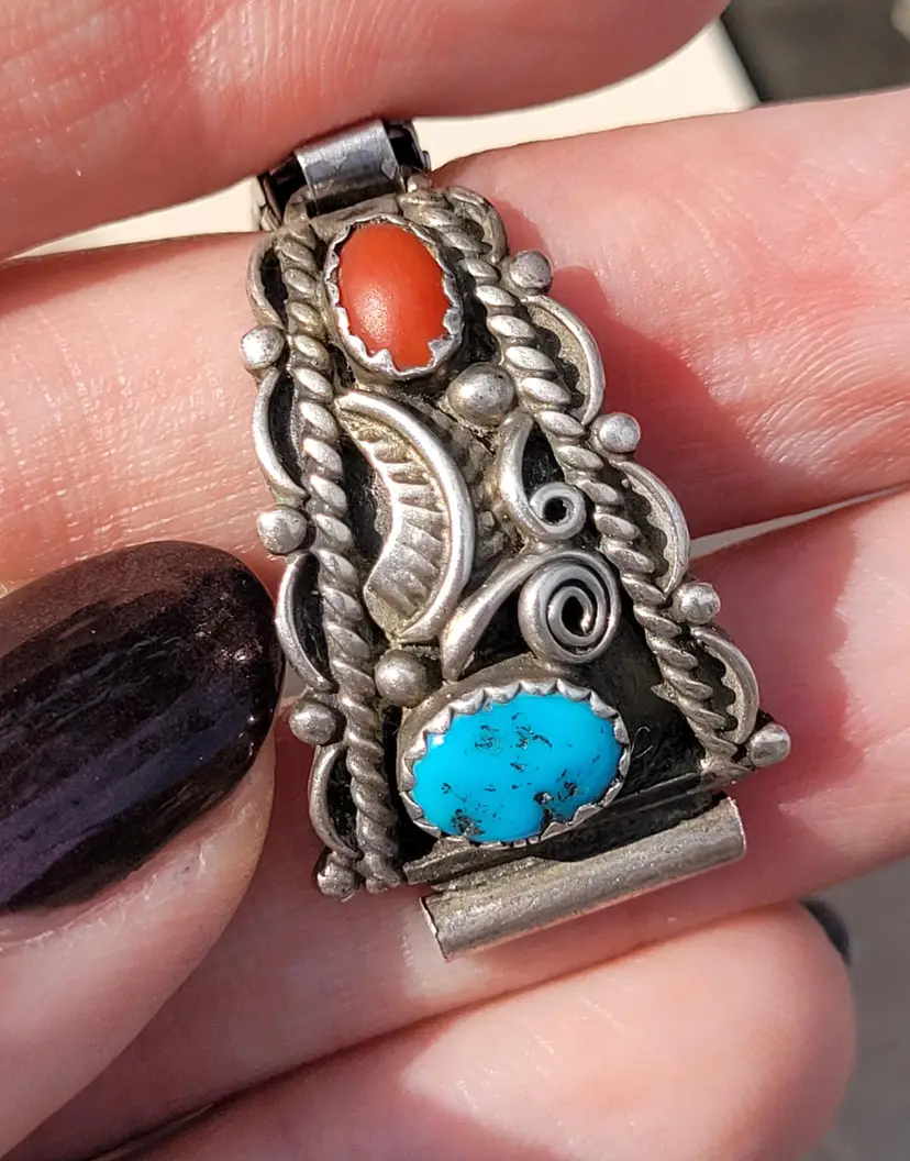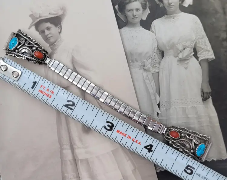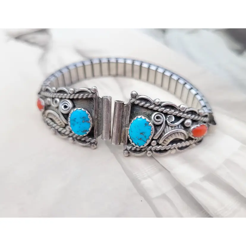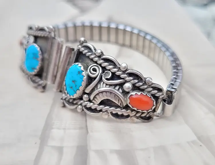 Gorgeous sterling silver watch tips made and signed by Navajo artist, Ernest McCrea! They have been tested to verify metal content and have coral and turquoise stones, I believe being circa 1970s. The lugs measure 12 mm. They come already attached to a stretchy band, does not include any watch. Please see pictures for details and measurements.