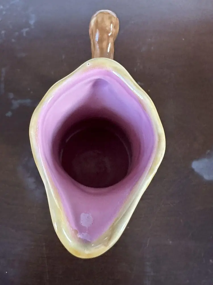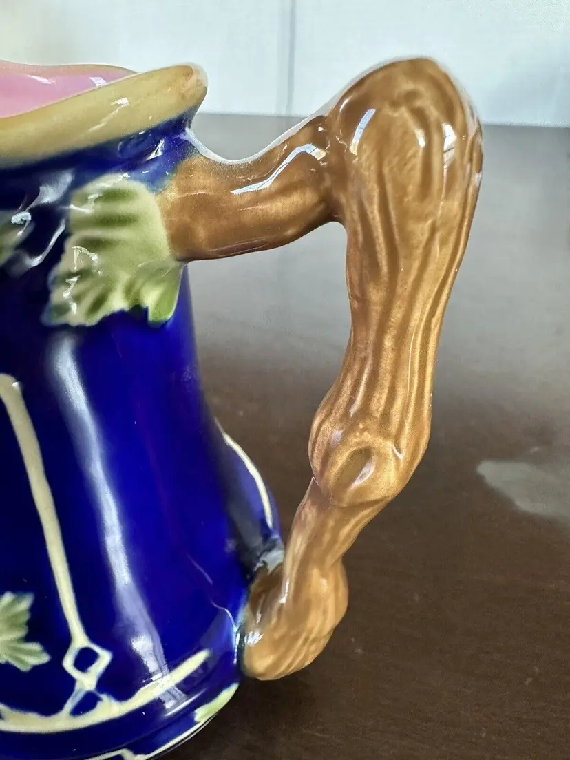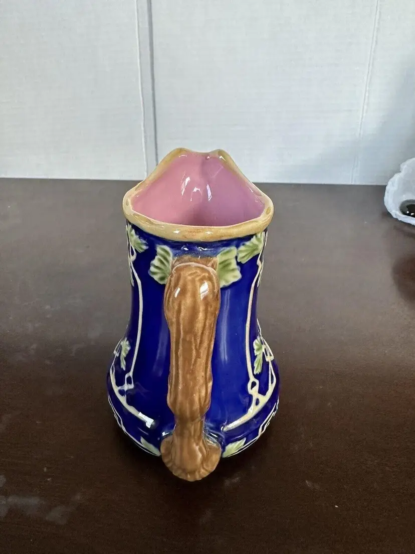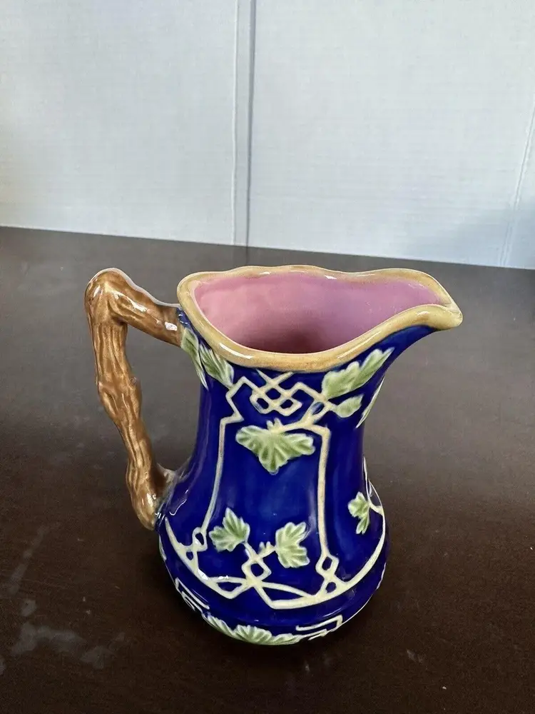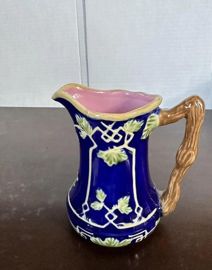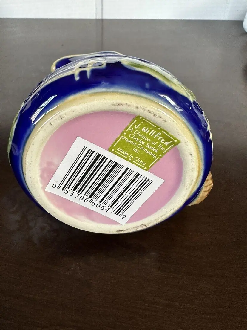 Add a touch of vintage charm to your collection with this beautiful navy blue ceramic creamer from Jay Willfred by Sadek. The art nouveau style is evident in the intricate green vine pattern that adorns the piece, making it a decorative addition to any kitchen or dining room. The round shape and glossy finish give it a classic appeal, while the bamboo pattern adds an exotic twist. Crafted in China in 1990, this original piece is a must-have for lovers of vintage pottery. Slightly over 4 inches tall and about 3 inches at the widest.