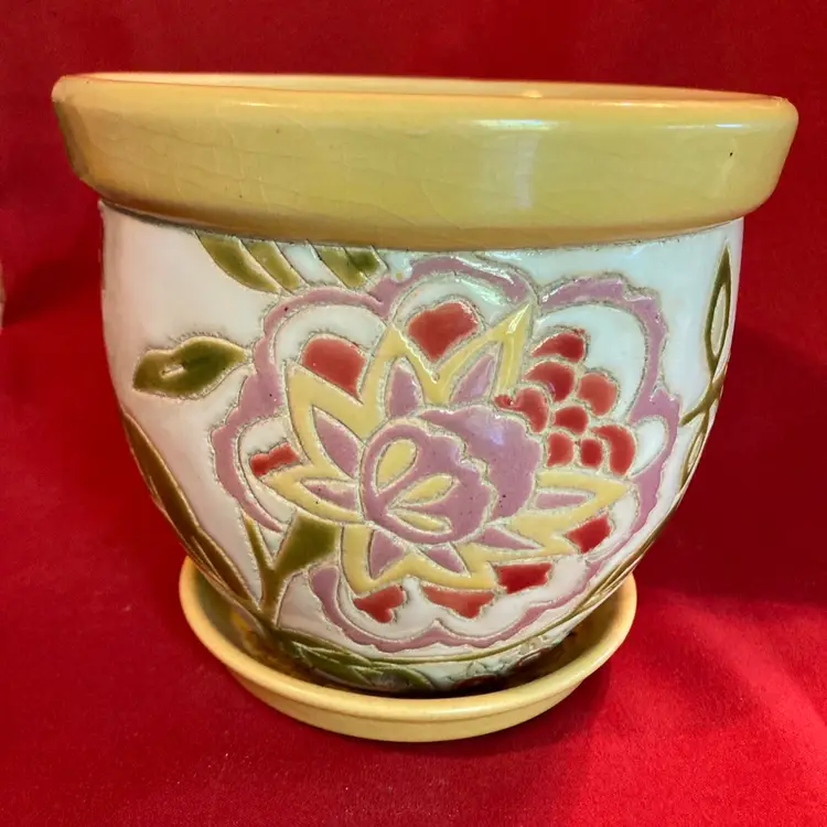 This vintage pot named, “Lemon Drop” by New England Pottery remains in perfect original condition. No chips, cracks or repairs. It measures 5 1/2 inches tall by 6 inches wide. Pretty!