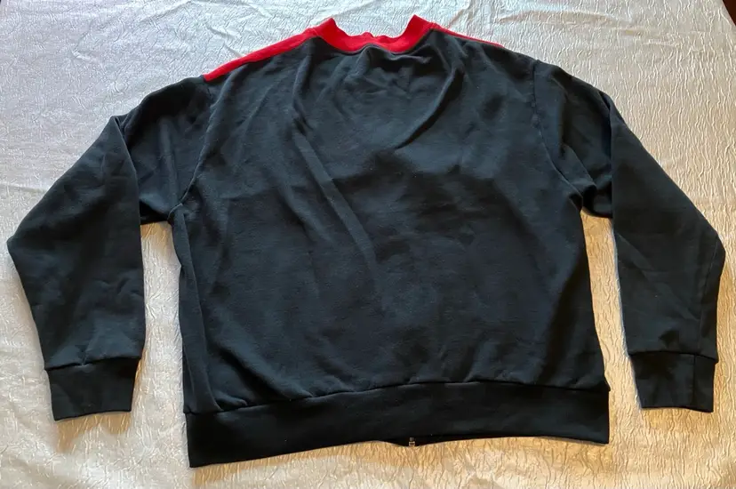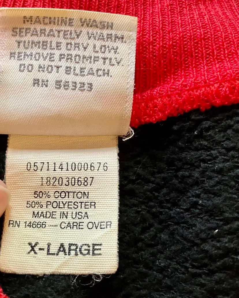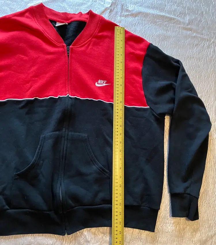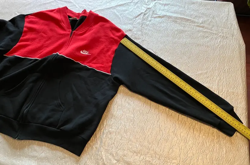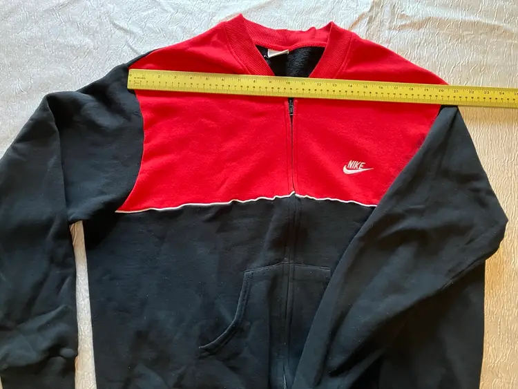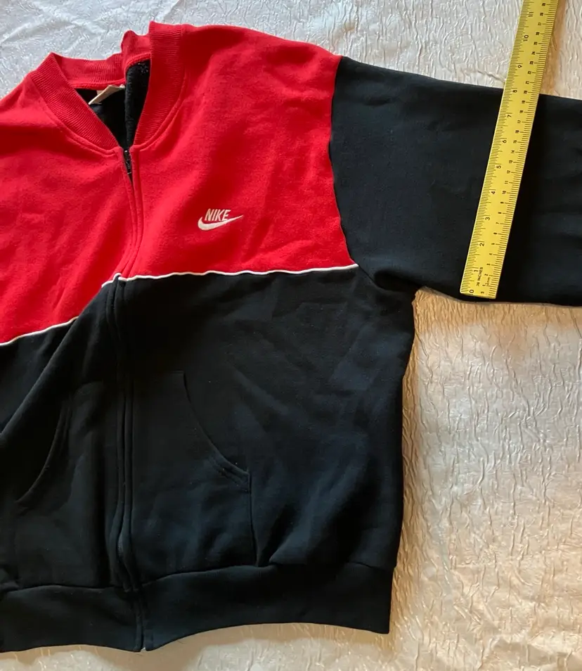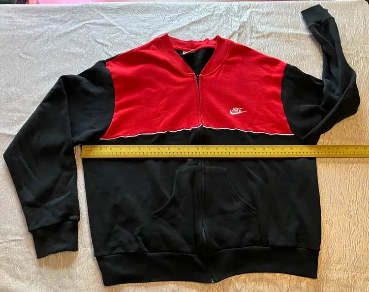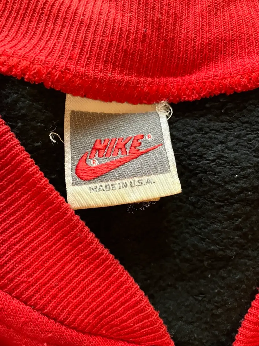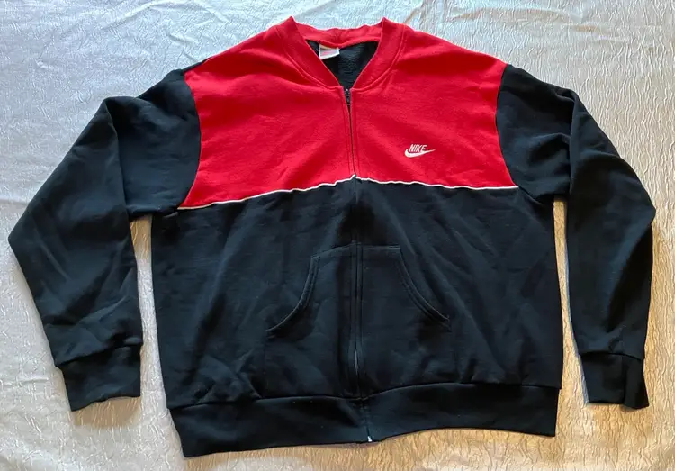 This vintage Nike sweatshirt in size XL features a classic colorblock design in red and black with white piping accents. Made of a comfortable 50% cotton and 50% polyester fleece fabric, this sweatshirt is perfect for year-round cooler seasons, whether you're lounging at home or out for a run, hanging out at a campfire or out in the boat. The zippered crewneck style neckline and long sleeves with embroidered logo accents add a touch of athletic style, while the split pockets provide storage for your smaller essentials / cellphone. Machine washable for easy care, this sweatshirt is a great vintage made in the USA Nike clothing.