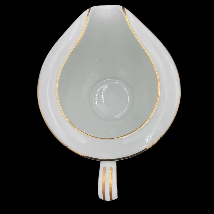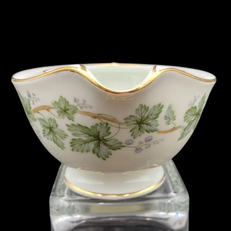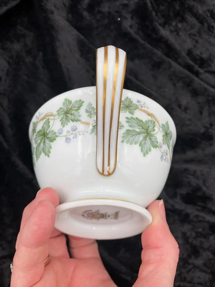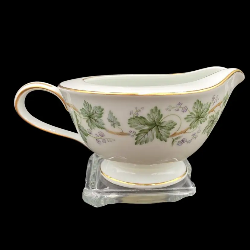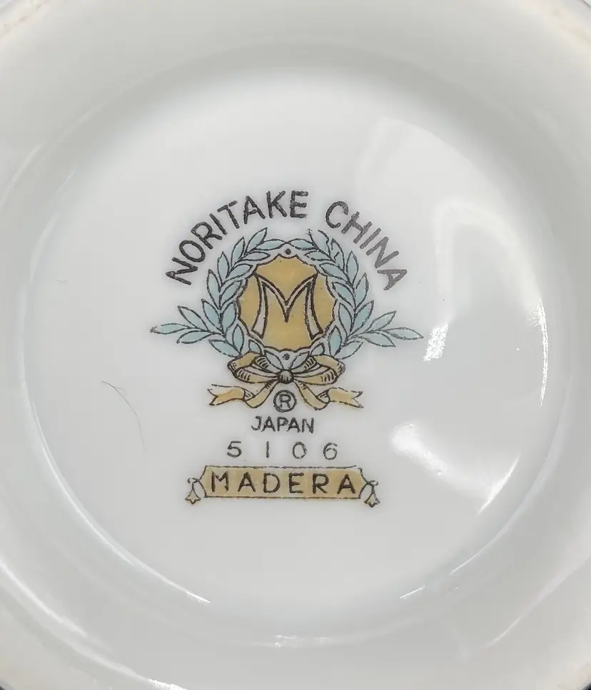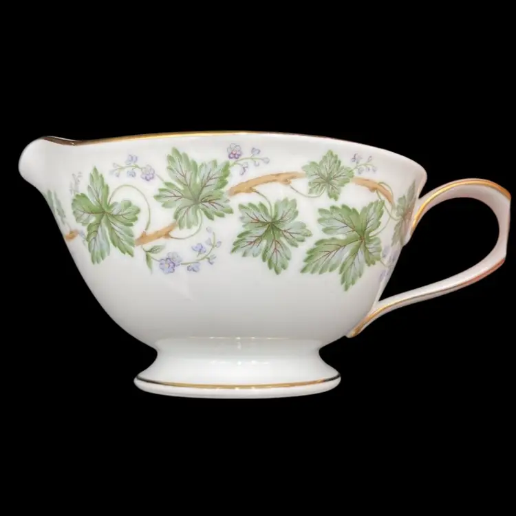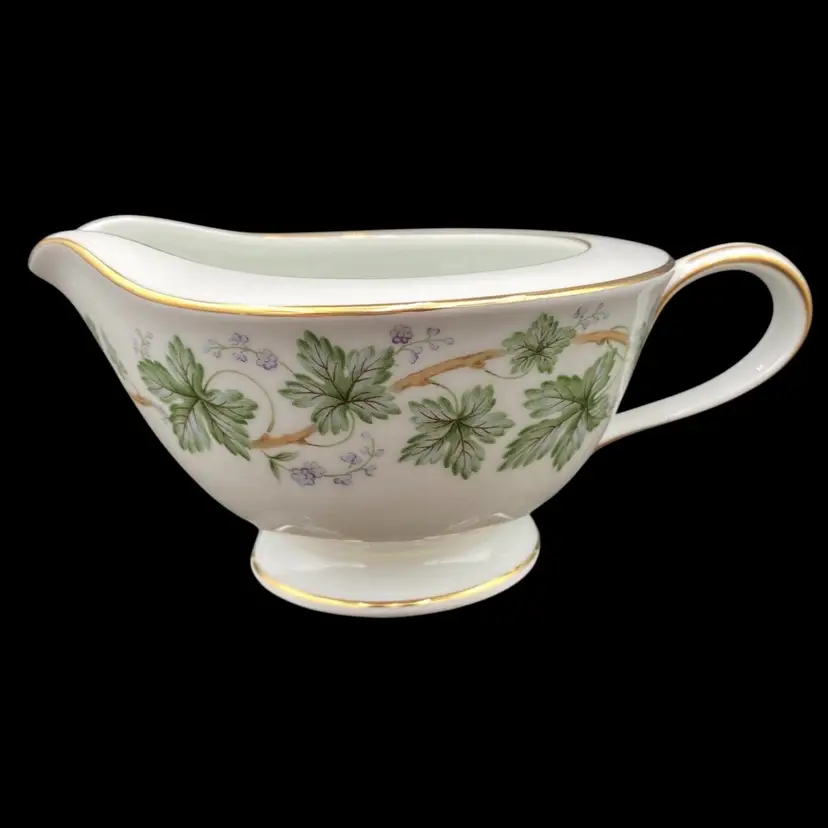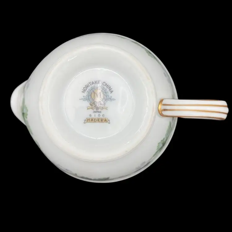 Introducing a stunning vintage Noritake 'Madera' pattern porcelain creamer (pattern #5106, made from 1950-1957), that will add a touch of mid-century modern elegance to any occasion. This creamer features a glossy finish with a beautiful green vine and purple flowers design, accented with gold trim, and has a volume of 9 ounces. Crafted in Japan in 1952, this original piece has a printed backstamp and is made of high-quality bone china. It measures 6.2 inches in length, 4.4 inches in width, and 2.75 inches in height, and weighs 5.2 ounces. Perfect for all occasions, this creamer is a must-have for collectors and enthusiasts of vintage dinnerware.