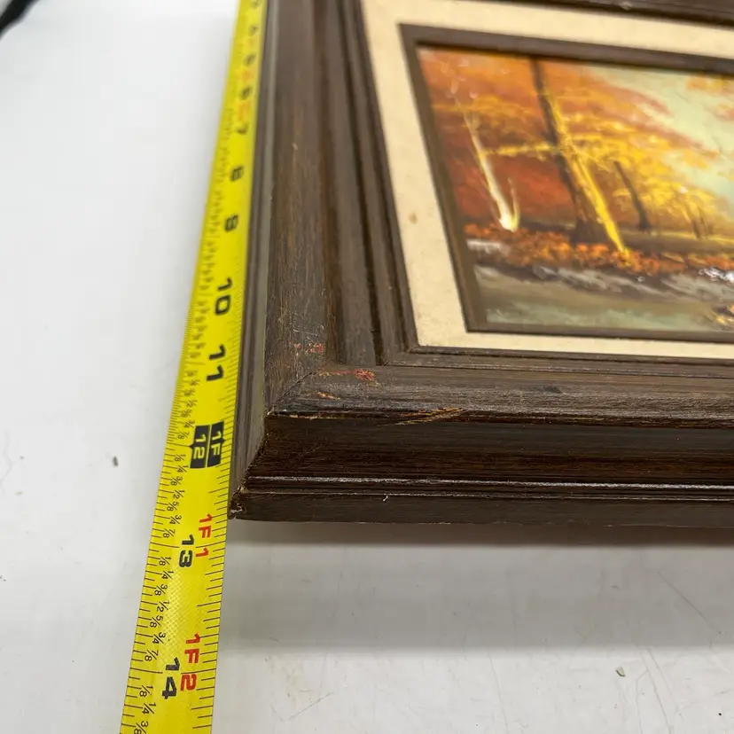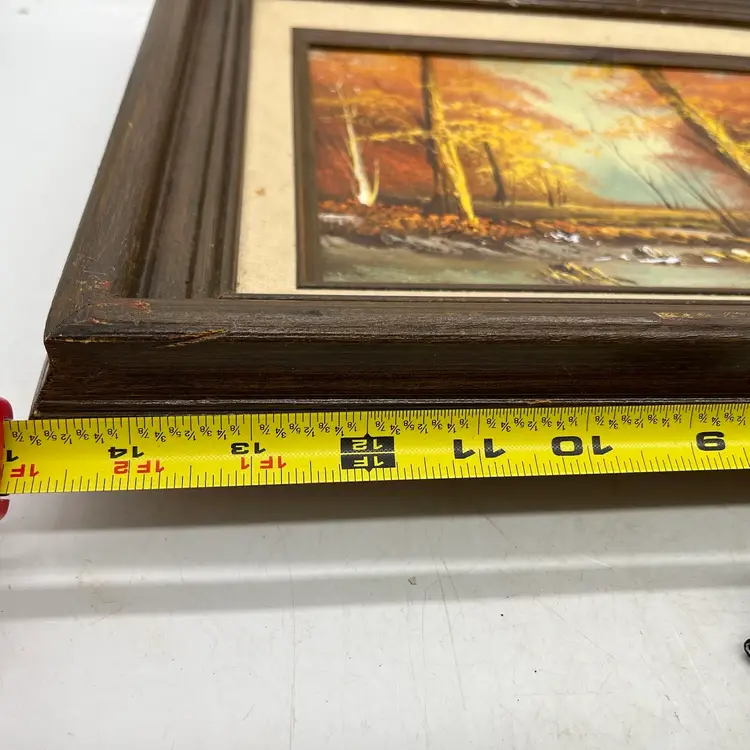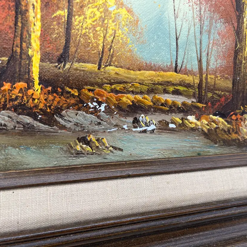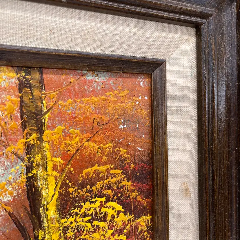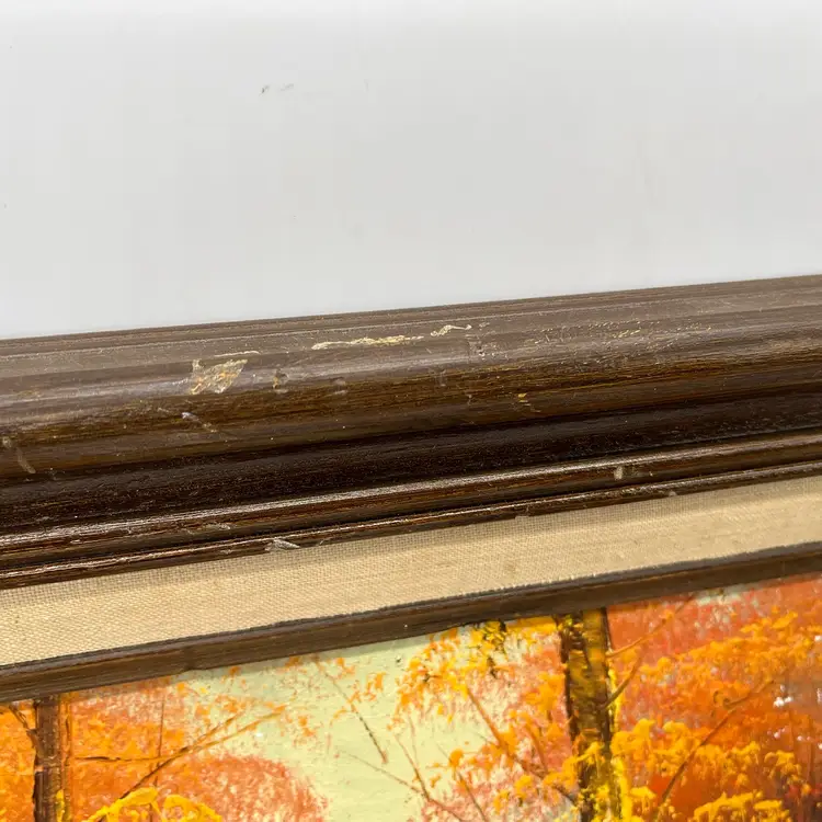 This is a beautiful fall scene original oil in chunky wood frame. It has wear to the painting please see photos.