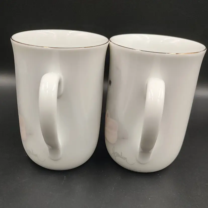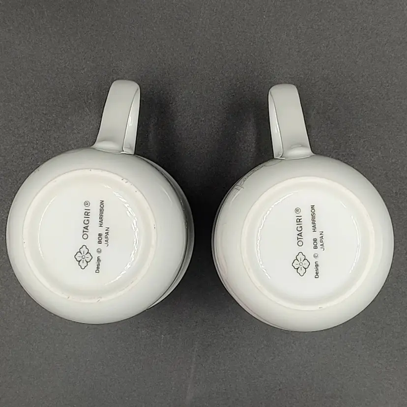 Vintage 1980 Otagari Ceramic Kitten Mugs Signed By Artist Bob Harrison. Gold trimmed rim. Height 4" x diameter 3". Holds 8 ounces. Made in Japan