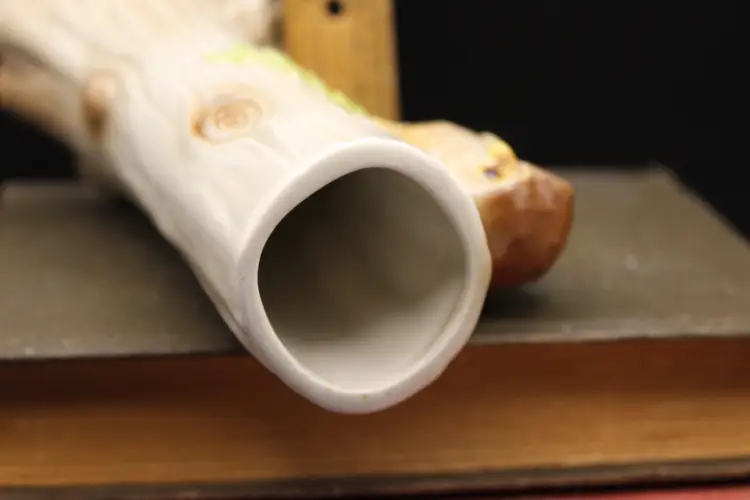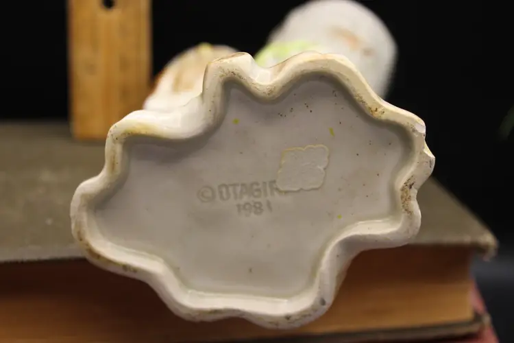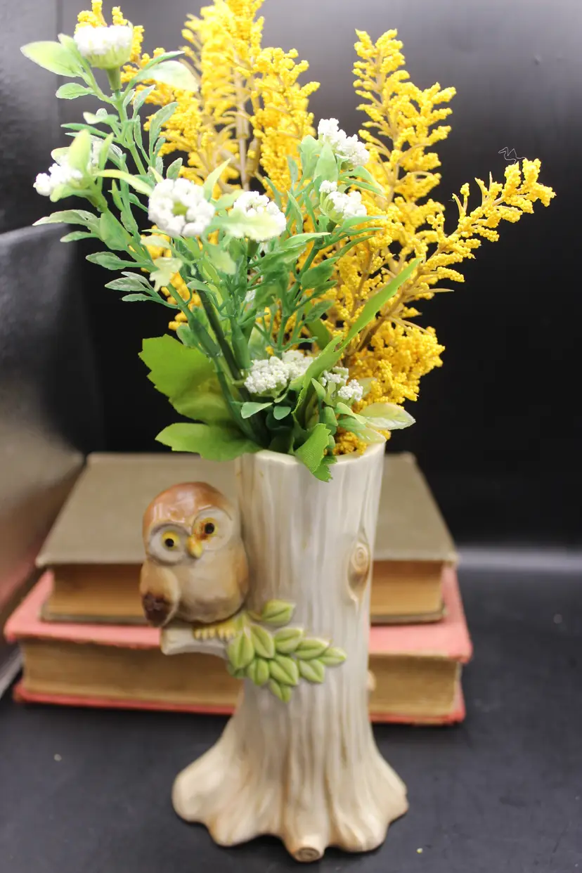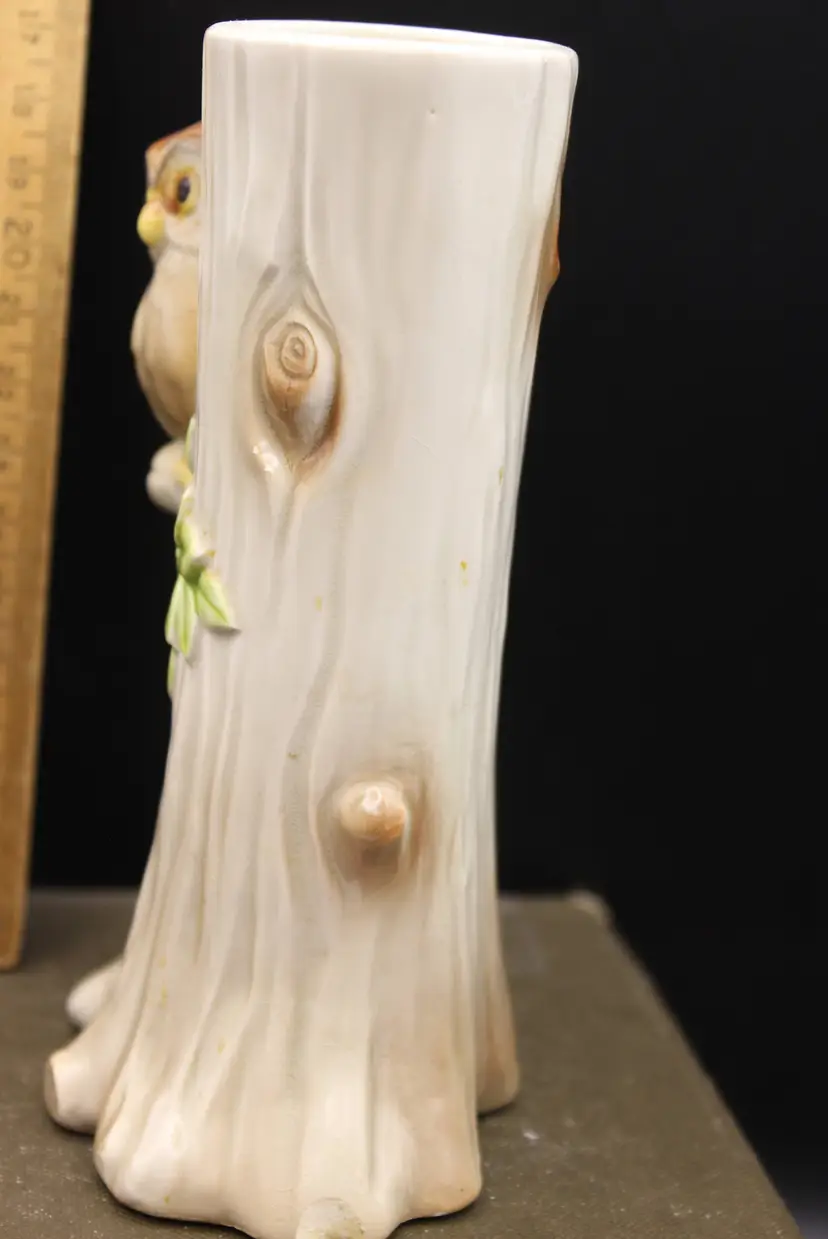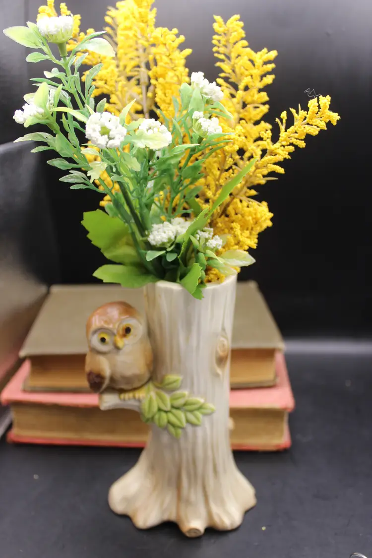 Cute VTG Bud Vase. Owl perched on limb of tree stump. Ceramic marked Otagiri 1981 on the bottom. Remnants of original sticker. One small chip on foot of tree root on right side. Forgivable, not visible when in front view. Shown with faux flowers for visual (not included). So cute for your fall décor