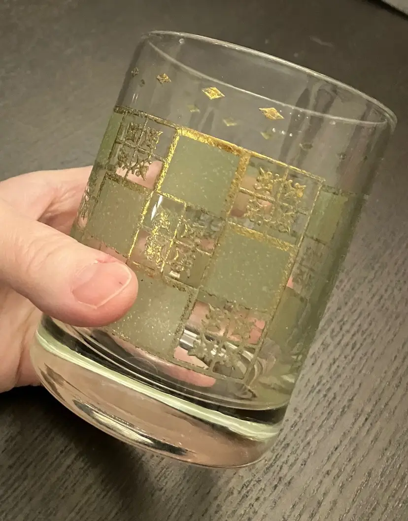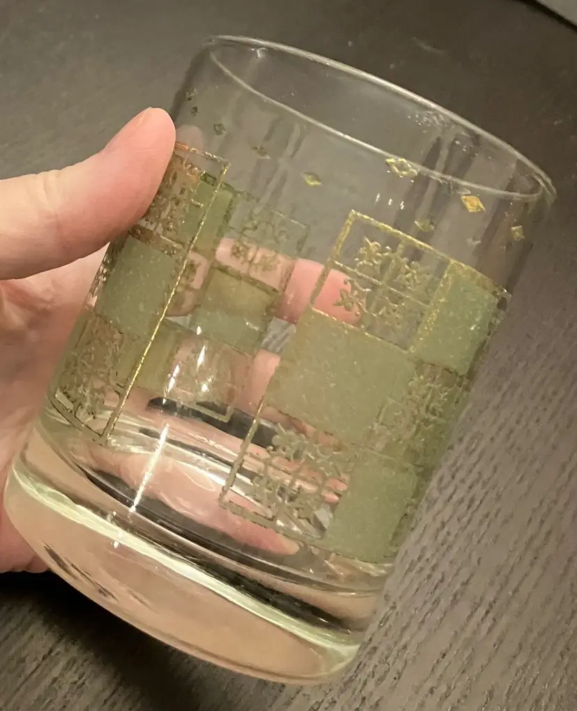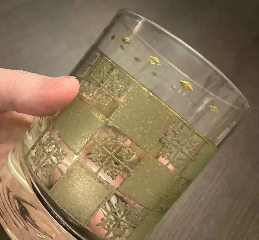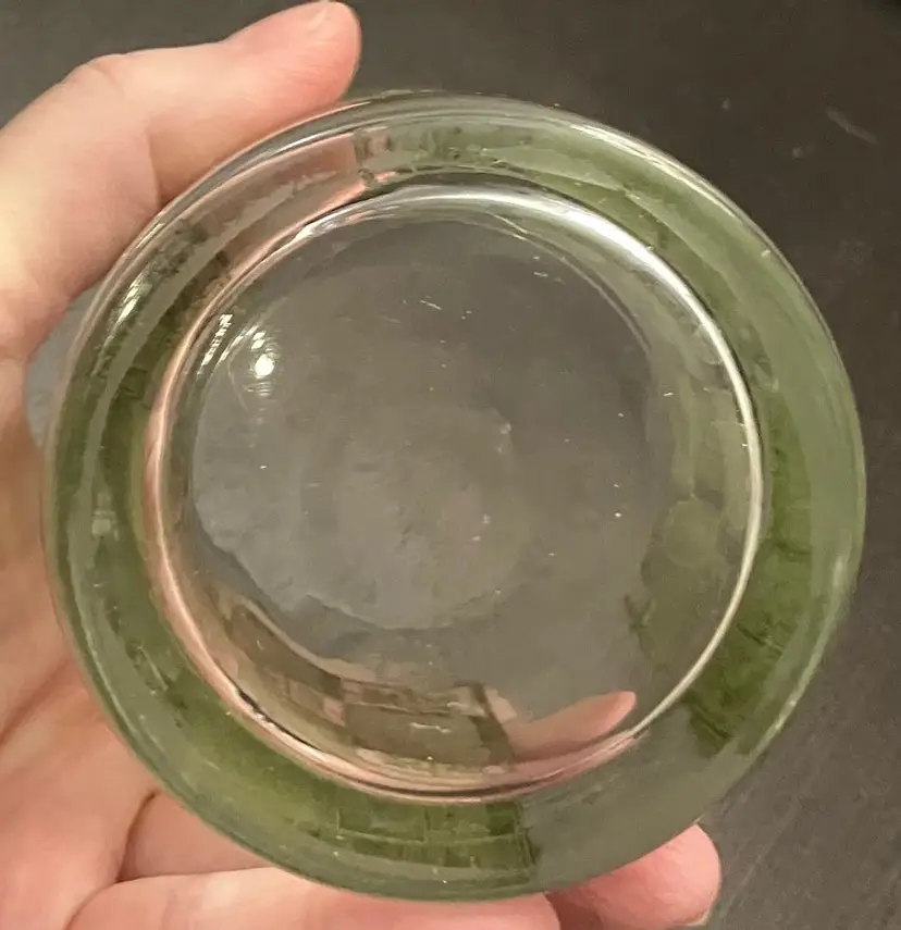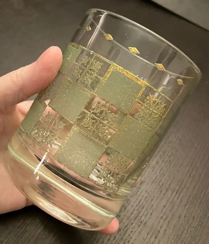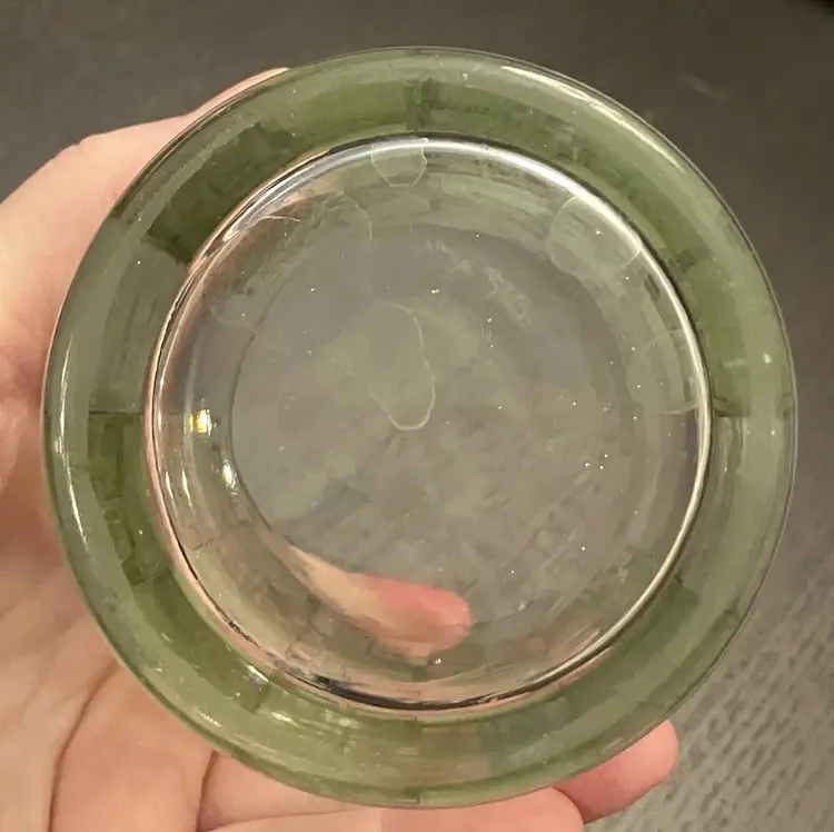 Wear on both the green and the gold. No cracks. Measures about 3" in diameter and 4" tall.