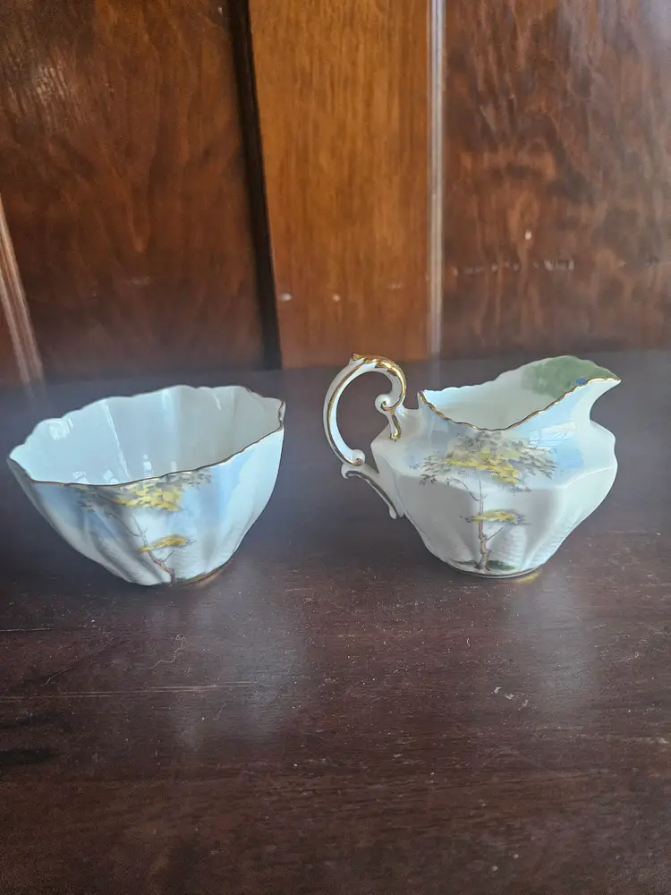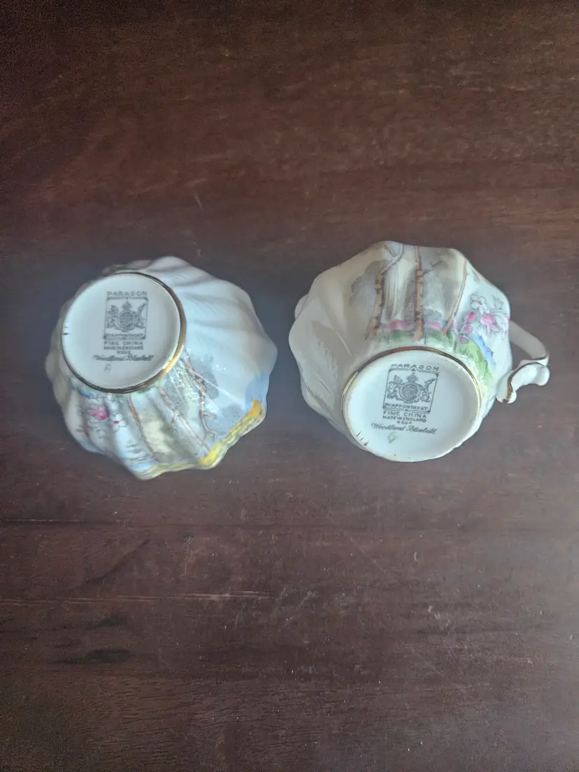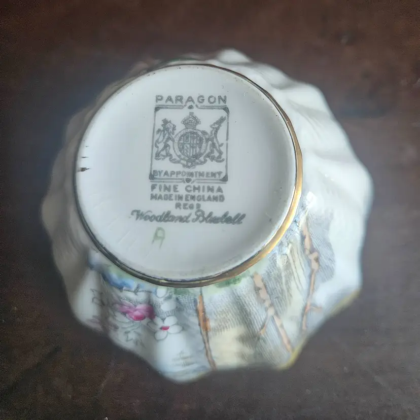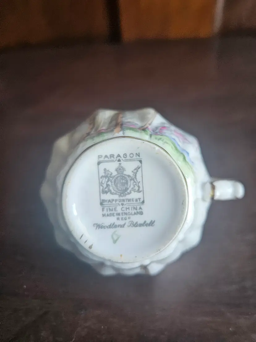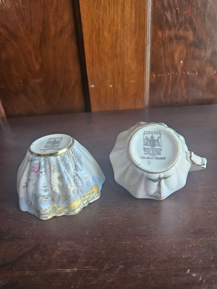 This vintage Paragon China England Woodland Bluebell sugar bowl and creamer set is a charming addition to any kitchen or dining room. Made of fine bone china with a multicolor Woodland Bluebell pattern, this set includes a creamer and sugar bowl with hand-painted details.