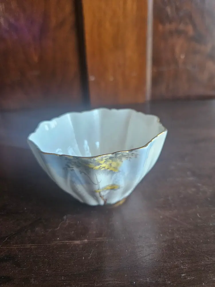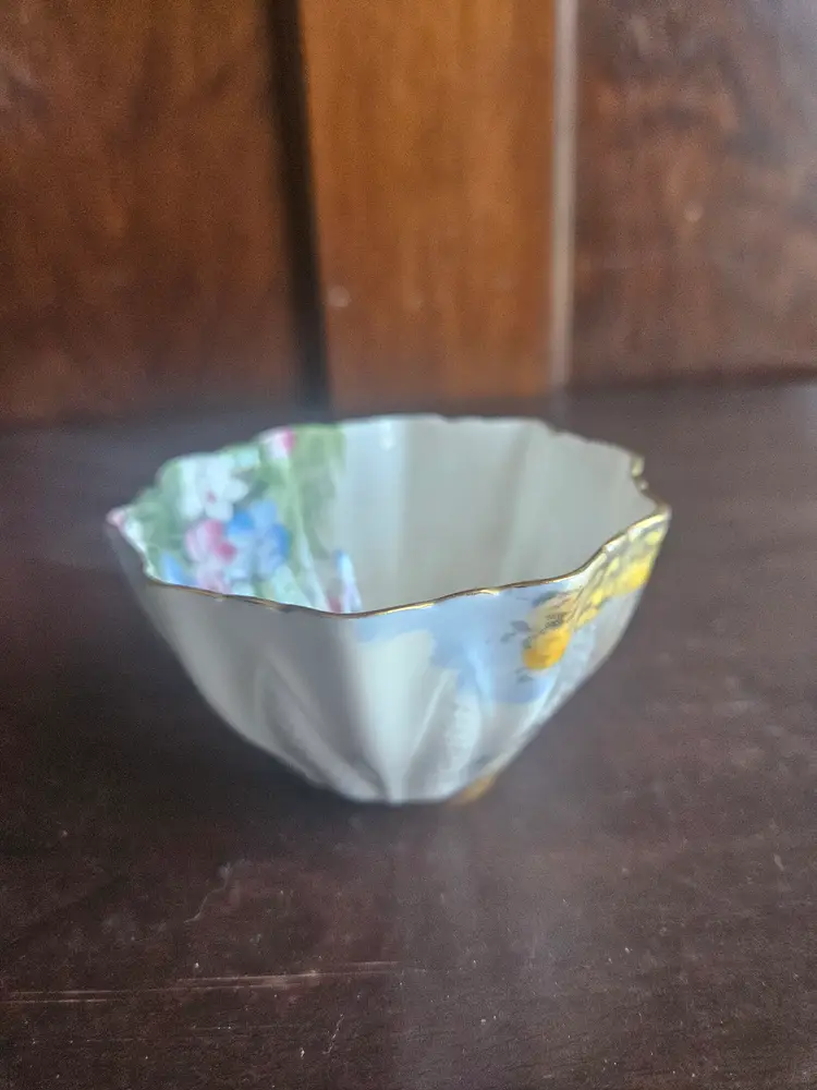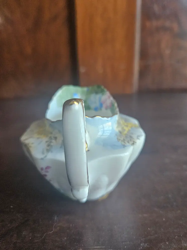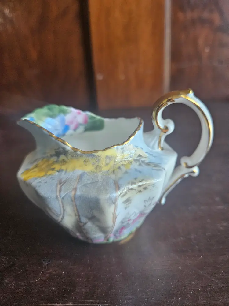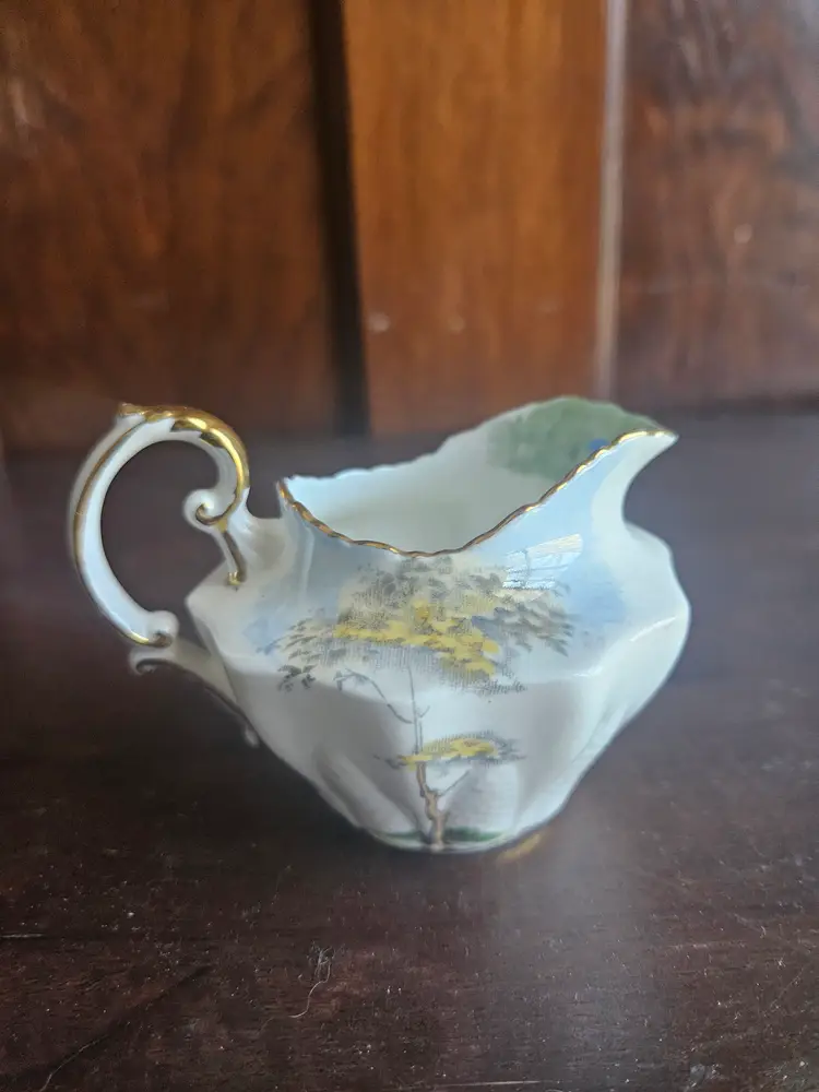 This vintage Paragon China England Woodland Bluebell sugar bowl and creamer set is a charming addition to any kitchen or dining room. Made of fine bone china with a multicolor Woodland Bluebell pattern, this set includes a creamer and sugar bowl with hand-painted details.