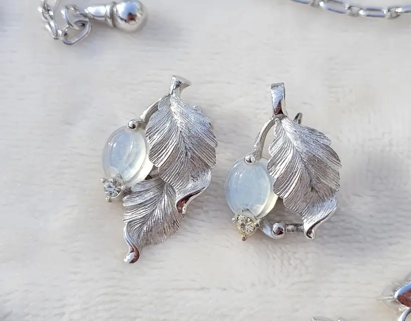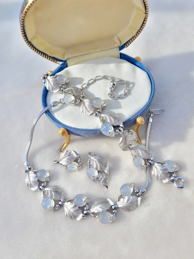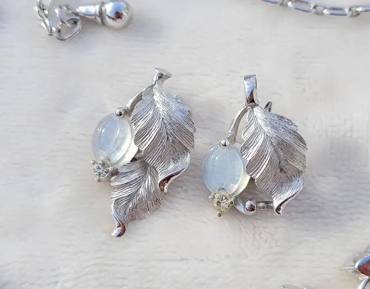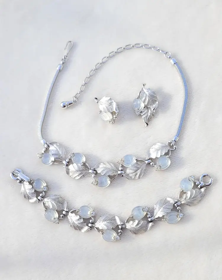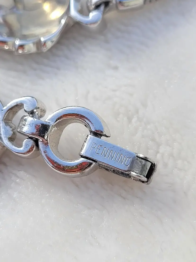 Stunning rare signed 1960s Pennino moonstone glass set, including a necklace, bracelet, and clip on earrings. These come from an estate and are in good condition, however it appears one of the earrings was lost at some point and a new one was crafted from one link of the necklace. As you can see in the pictures the earrings are close but not an exact match, but it's not very obvious when worn. I think it's rather endearing that this set was so loved that so much work went into making it complete again! The necklace is 15" and can be made up to 4" shorter based upon where you hook the clasp, and the bracelet is 7". Please see pictures for details and measurements, sold as is and is priced accordingly based upon the imperfections.