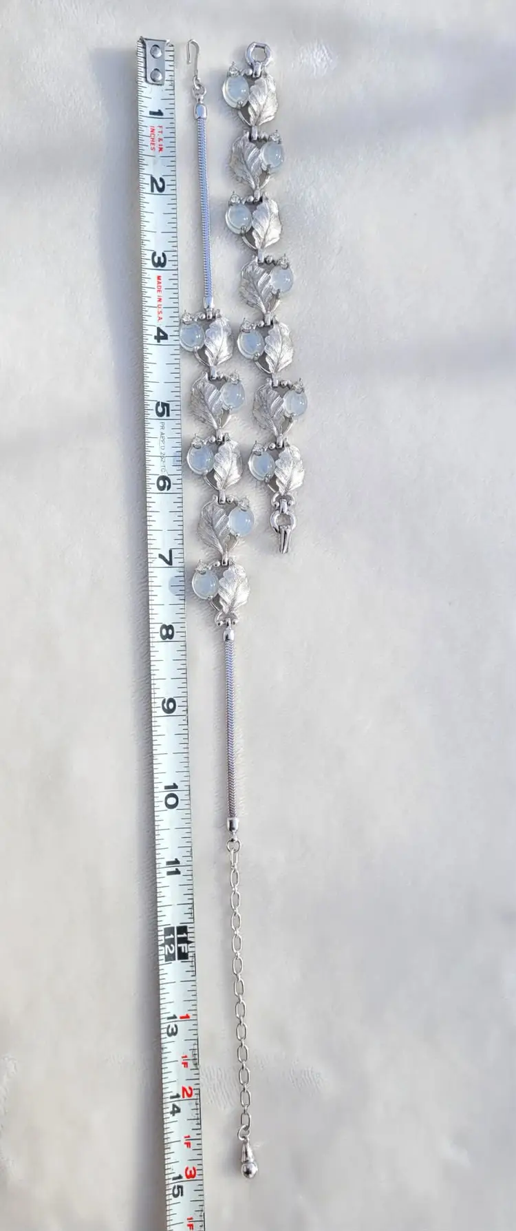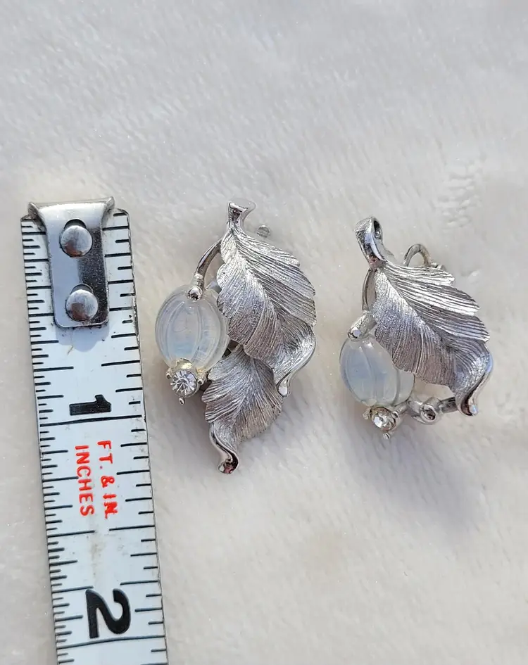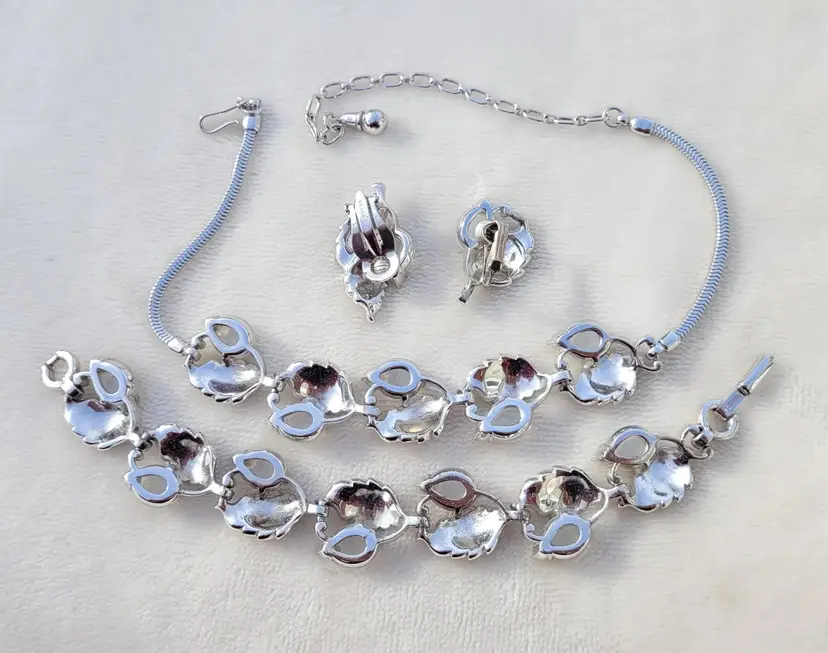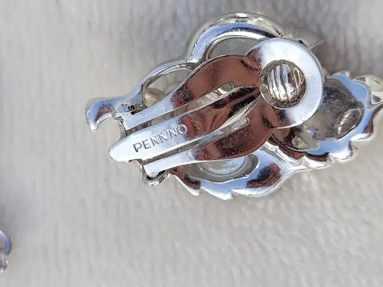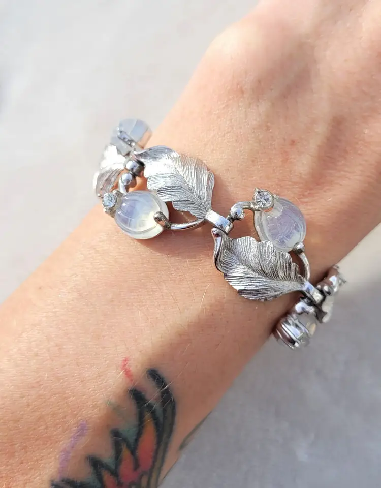Stunning rare signed 1960s Pennino moonstone glass set, including a necklace, bracelet, and clip on earrings. These come from an estate and are in good condition, however it appears one of the earrings was lost at some point and a new one was crafted from one link of the necklace. As you can see in the pictures the earrings are close but not an exact match, but it's not very obvious when worn. I think it's rather endearing that this set was so loved that so much work went into making it complete again! The necklace is 15" and can be made up to 4" shorter based upon where you hook the clasp, and the bracelet is 7". Please see pictures for details and measurements, sold as is and is priced accordingly based upon the imperfections.