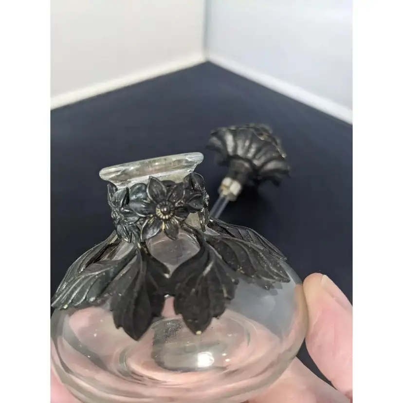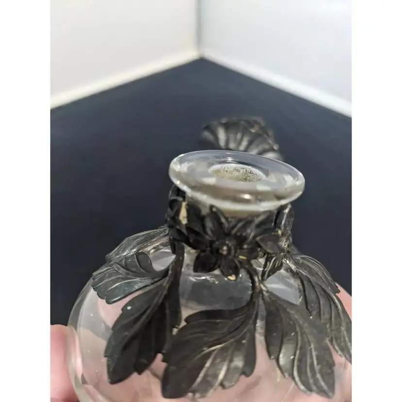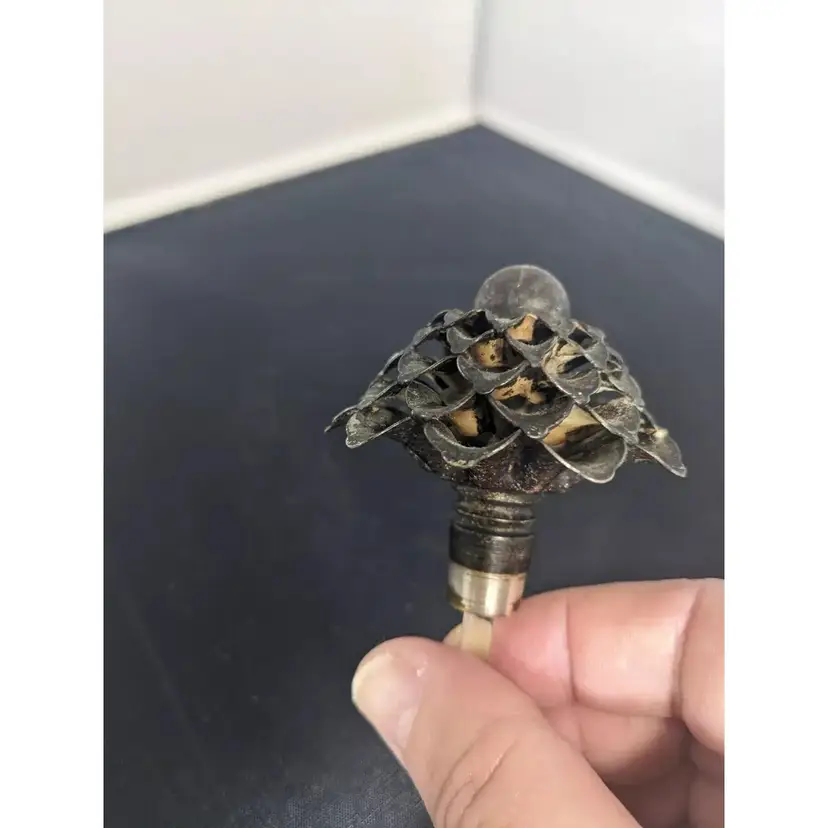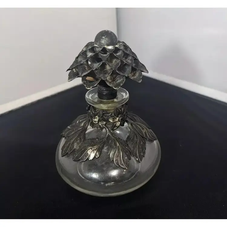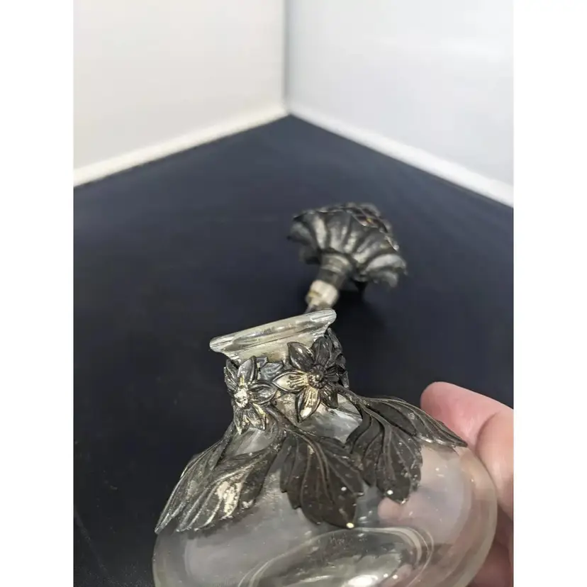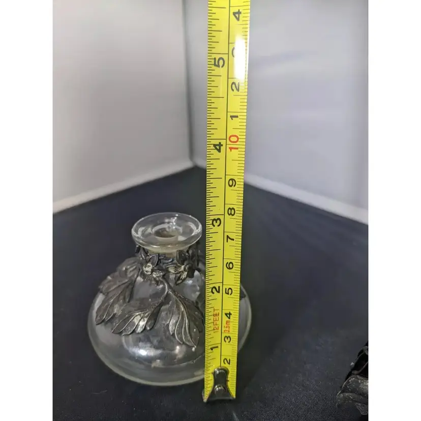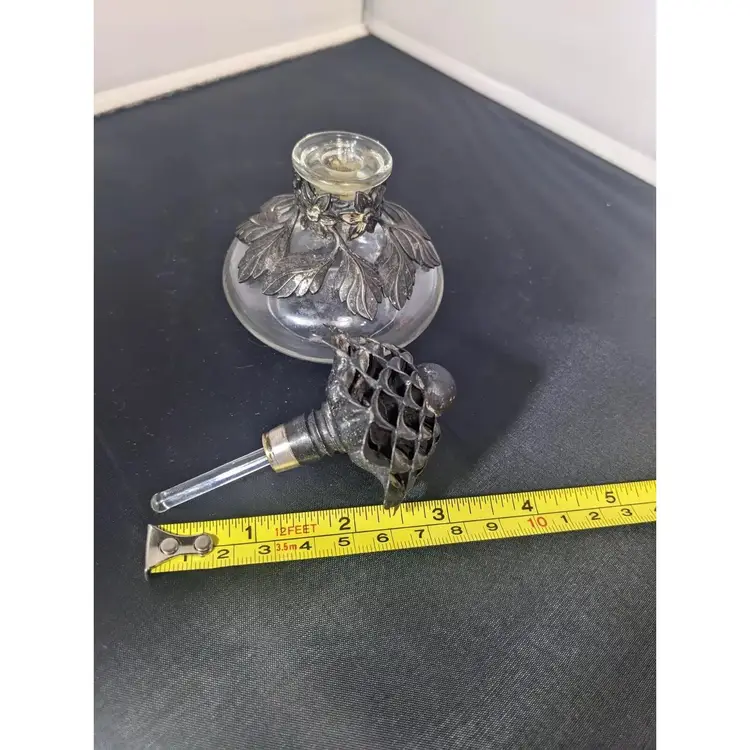 Unsure of metal, did not test positive for sterling or gold, maybe silver plate, Does have patina/oxidation( maybe remnants of paint?) and could use cleaning and polishing if you want. See all photos for condition and size