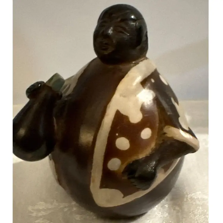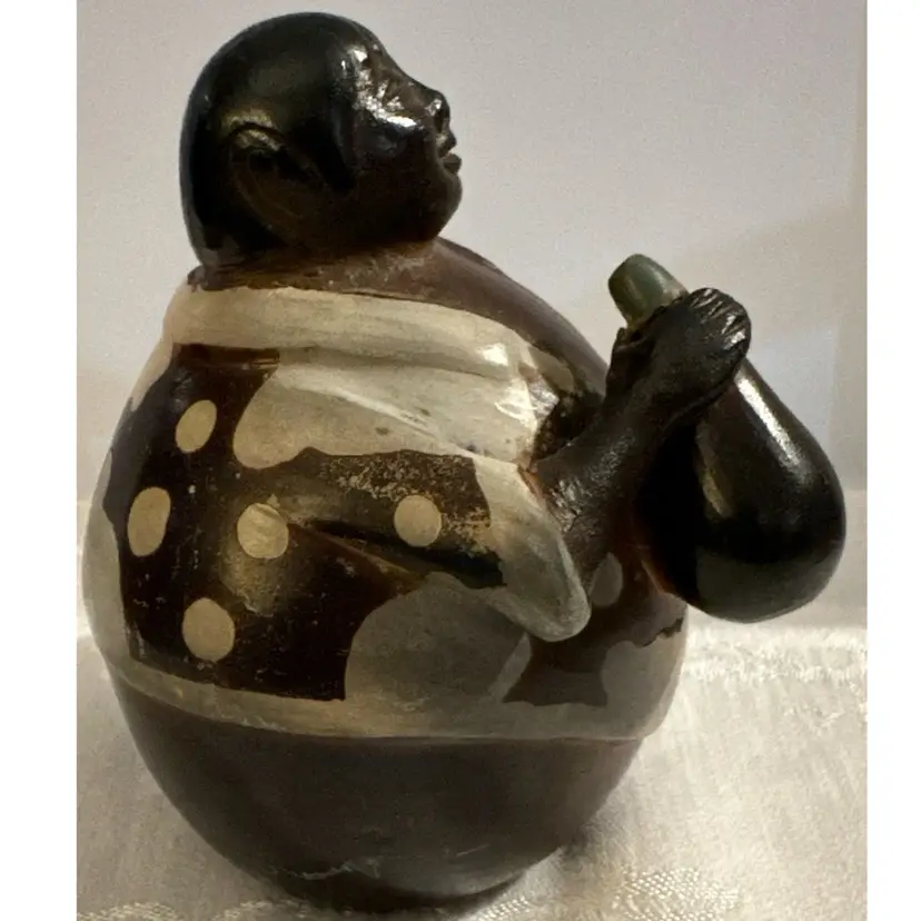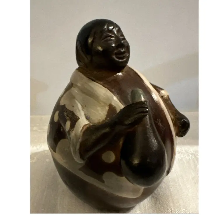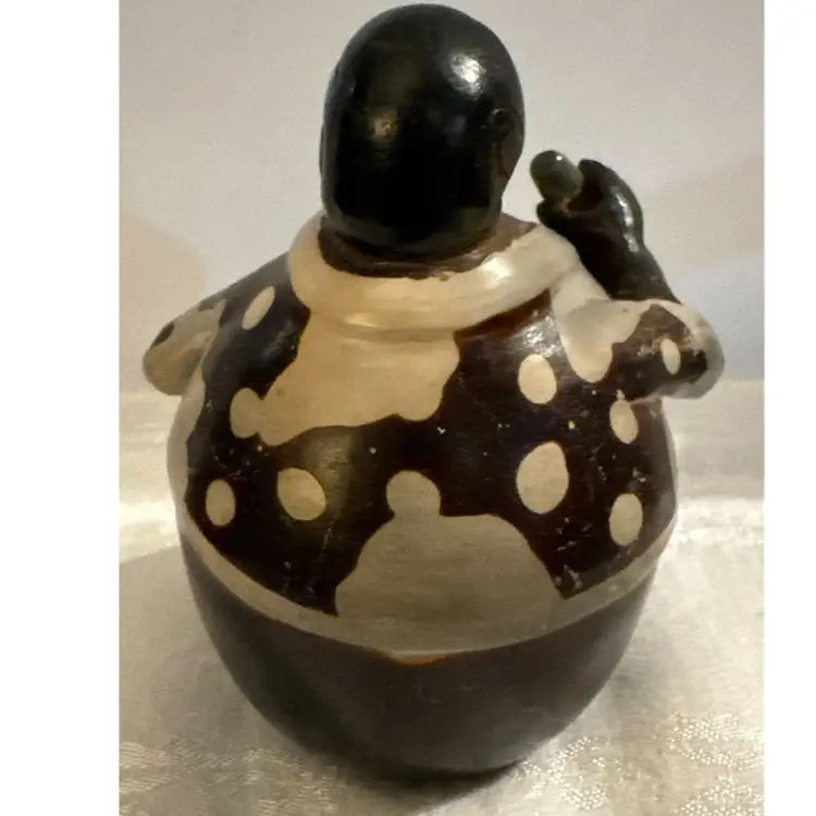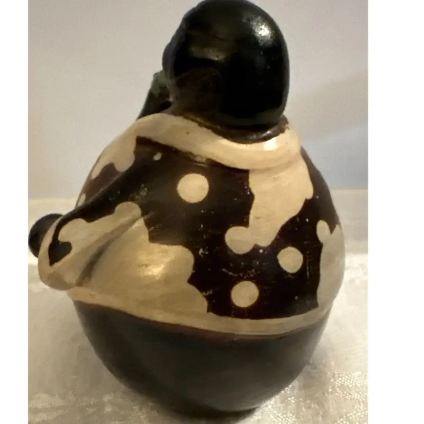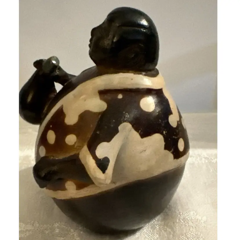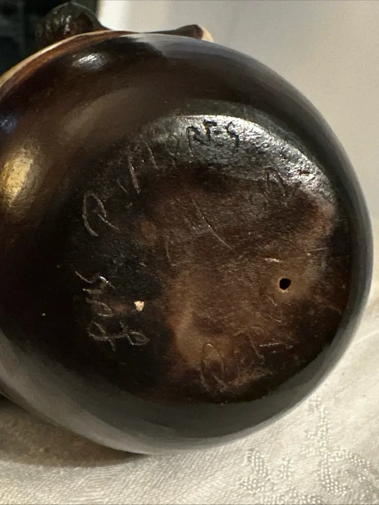 Chulucanas pottery is a traditional craft from the town of Chulucanas in the Piura valley, Peru. The black color in these ceramics is often achieved using a specific firing process with mango and banana tree leaves. Many pieces are signed by the artist, such as Rogger Crisanto or Valeriano Paz, and can be found on online marketplaces. EXCELLENT CONDITION. Signed by Luis Flores.