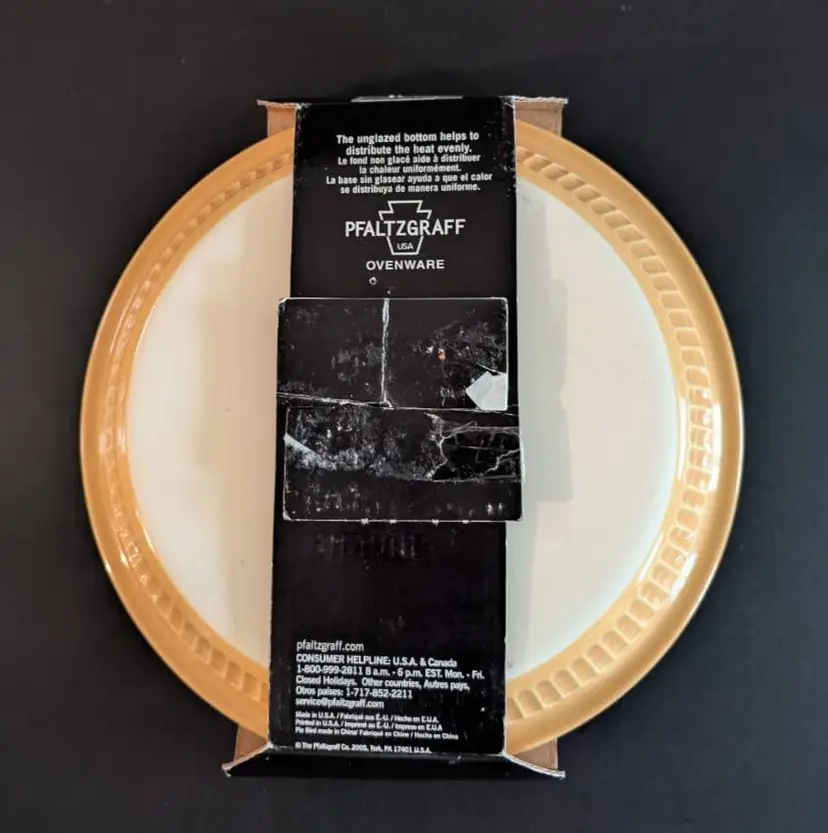 This is a vintage Pfaltzgraff Perfect Pie plate- mustard yellow in color- that includes a bonus pie bird vent which is a rooster! Made in the USA Released in 2005. The bottom of dish is unglazed- which helps to distribute the heat evenly. It is Oven, dishwasher, and microwave safe. It is a deep 9 inch dish- Holds 5 cups. This is a new in the original packaging Pie plate and rooster pie bird. The cardboard sleeve does have some wear from being stored without use. Please see photos. Both pieces are in excellent shape. No chips, cracks or crazing. Non smoking home non pet home. Just perfect for Thanksgiving and upcoming Holidays!