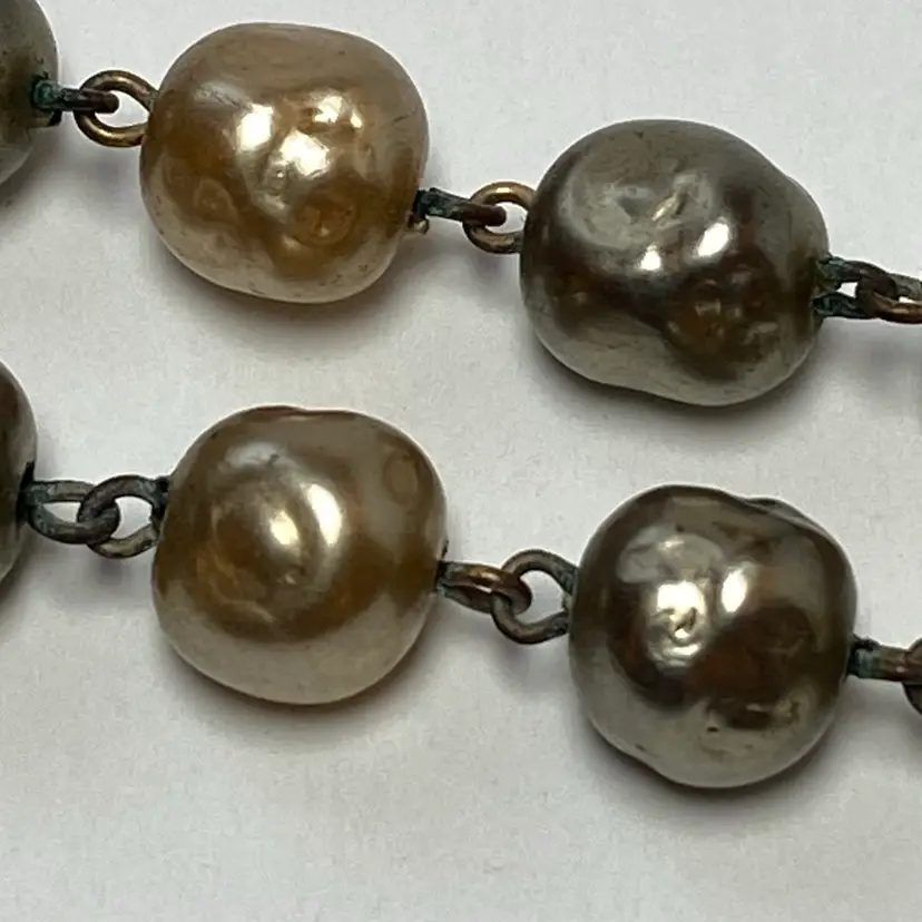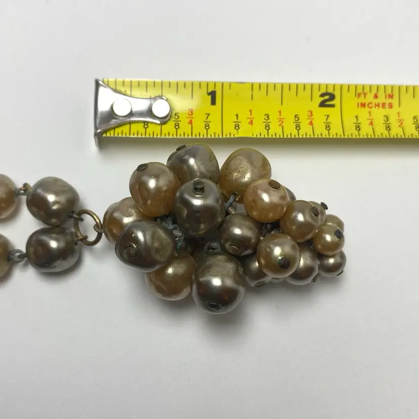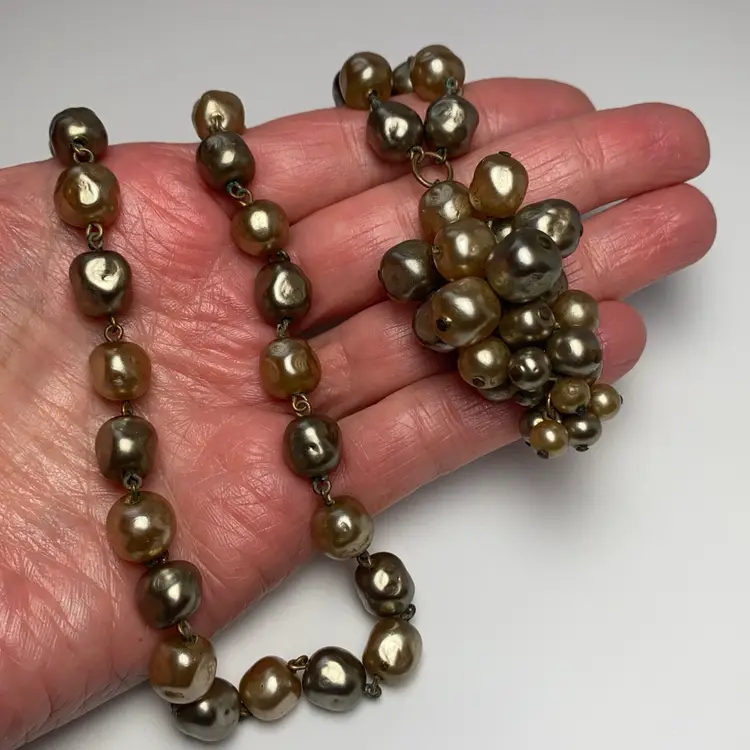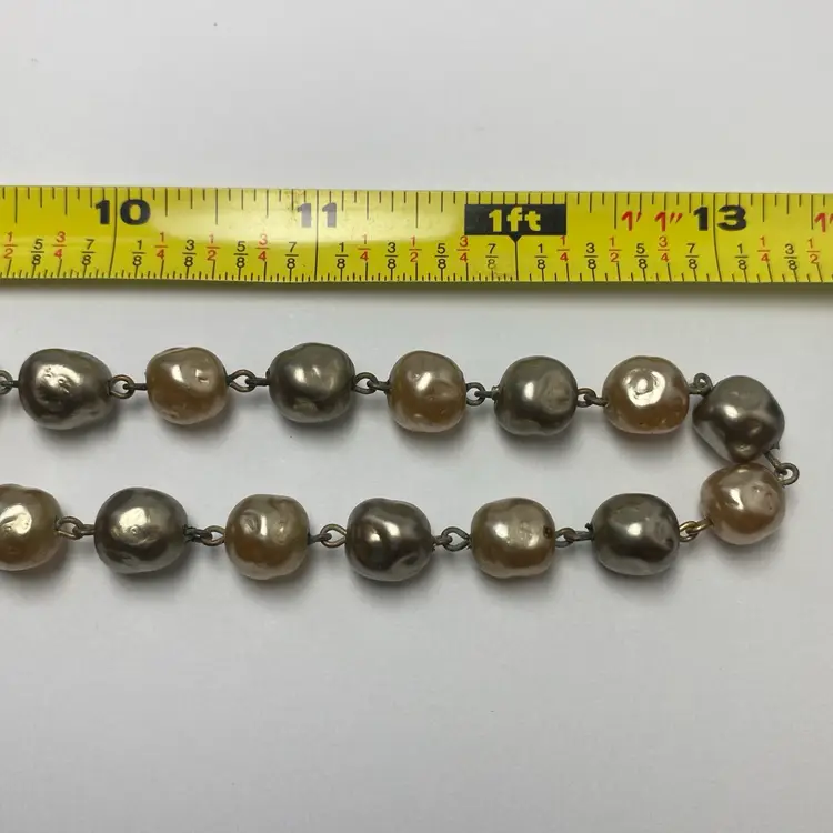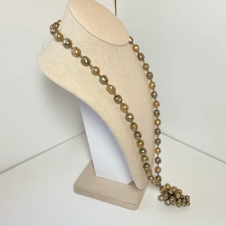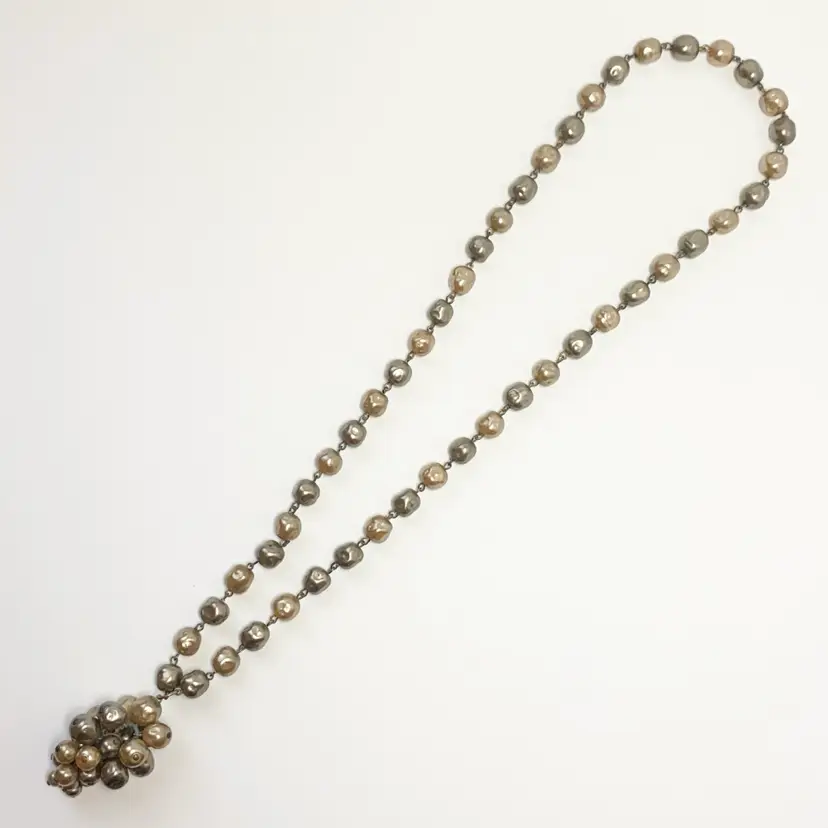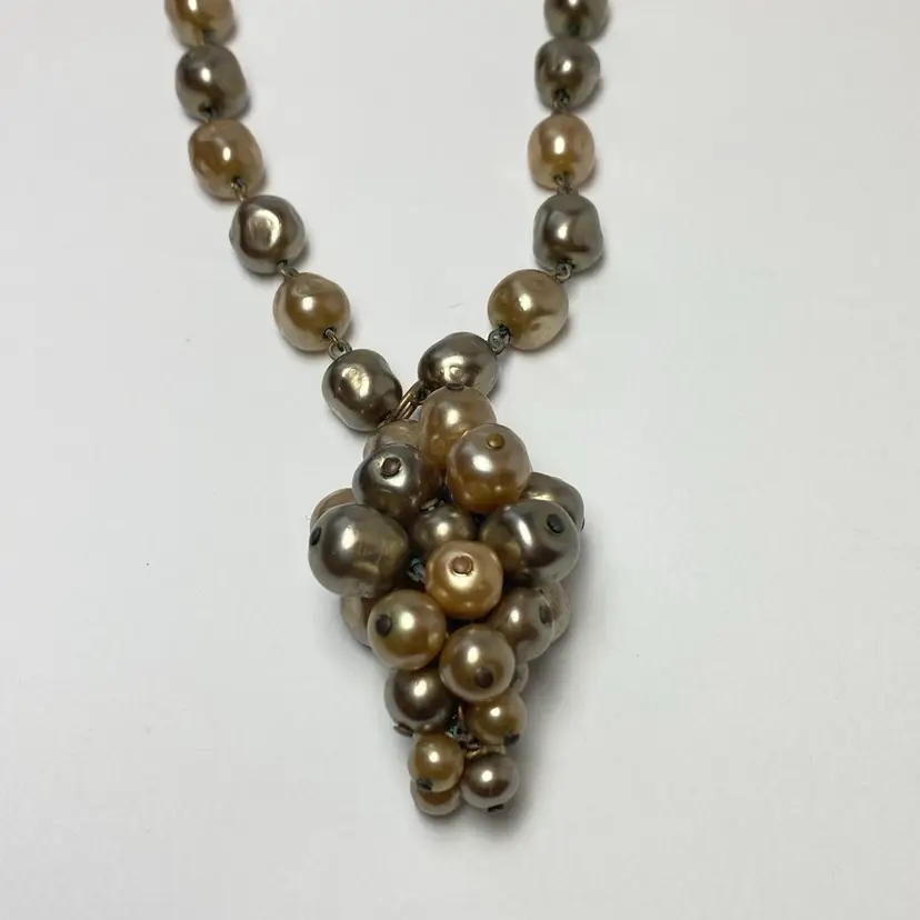 Add some vintage charm to your jewelry collection with this beautiful glass faux baroque pearl beaded pendant necklace. The pendant features a cluster of gray and champagne-colored glass pearl beads. The necklace is 26 inches long. Perfect for those who love beauty, art, family and friends, love, bohemian style, travel and places, retro fashion, and costumes, this necklace is an original piece that will make a statement with any outfit. This necklace is sure to be a conversation starter and a unique addition to your collection.