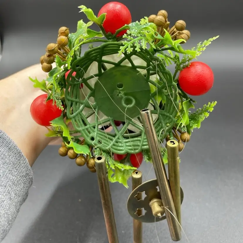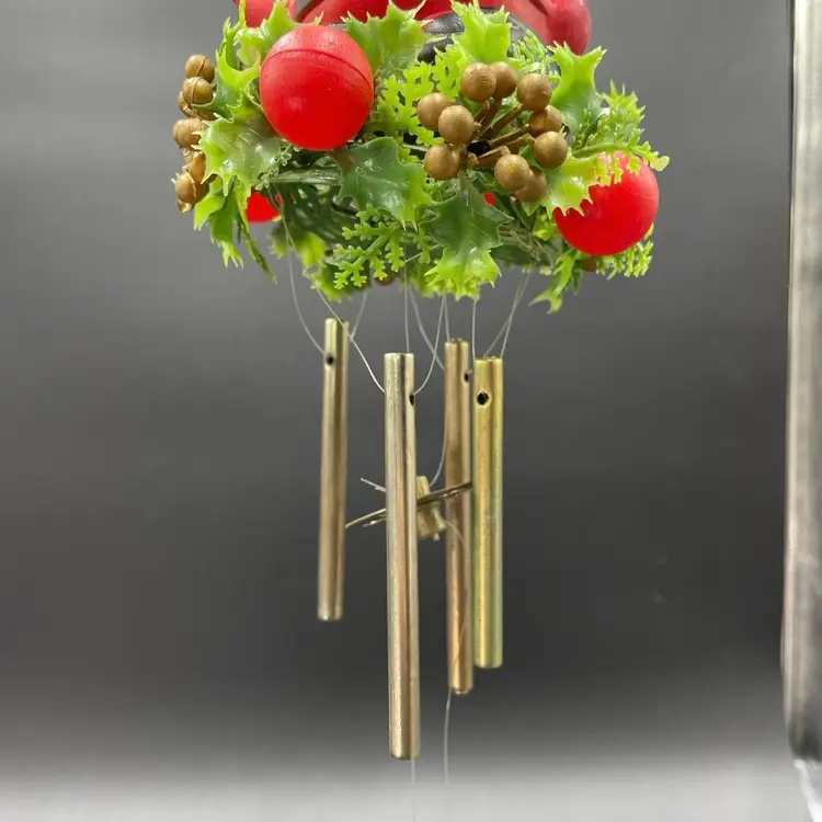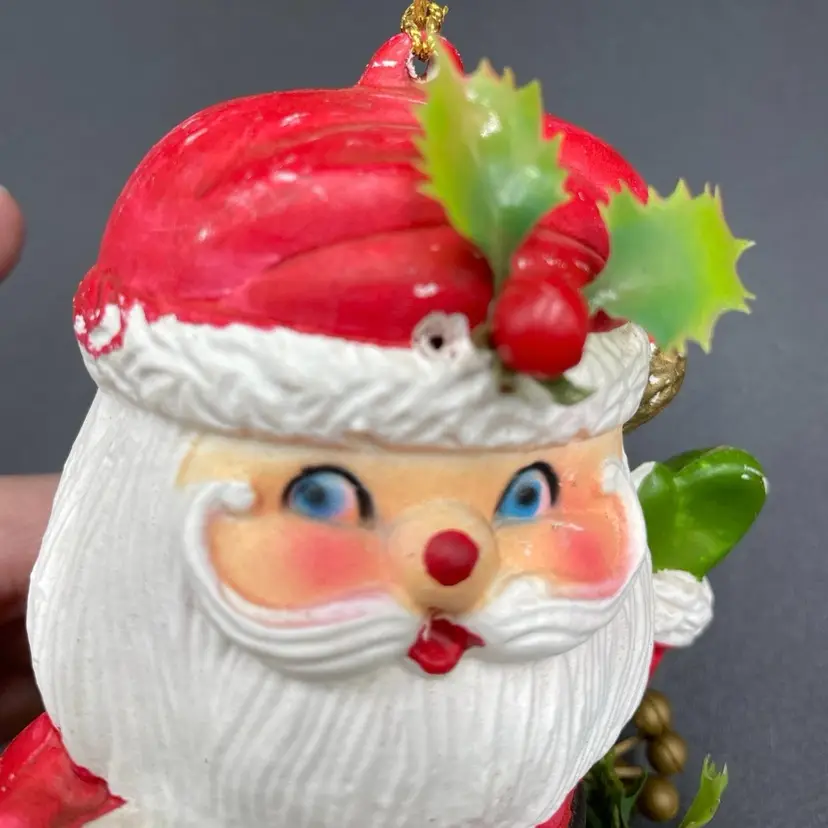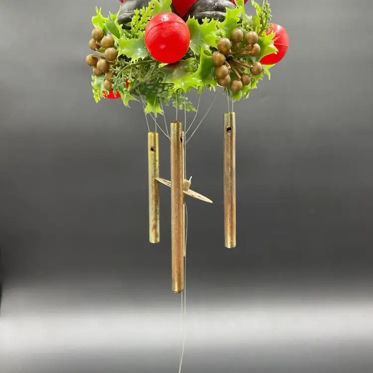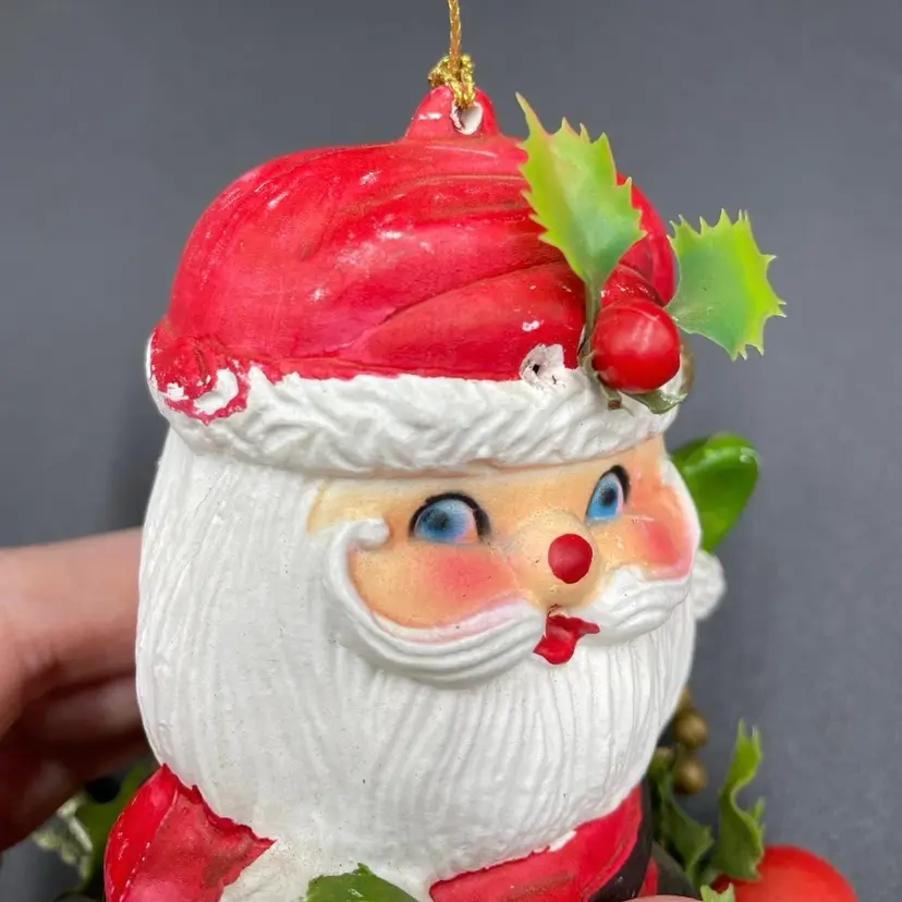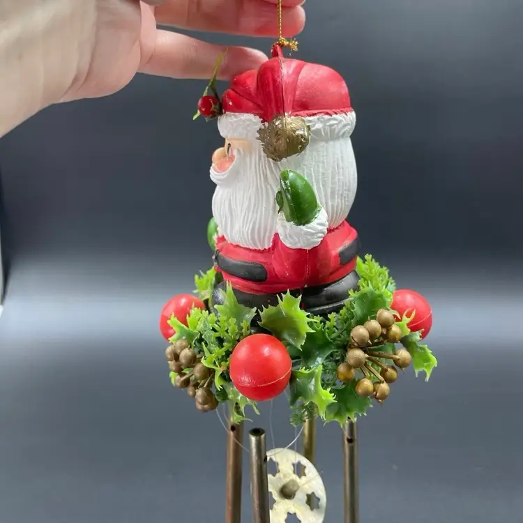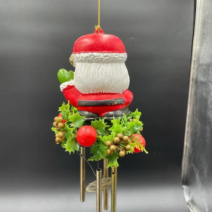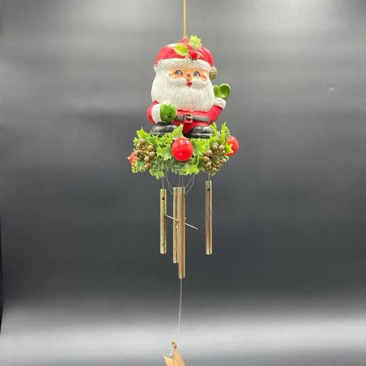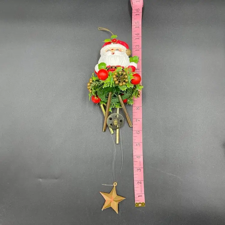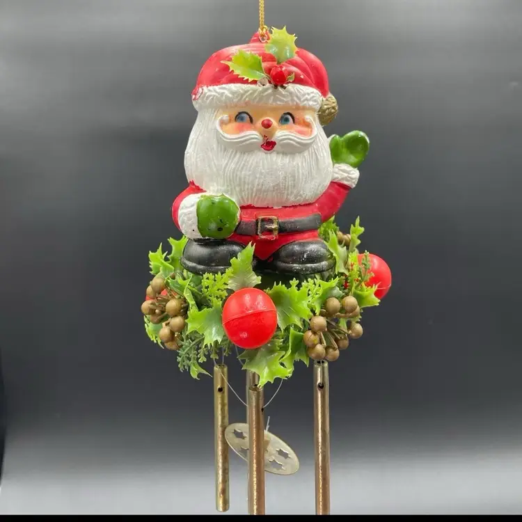 This is a vintage plastic blow mold Santa Claus and holly wind chime. Measures approximately 14" long from the top of Santa to the plastic star at the bottom. There is some paint loss due to age, and there appears to be a holly leaf missing from Santa's hat, as shown in picture 11. No major flaws.