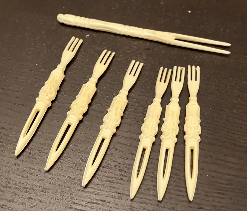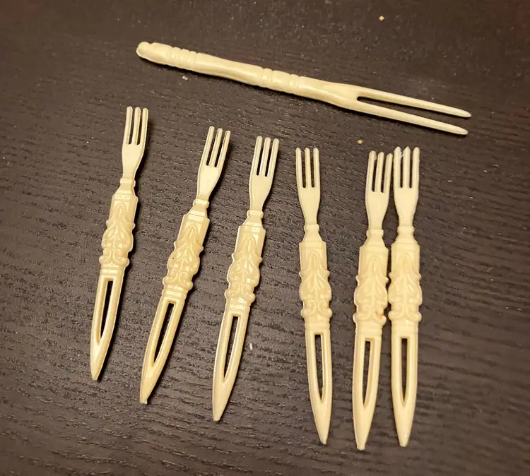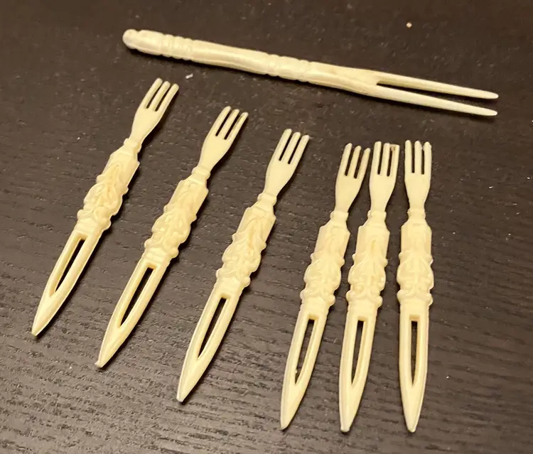 Used for serving appetizers, olives, small food items. Likely made in the 1960s. 6 small forks (3 1/2" long) and 1 larger one (4 1/2" long)