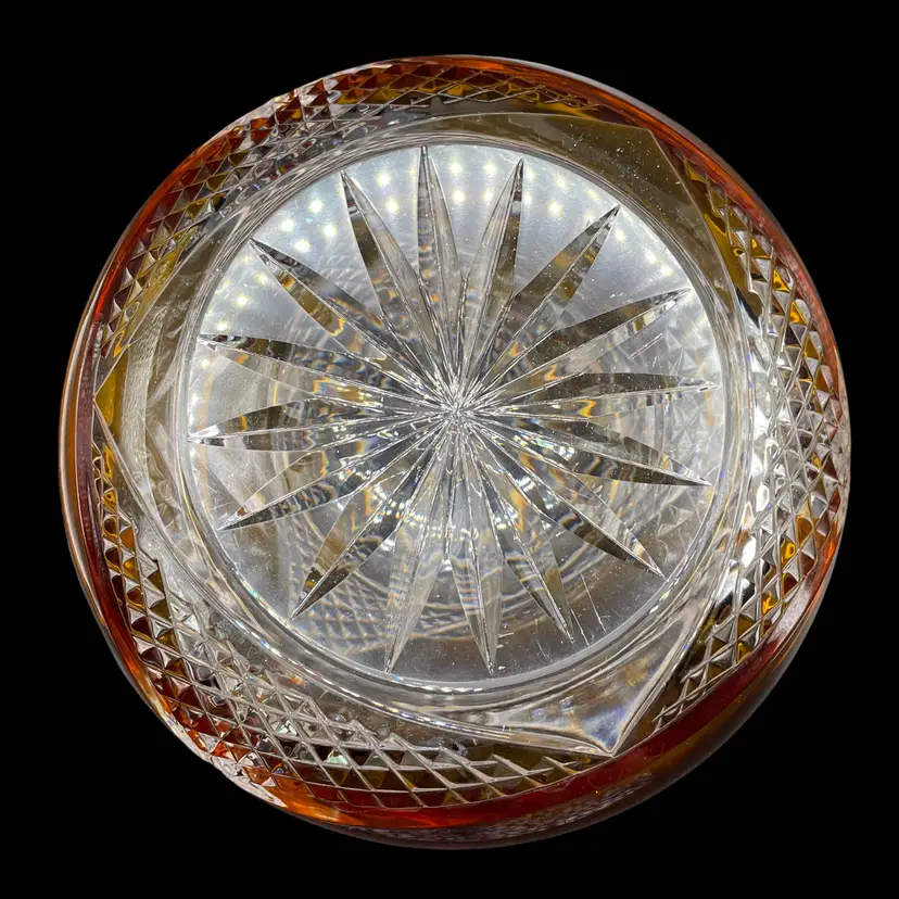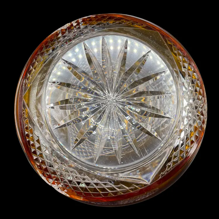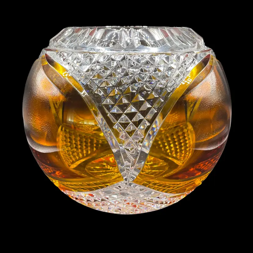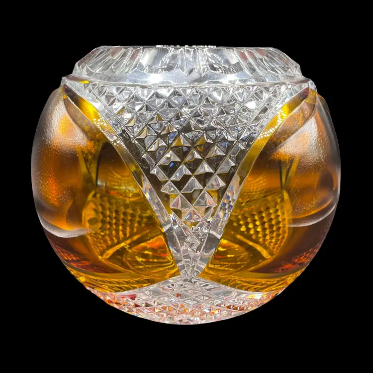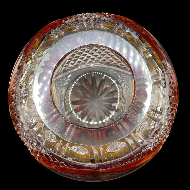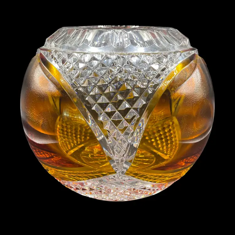 This vintage Polish lead crystal bowl features a beautiful amber-colored cut to clear glass design. Measuring 5.5x6 inches, it is the perfect size for all occasions. The round shape and medium size make it a versatile addition to any home decor. Crafted using a 24% leaded glass technique, this vase showcases a stunning crystal finish. The intricate cut to clear design adds a touch of elegance to any room. Whether you're a collector or simply looking for a unique piece, this vase is an original and authentic addition to your collection.