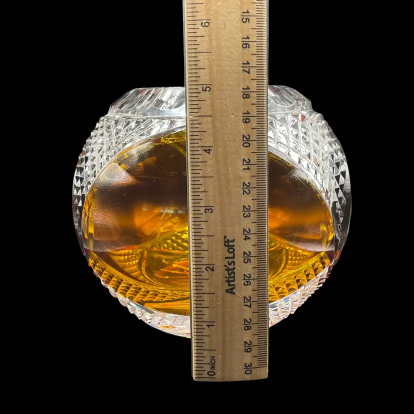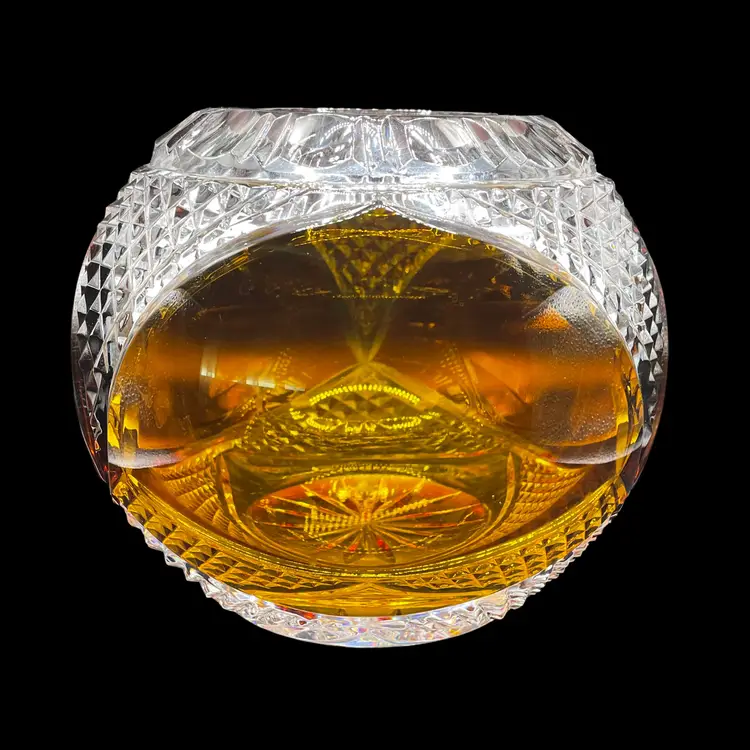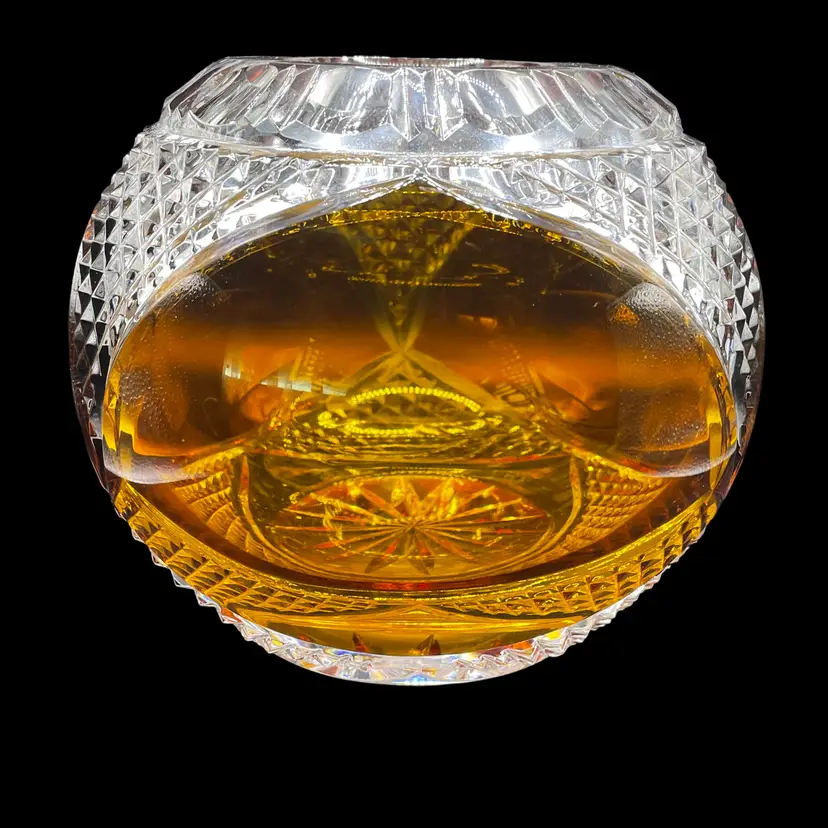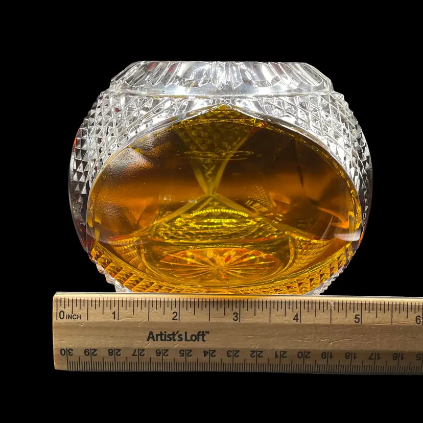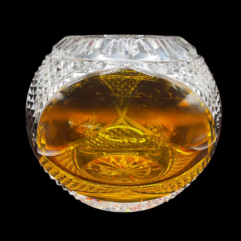 This vintage Polish lead crystal bowl features a beautiful amber-colored cut to clear glass design. Measuring 5.5x6 inches, it is the perfect size for all occasions. The round shape and medium size make it a versatile addition to any home decor. Crafted using a 24% leaded glass technique, this vase showcases a stunning crystal finish. The intricate cut to clear design adds a touch of elegance to any room. Whether you're a collector or simply looking for a unique piece, this vase is an original and authentic addition to your collection.