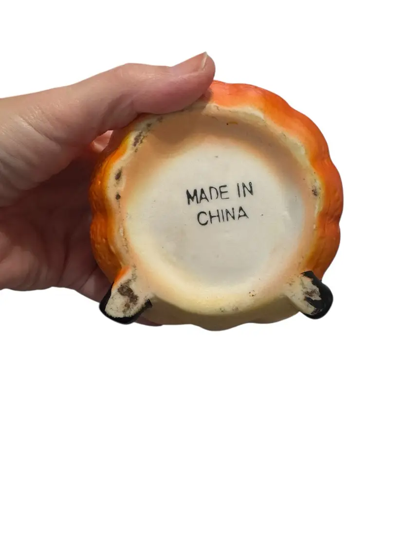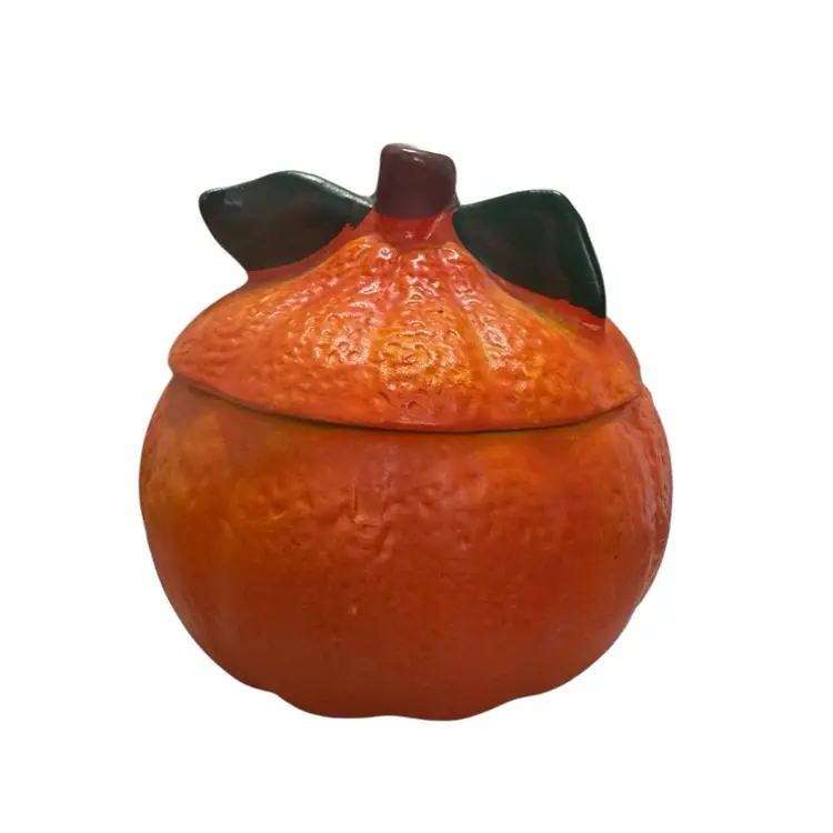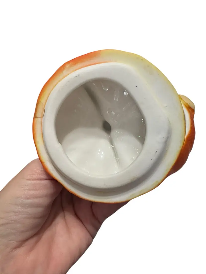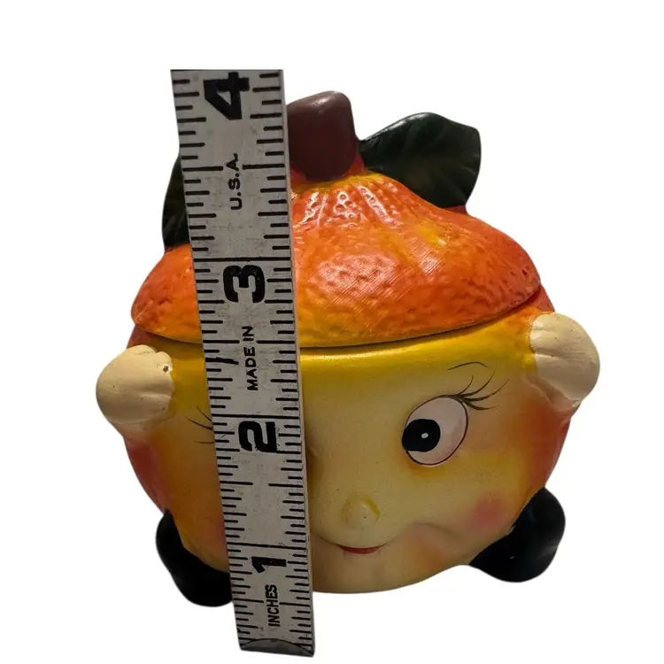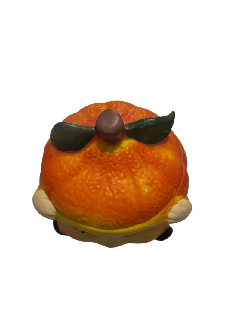 Vintage porcelain anthropomorphic orange covered dish. This little guy is so cute!! I mean look at this face!!! He is excellent condition. No chips, no cracks. See pictures for measurements.