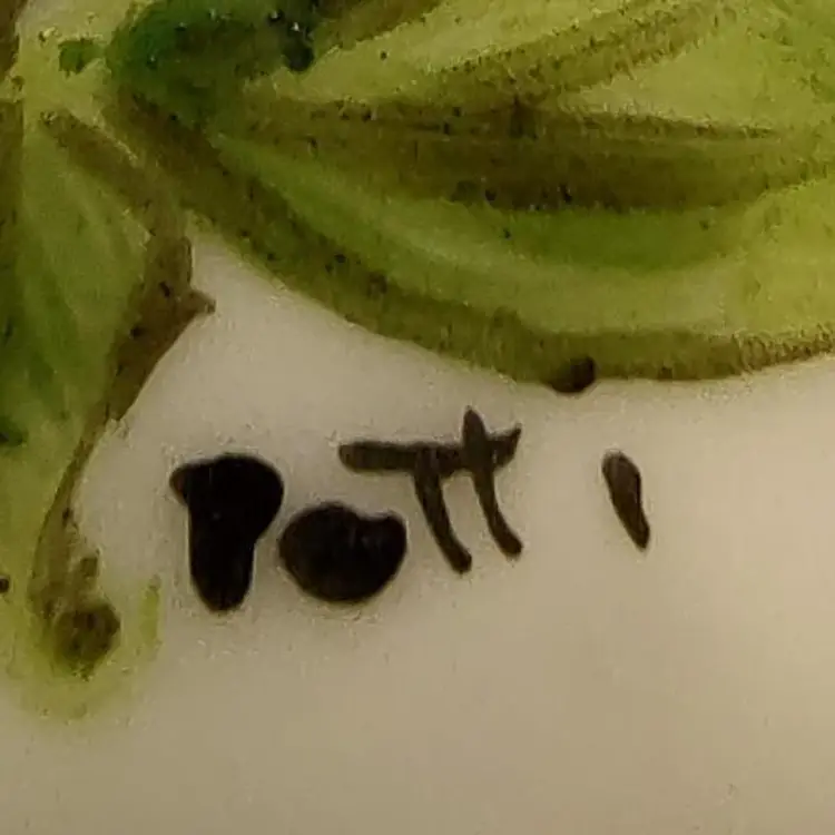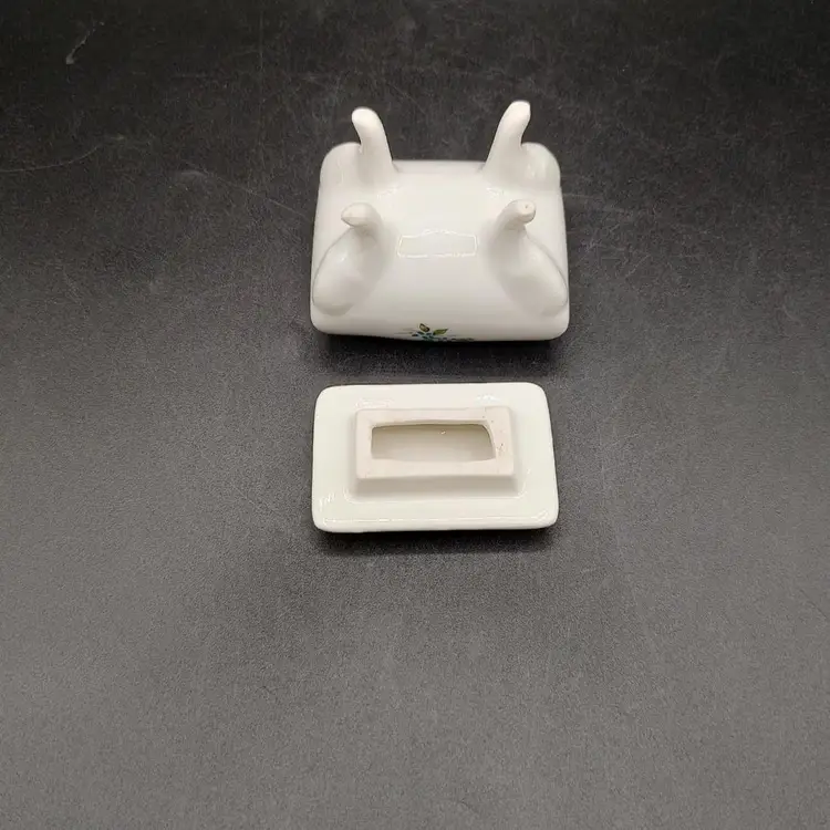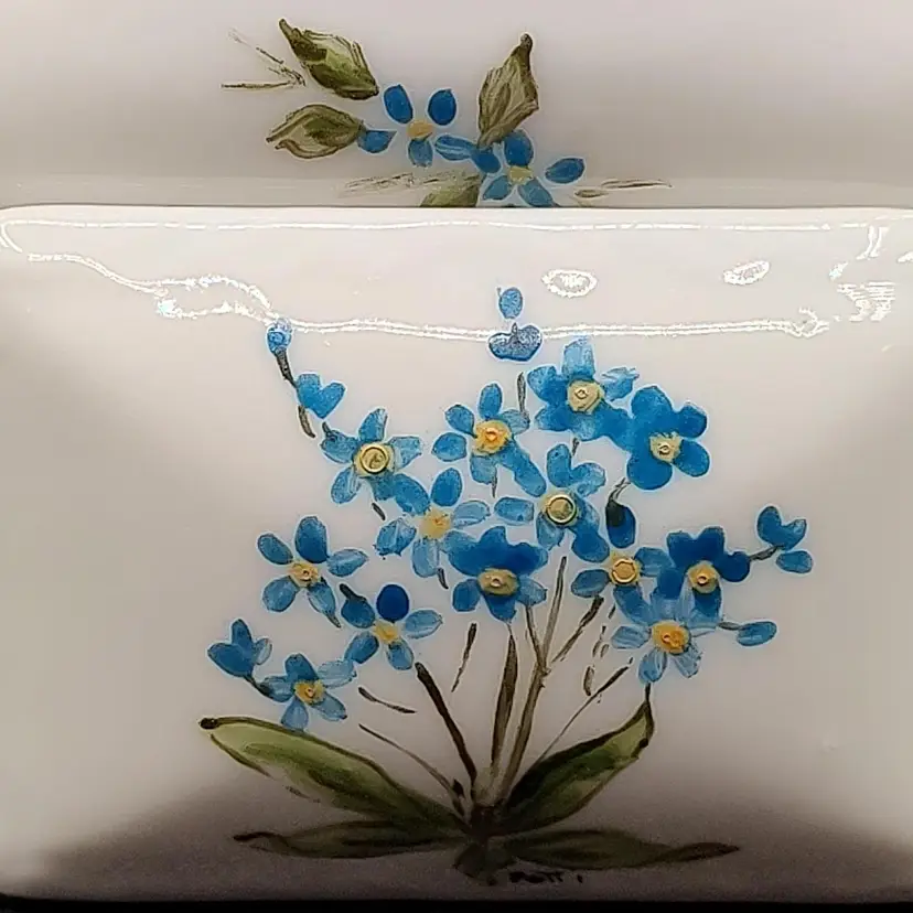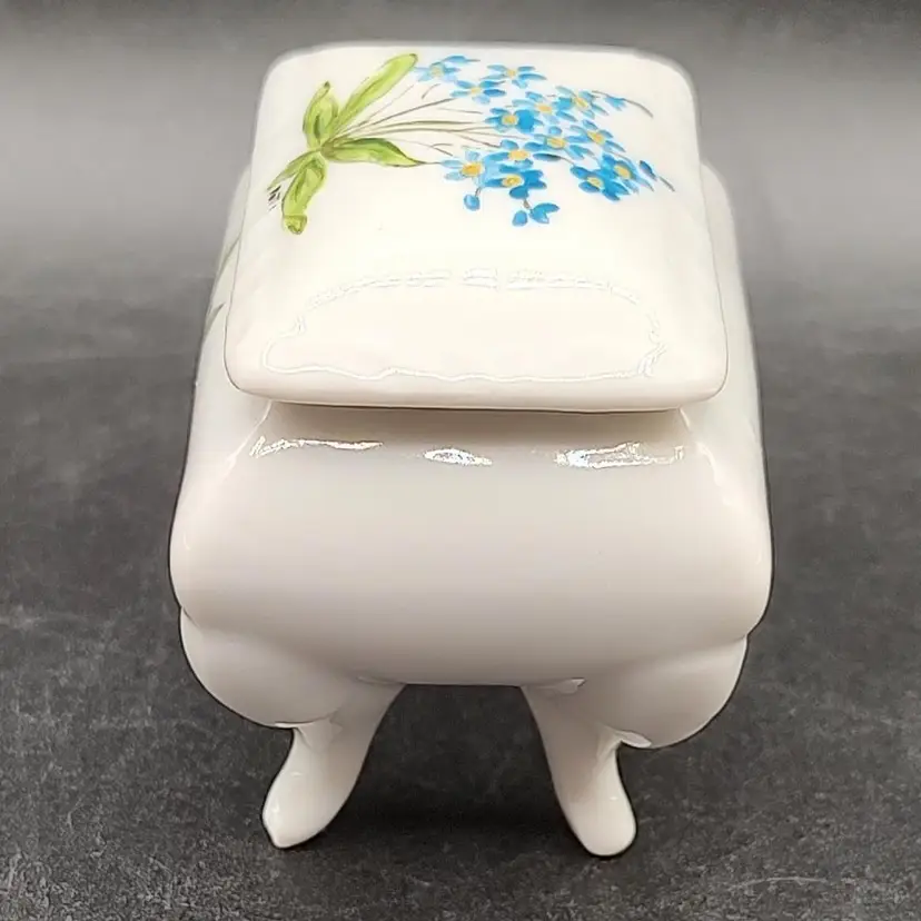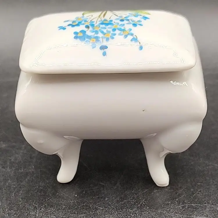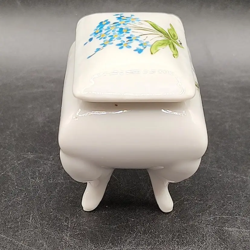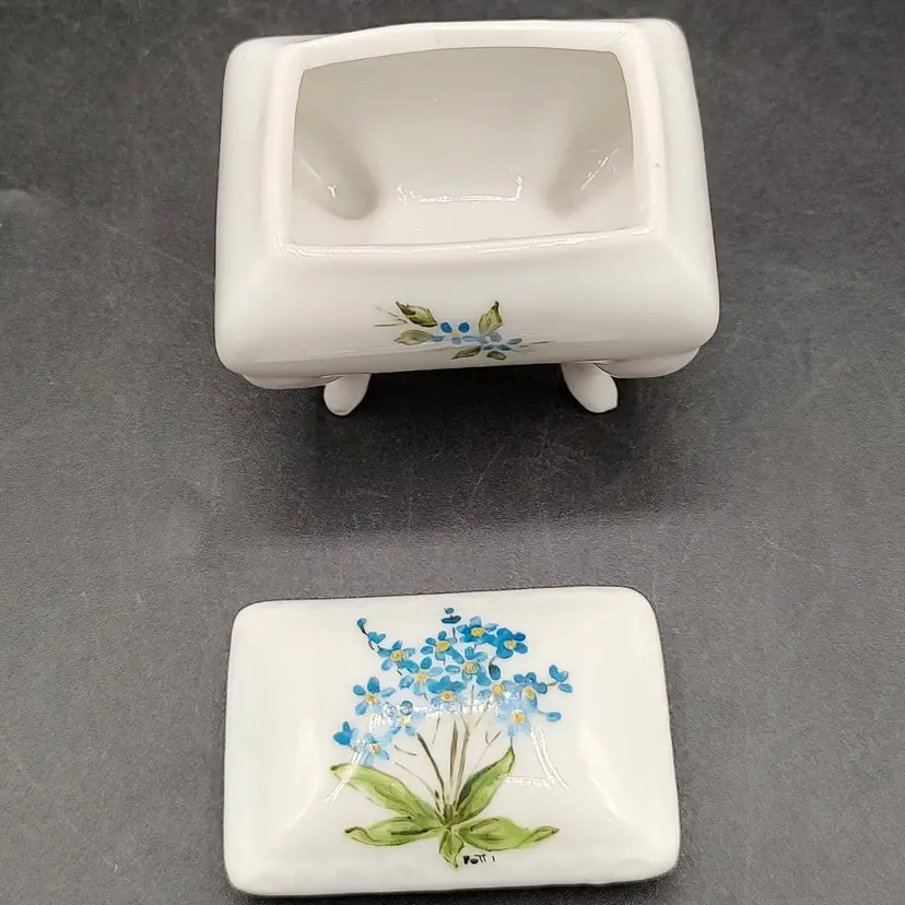 Vintage Porcelain Hand Painted Blue floral footed Pill Box Signed By Artist Patti in good condition with no chips or cracks height 2.5" x width 1.5" x length 2.5".