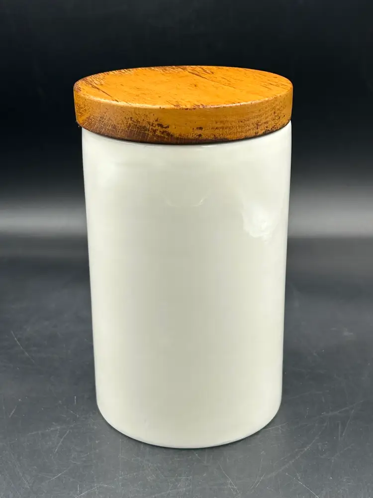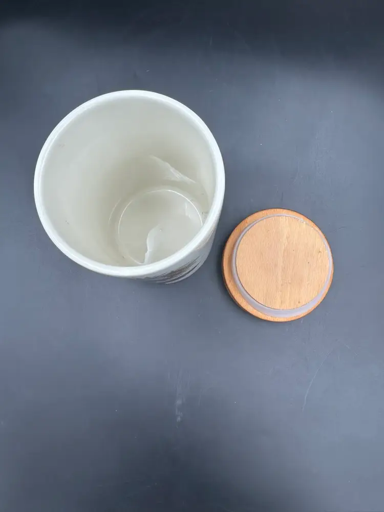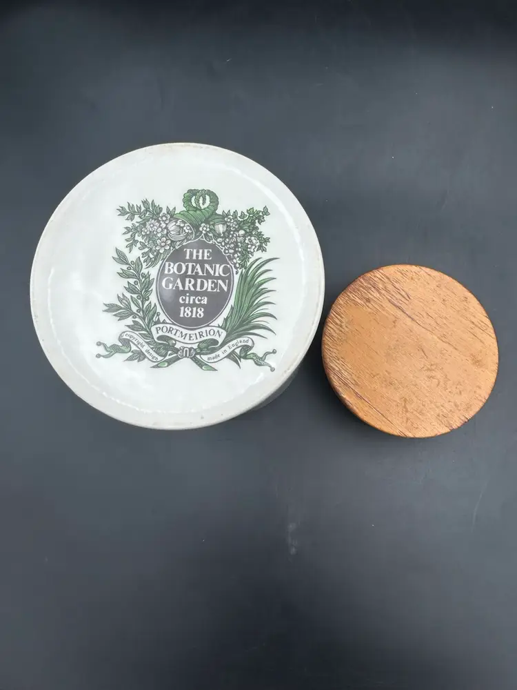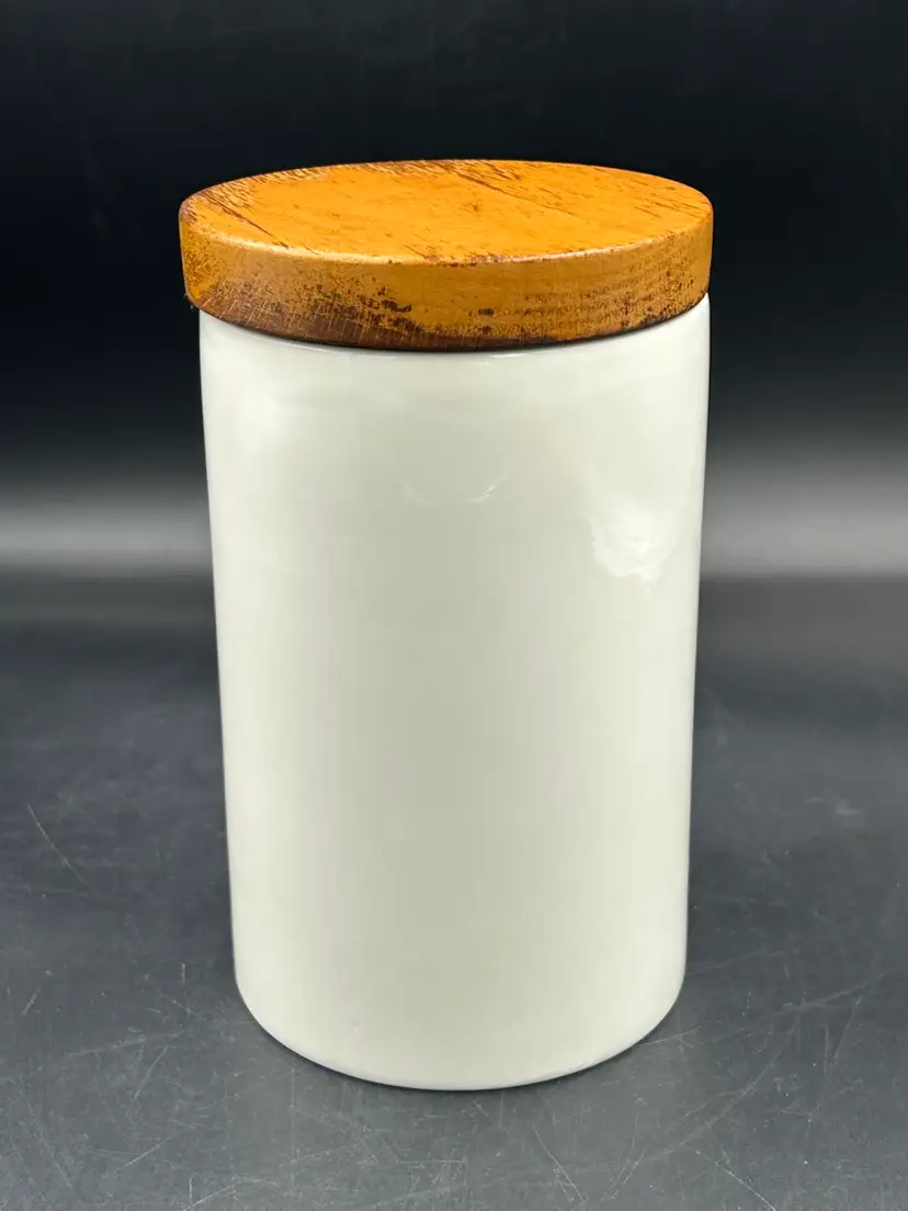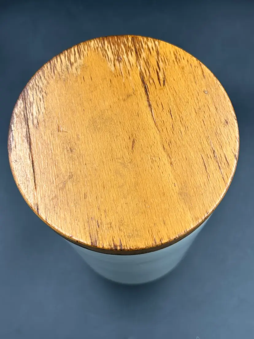 Age related wear on finish on lid, no chips or cracks. 6.75H x 4W