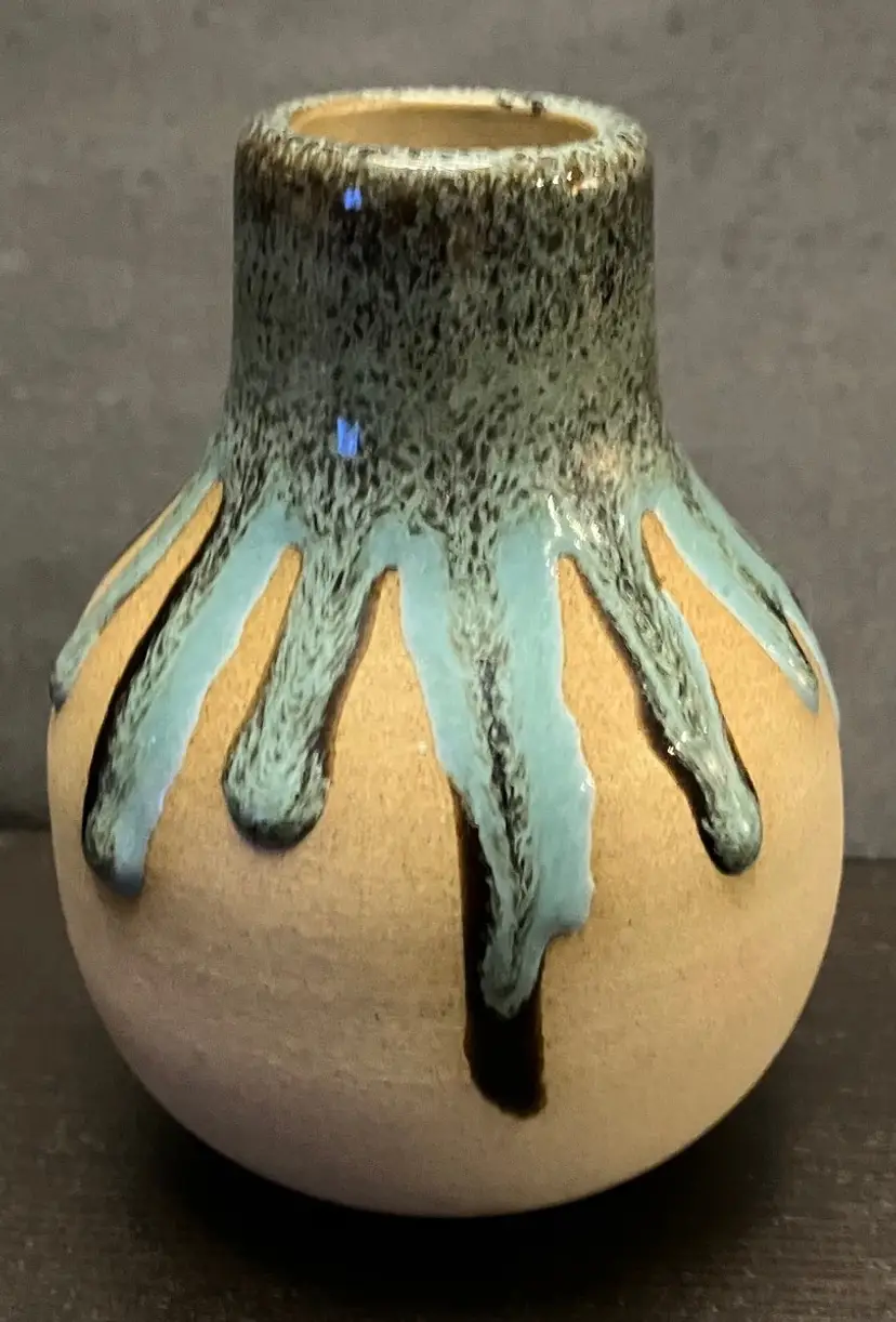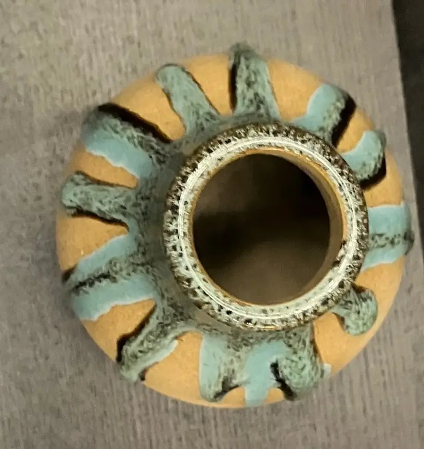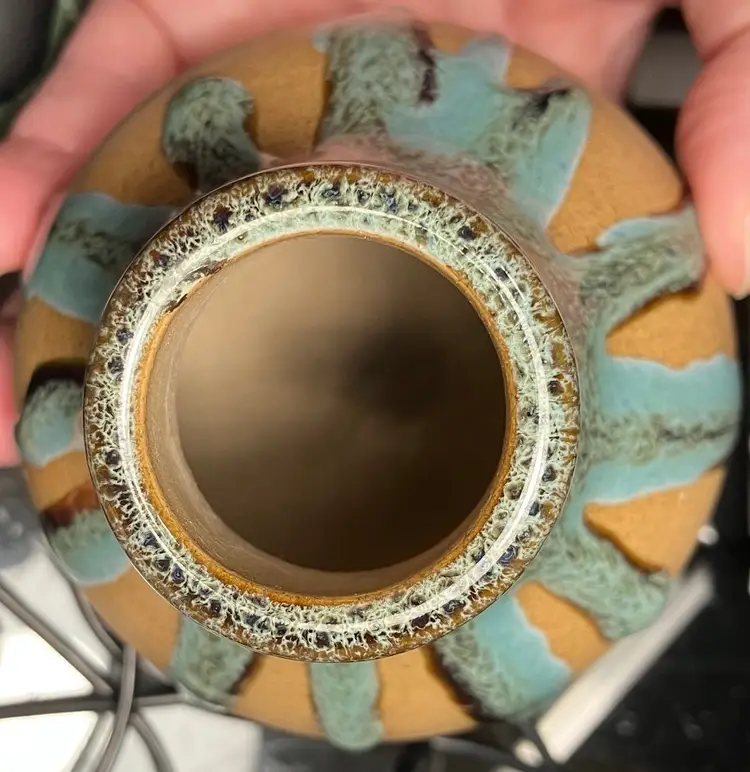 No chips or cracks. Measures 4 1/2" tall, 1 1/2" opening, Greatest diameter about 3 1/2".Looks like there is a marking on the bottom but I can't tell what it is.