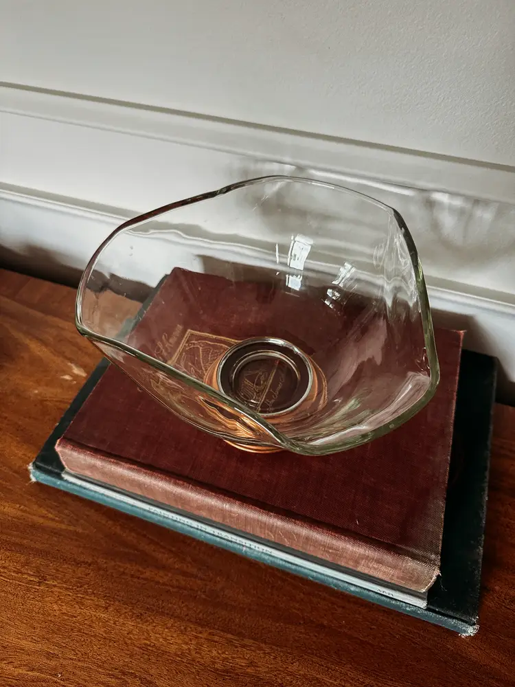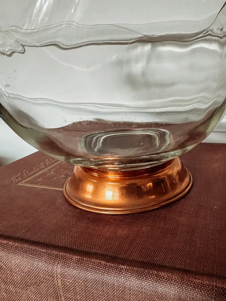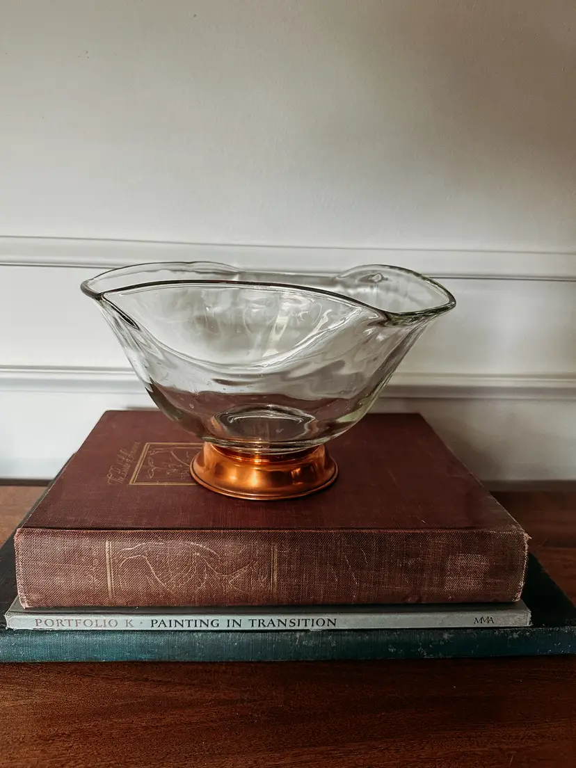 Add a touch of elegance to your dining table with this unusual triangular shaped salad fruit serving bowl that features a copper pedestal base. The bowl would also be great used as a punch bowl or chock full of snacks. It measures approximately 6-1/8" H x 9-3/4" W. Other than normal wear which includes minor manufacturing flaws and utensil scratching commensurate with age, this bowl is in very good vintage condition!