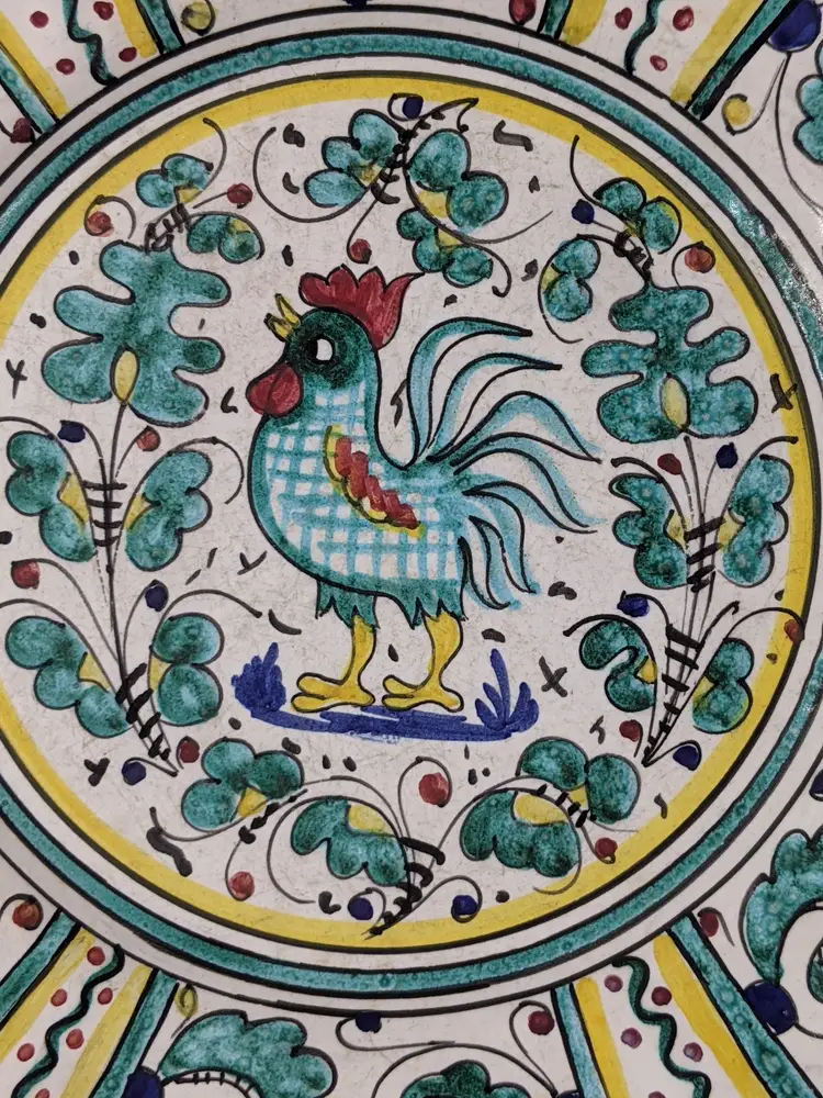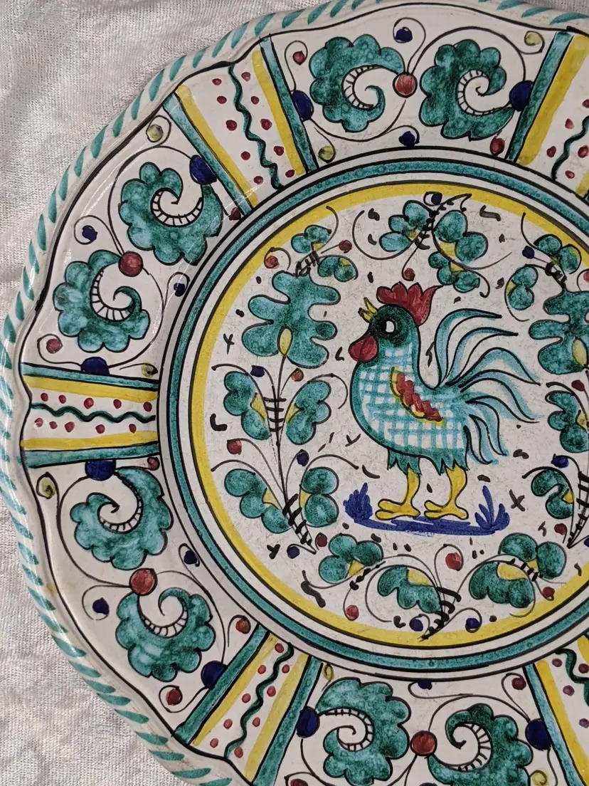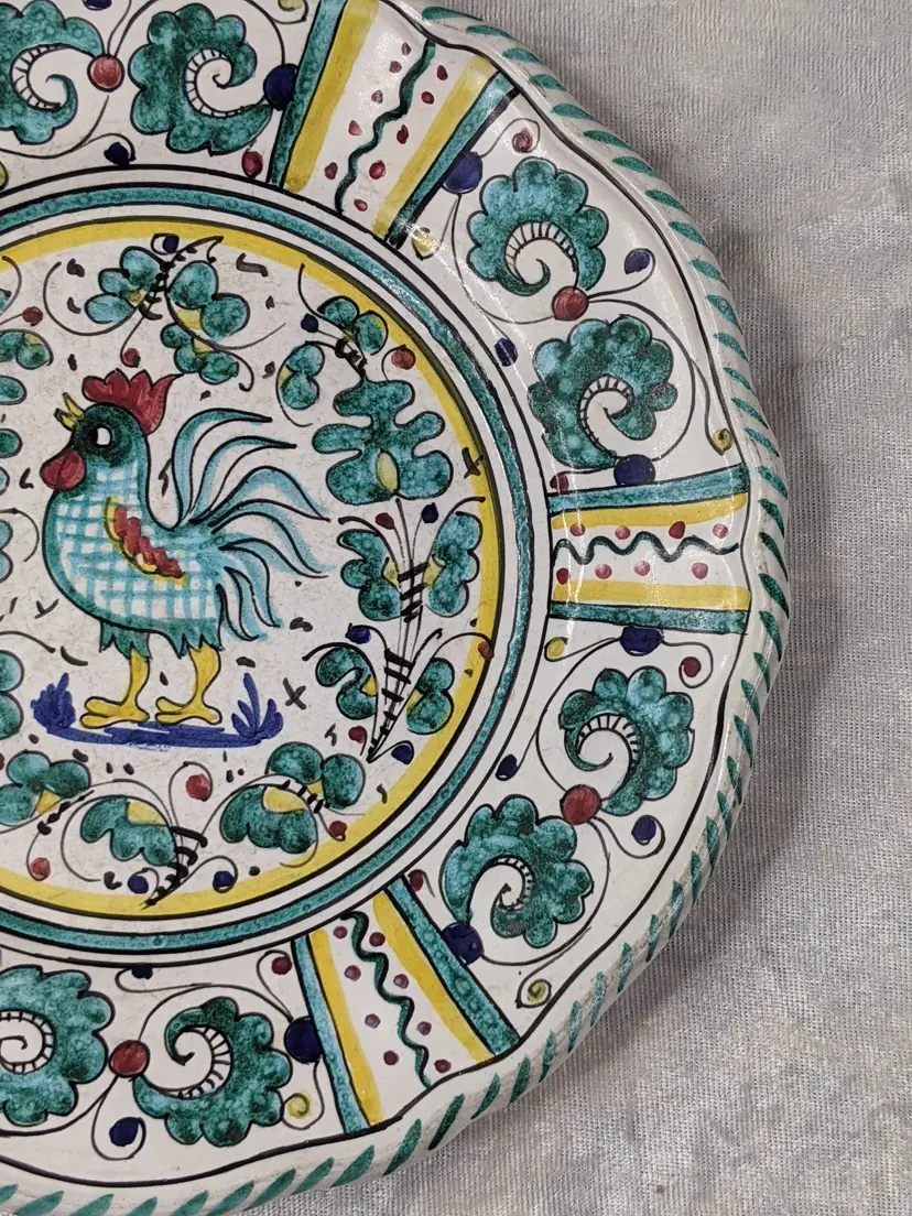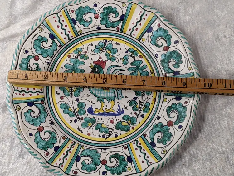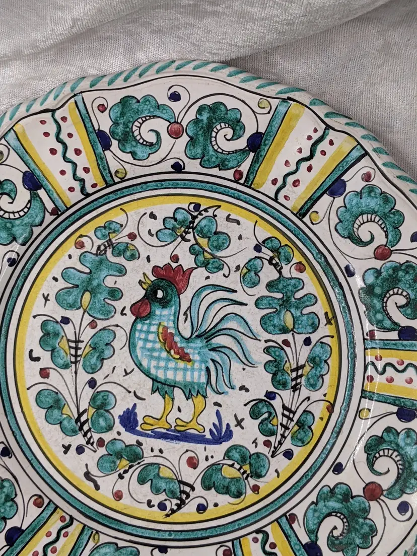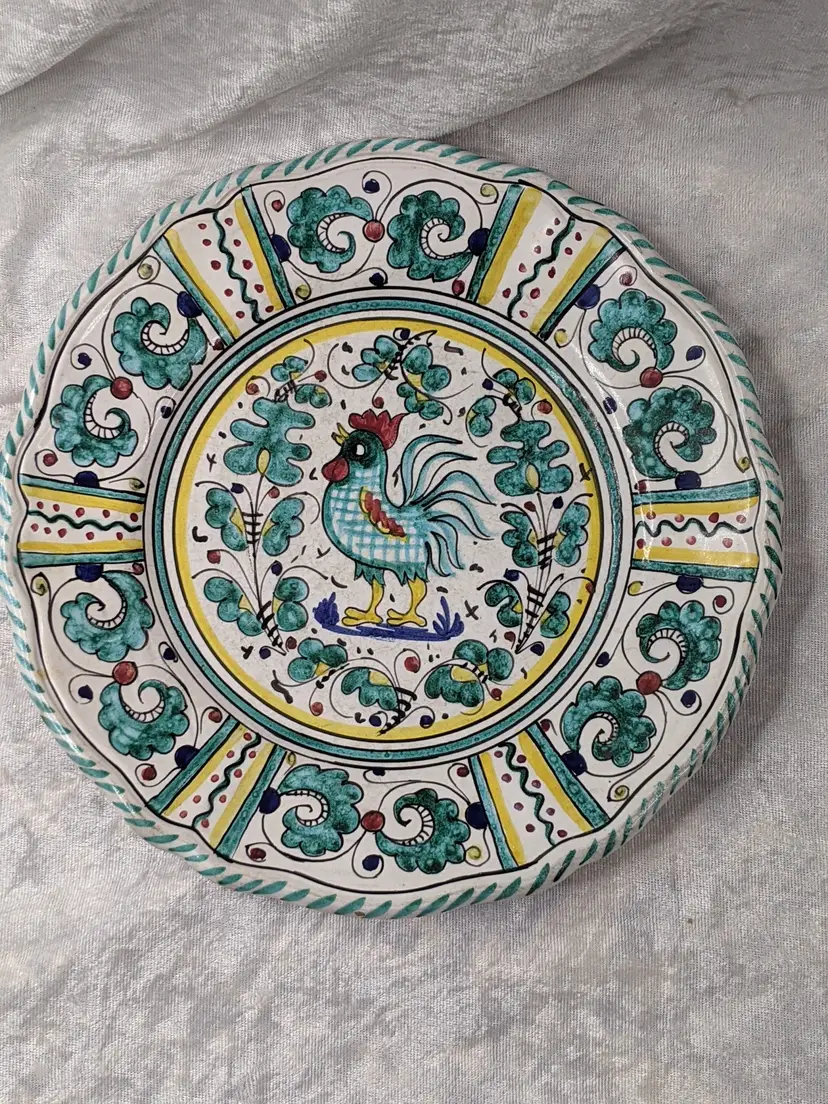 Vintage PV Peasant Valley Deruta Italy Stemil Teal BLUE ROOSTER Dinner Plate 10" Checker chicken Full Pattern Wall hanging decor or replacement. Fits many decors Grandma chic, cottagecore, country cottage, Farmhouse. Very good condition Clean with no damage.no chips or cracks no weird smells. Please check the photos for details. Comes from a smoke free home. We do have pets.