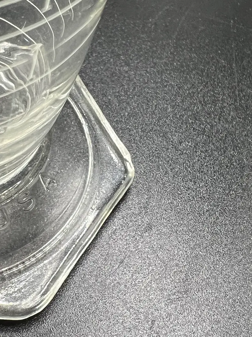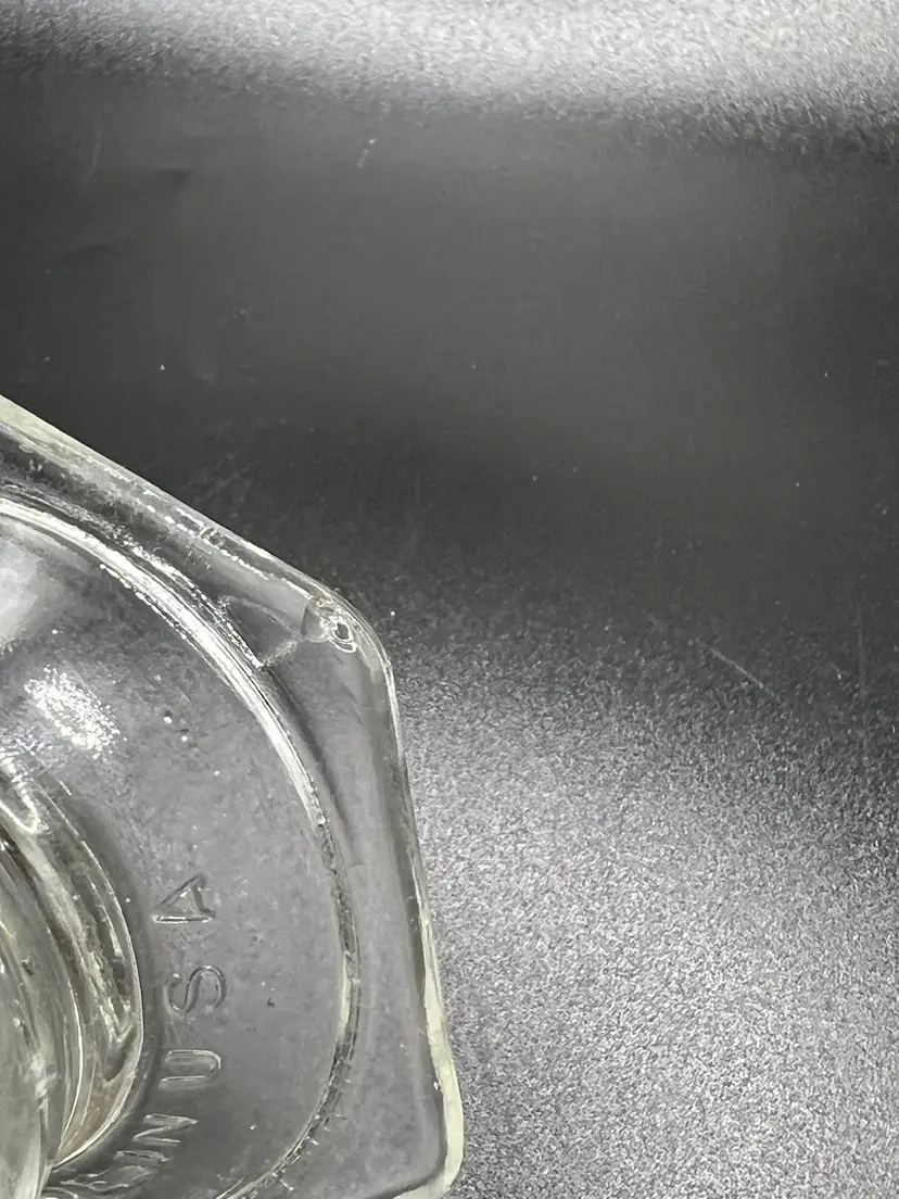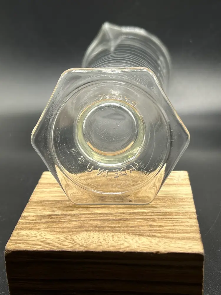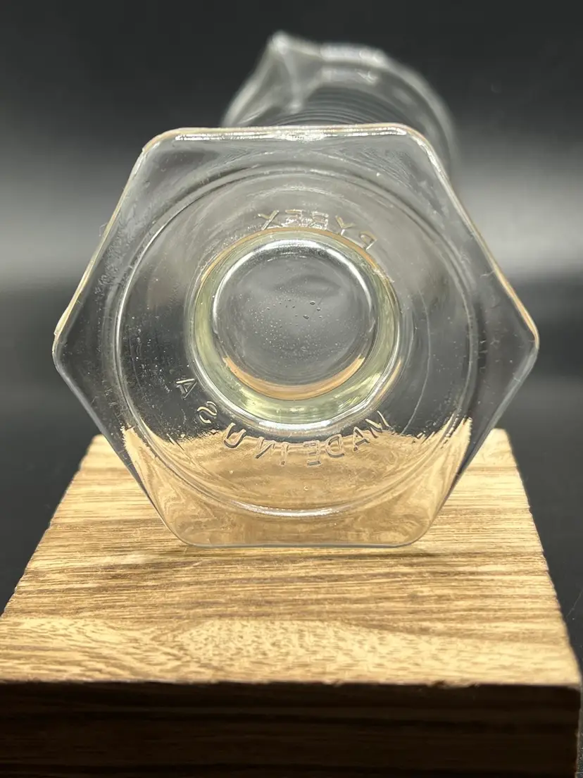 7.5” tall, 2.5” footed hexagon embossed with “PYREX ~ MADE IN USA” on bottom (there is a tiny chip on one corner of footed bottom•pls see photos). Top is spouted and is 3” in diameter.