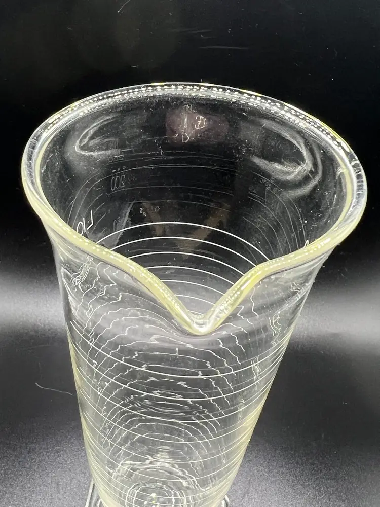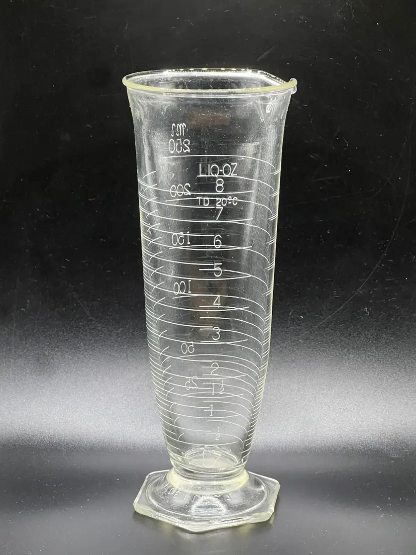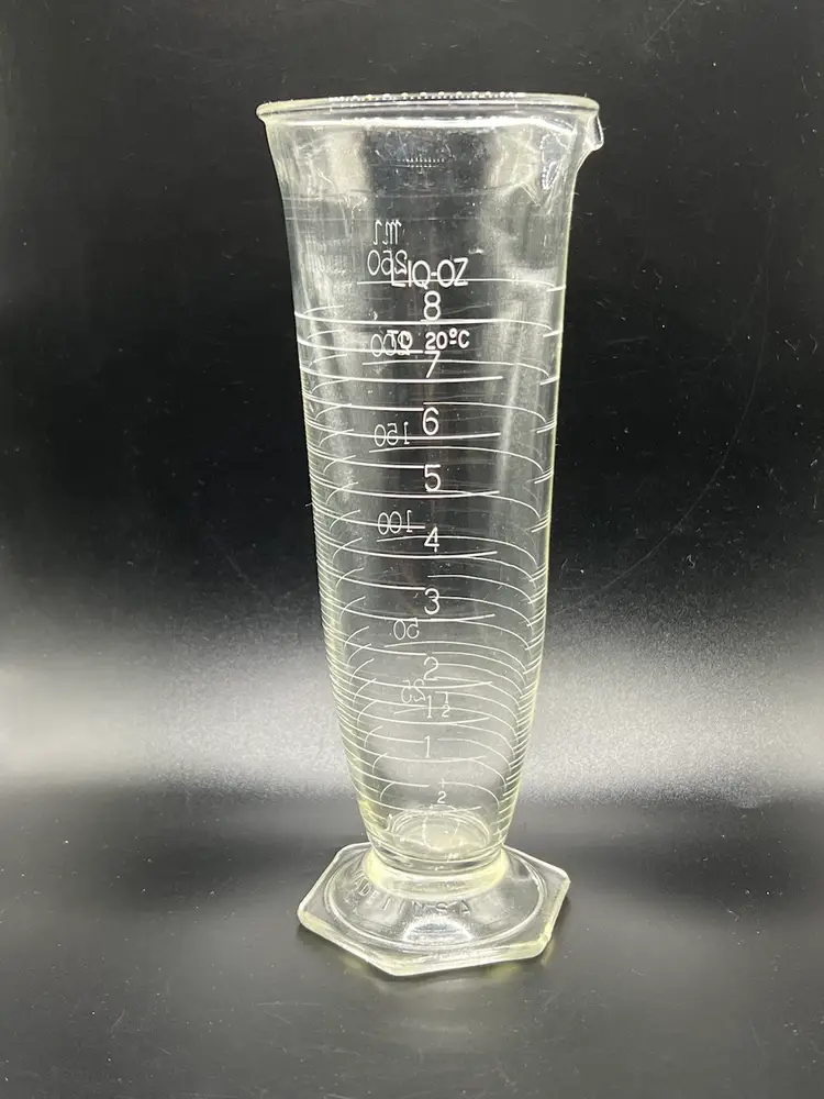 Measurements have been etched in glass. In one side up to 8 LIQ-OZ, and up to 250 ml on the other.