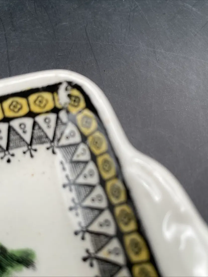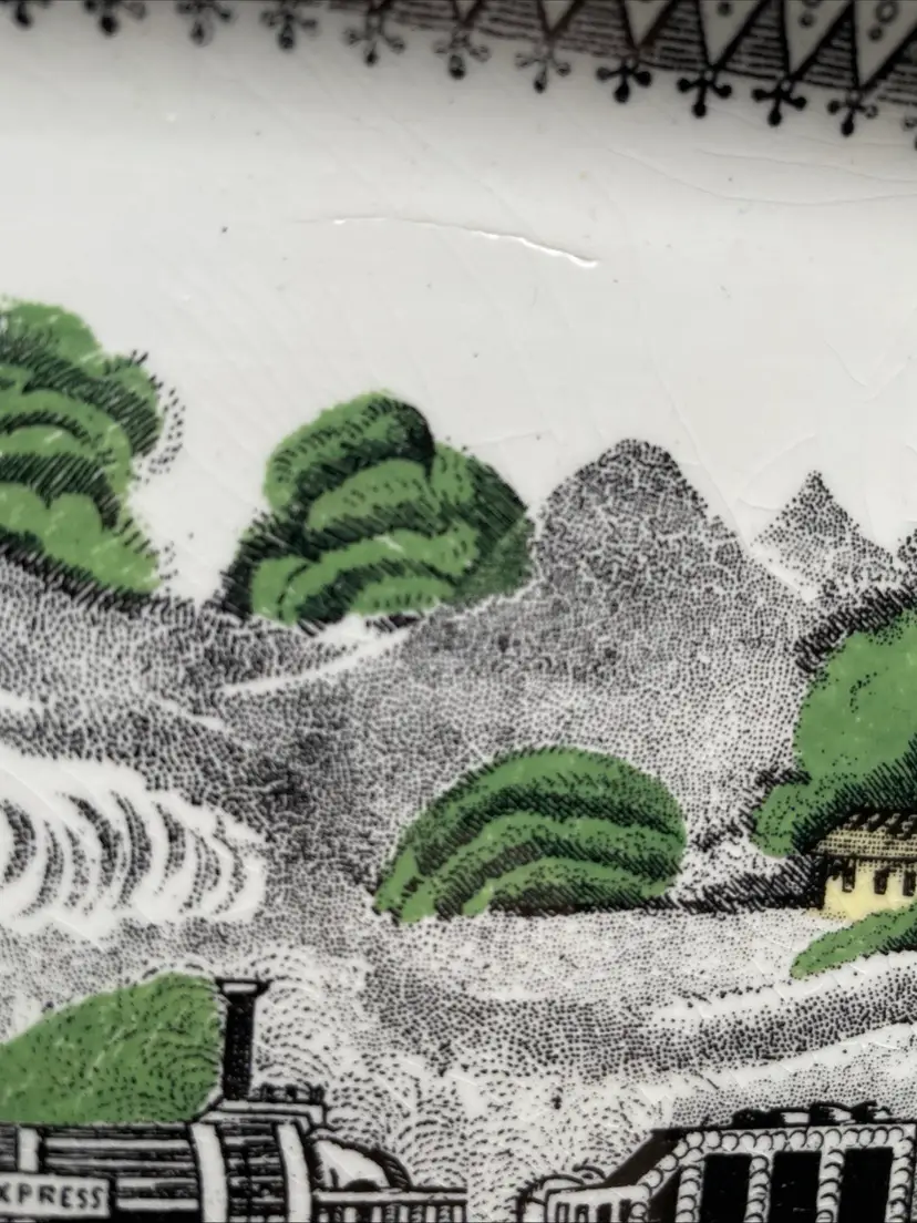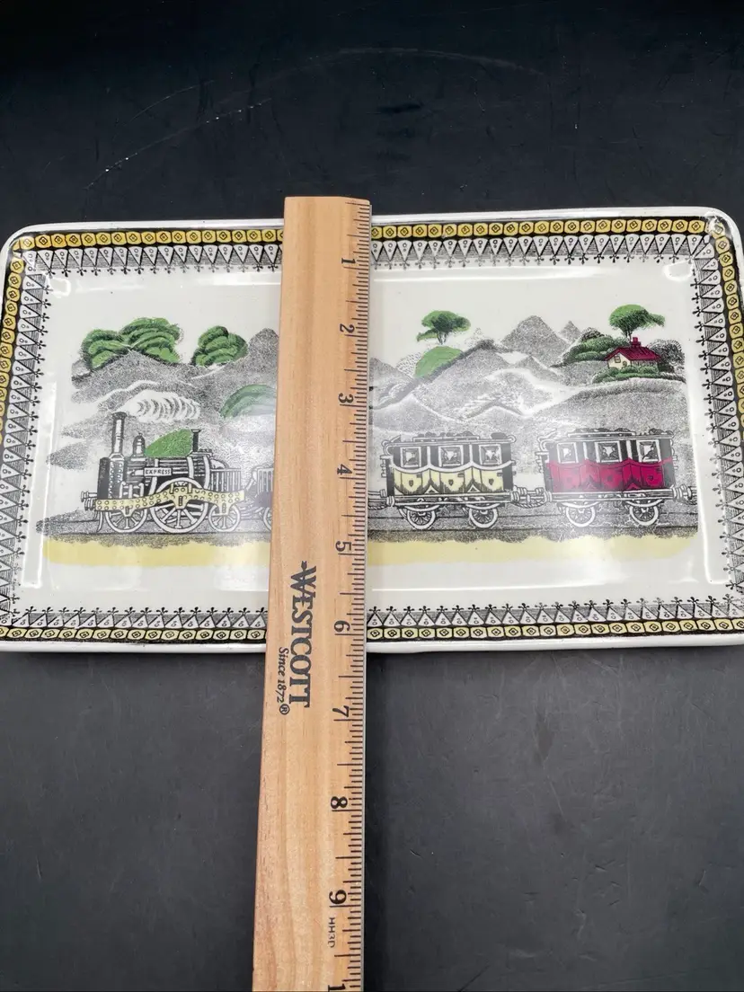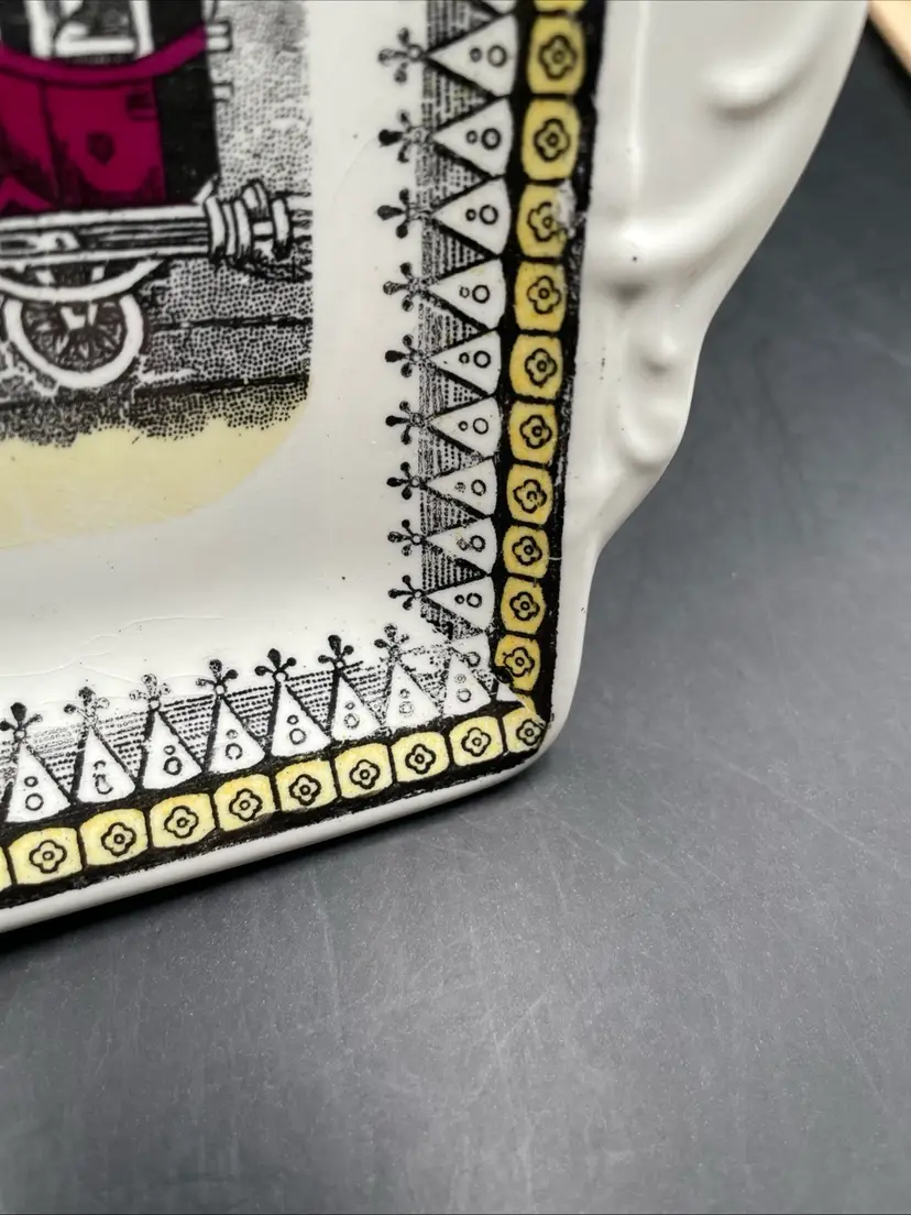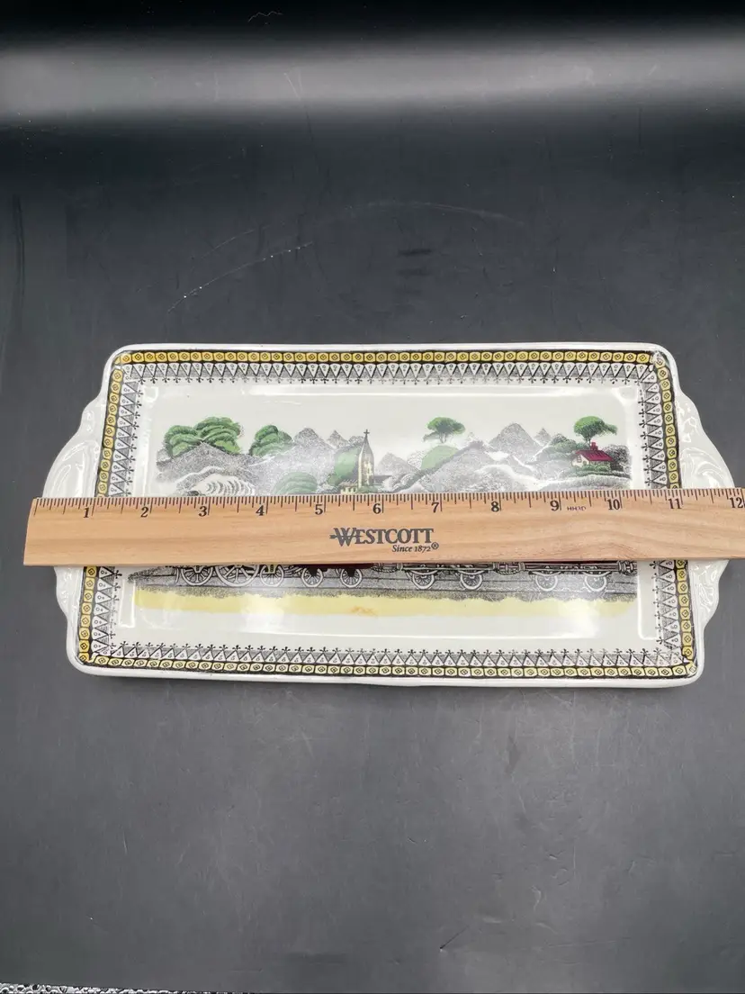 Approximately 12” x 6”. Corners where stencils meet are not perfect. Has a scratch I tried to capture in pictures and has some crazing. No chips.