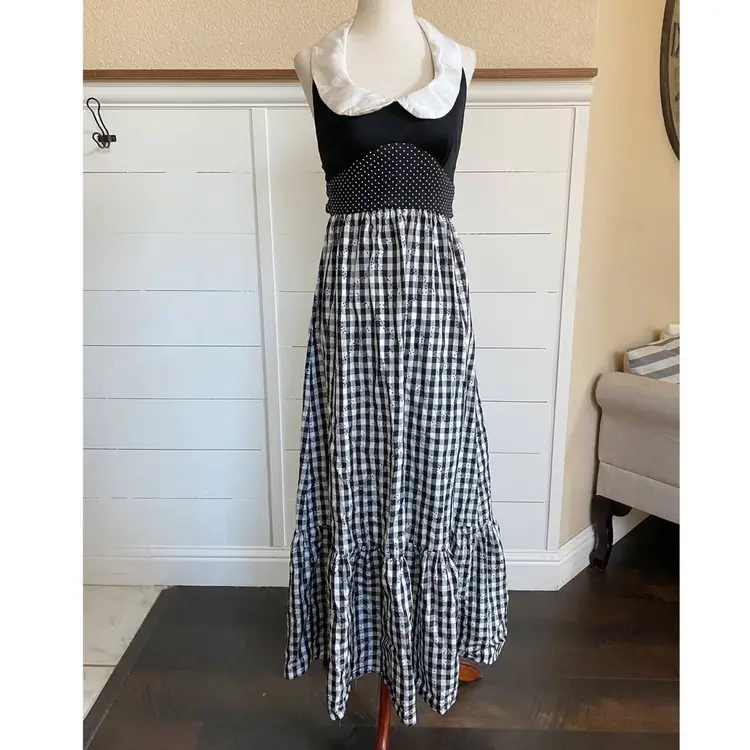 Vintage retro gingham dress from the 1960s Sleeveless, backless halter maxi dress from Young Edwardian Arpeja Black tank top silhouette with white peter pan collar that attaches at nape of neck with button and hook eye closure. Halter back with elastic, Has zipper with hook eye closure to secure back Attached ribbon sash around the waist black with white micro polka dots Long white and black tiered gingham skirt, flowy and lightweight, Unlined Embossed dainty flower accents throughout skirt Materials: acetate, zipper Care Instructions: Dry clean, use cool iron or steam for touch ups. Size 7 Women's US From label Young Edwardian by Arpeja, circa 1960s. Some fraying around edges of brand tag Measurements taken flat: Pit to Pit: 13.5" Flat Waist: 12.5" Length: 53.5" Sleeveless/halter Black and White Check White Peter Pan Collar Vintage Apparel Excellent pre-owned condition, no holes, stains or flaws Please see all photos and measurements to ensure proper fit.