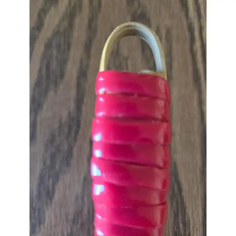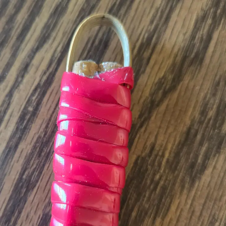 The handle is laced with plastic lacing (boondoggle) and had come loose. I repaired it with a spot of hot glue. See the picture to see how the lace is glued on the back of the handle.